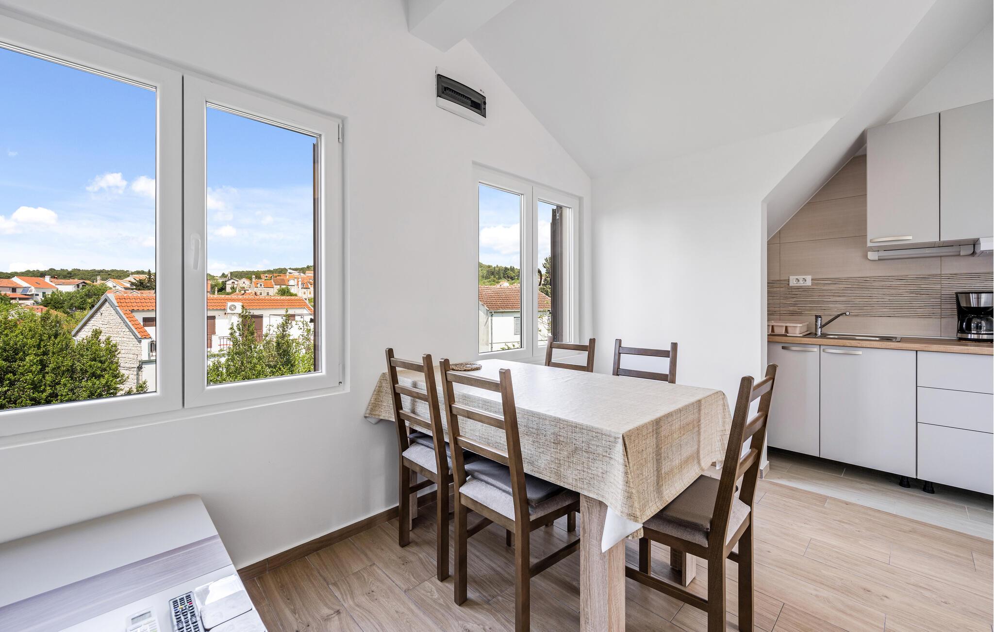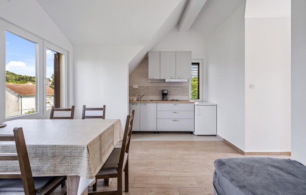 In dieser kleinen, aber feinen Ferienwohnung auf der autofreien Insel Zlarin empfängt Sie ein behaglicher, lichtdurchfluteter Innenbereich. Die helle und funktionale Küche bietet alles, was Sie für die Zubereitung köstlicher Mahlzeiten benötigen, die Sie mit Blick ins Grüne genießen können. Lassen Sie den erlebnisreichen Urlaubstag auf dem gemütlichen Sofa ausklingen und schmieden Sie bei einem Glas Wein Pläne für den nächsten Tag.