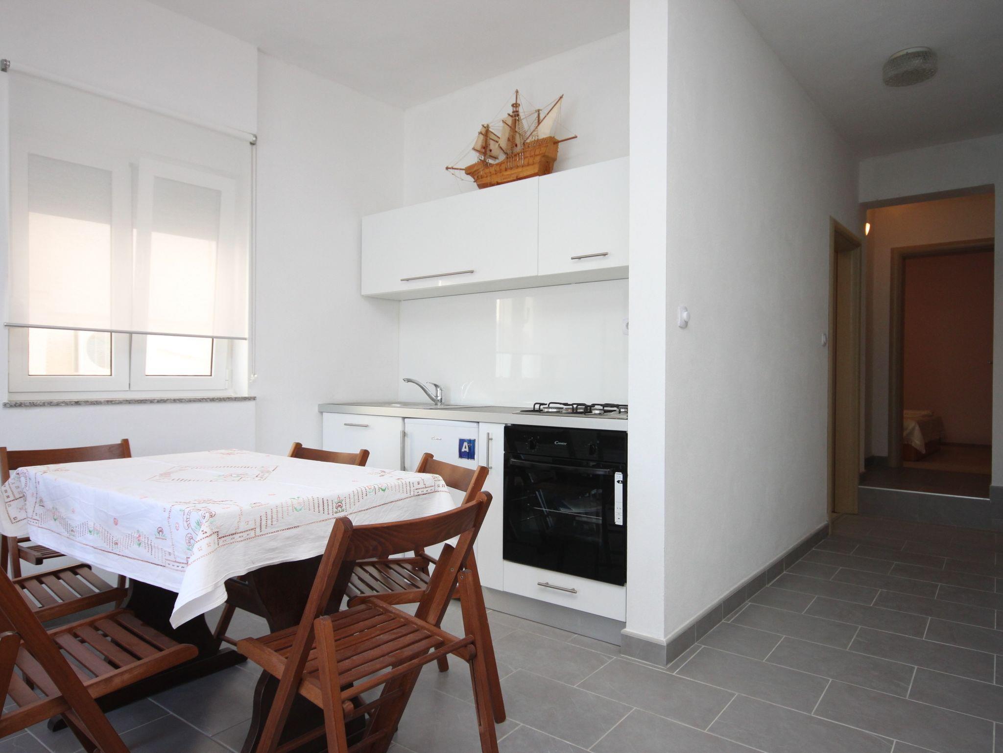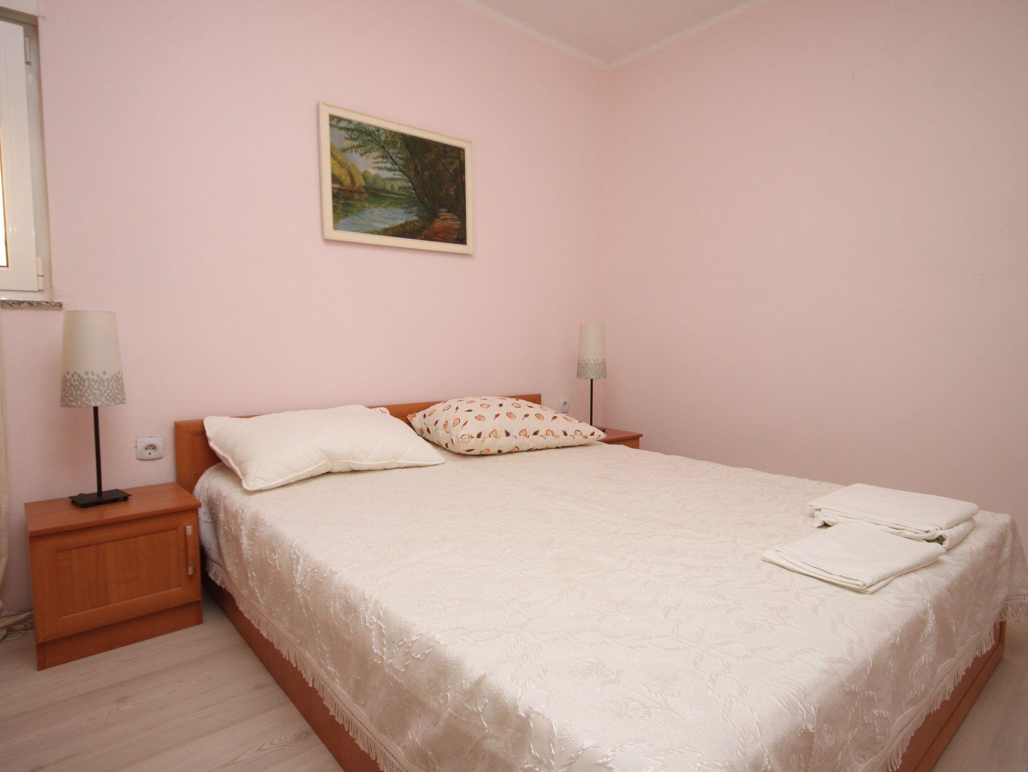 Ferienwohnung bietet Platz für 5 Gäste. Die Betten sind in Schlafzimmern, die es 2 gibt, und in Wohnzimmer, innerhalb einer Gesamtfläche von 44m2, angeordnet. Die Gäste haben eine eigene Terrasse zur Verfügung, auf der sie in warmen Sommernächten genießen können. Das Apartment bietet Meerblick. Es ist erlaubt, Speisen auf dem Gemeinschafts-Grill vorzubereiten. In der Unterkunftseinheit besteht die Möglichkeit des Mitbringens von Haustieren gegen Aufpreis. IM PREIS INBEGRIFFEN: Kurtaxe, Endreinigung, Klimatisierung, Parkplatz, Internet. VERBINDLICHE ZUSÄTZLICHE KOSTEN: Aufzahlung für Kurzaufenthalte (prozentualer Zuschlag pro Nächtigungsanzahl: 30% - 1, 20% - 2, 10% - 3). UNVERBINDLICHE ZUSÄTZLICHE KOSTEN: Wäschewaschen (10,00 € Waschen), Haustiere (5,00 € pro Nacht). Die Verfügbarkeit zusätzlicher Dienstleistungen in Ihrem reservierten Termin und die Preise derselben (falls nicht aufgeführt) müssen im Voraus überprüft werden. Zusätzliche Dienstleistungen die in der Zahlungsaufforderung nicht aufgeführt sind werden direkt beim Vermieter bezahlt, angenommen der Gast nutzt auch diese. Ermäßigung auf den Grundpreis: Gratistag 21=19 (bei einem Aufenthalt von 21 Tagen oder mehr erhalten Sie 2 Gratistage für den Aufenthalt bis 31.12.26).