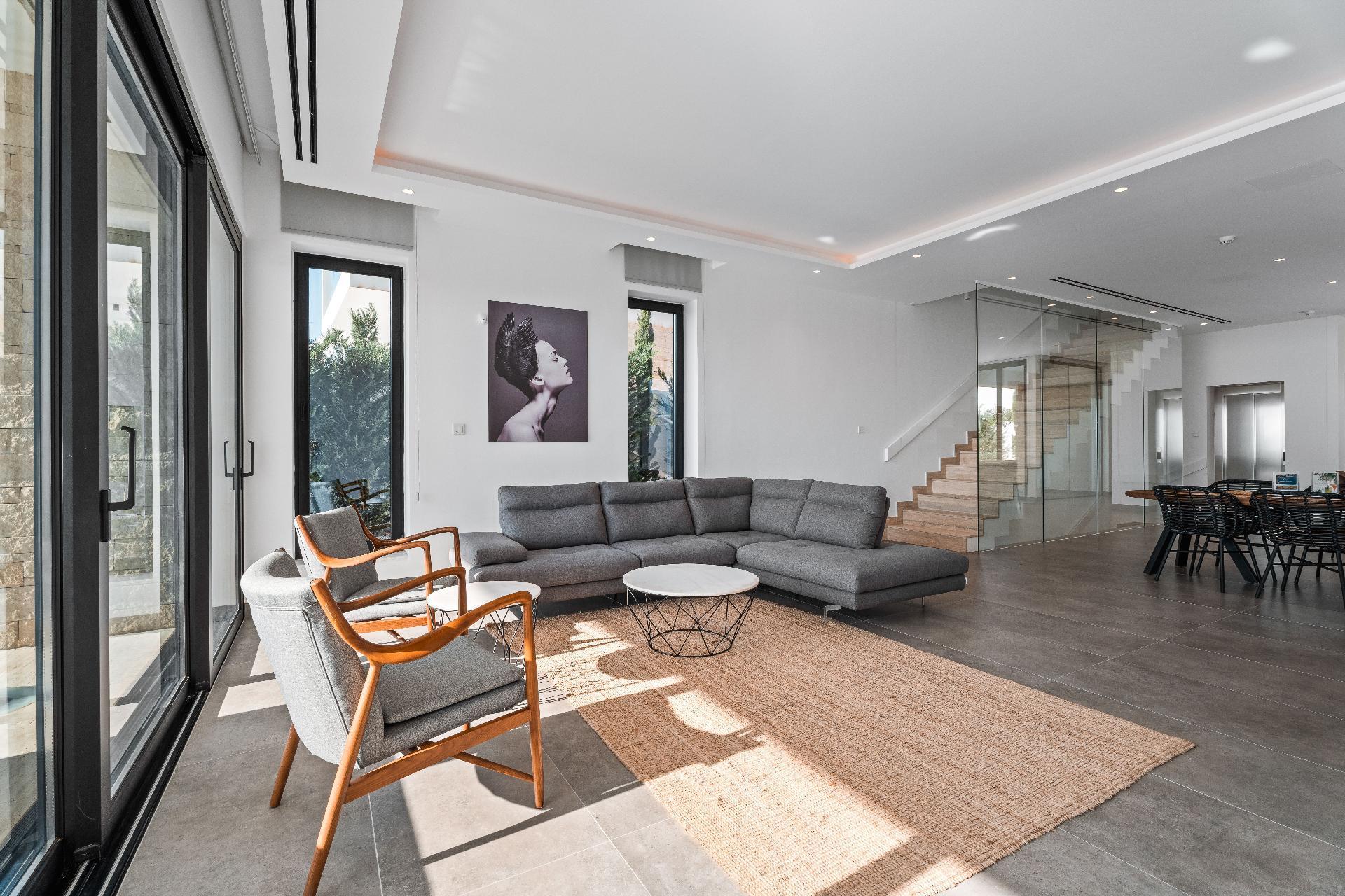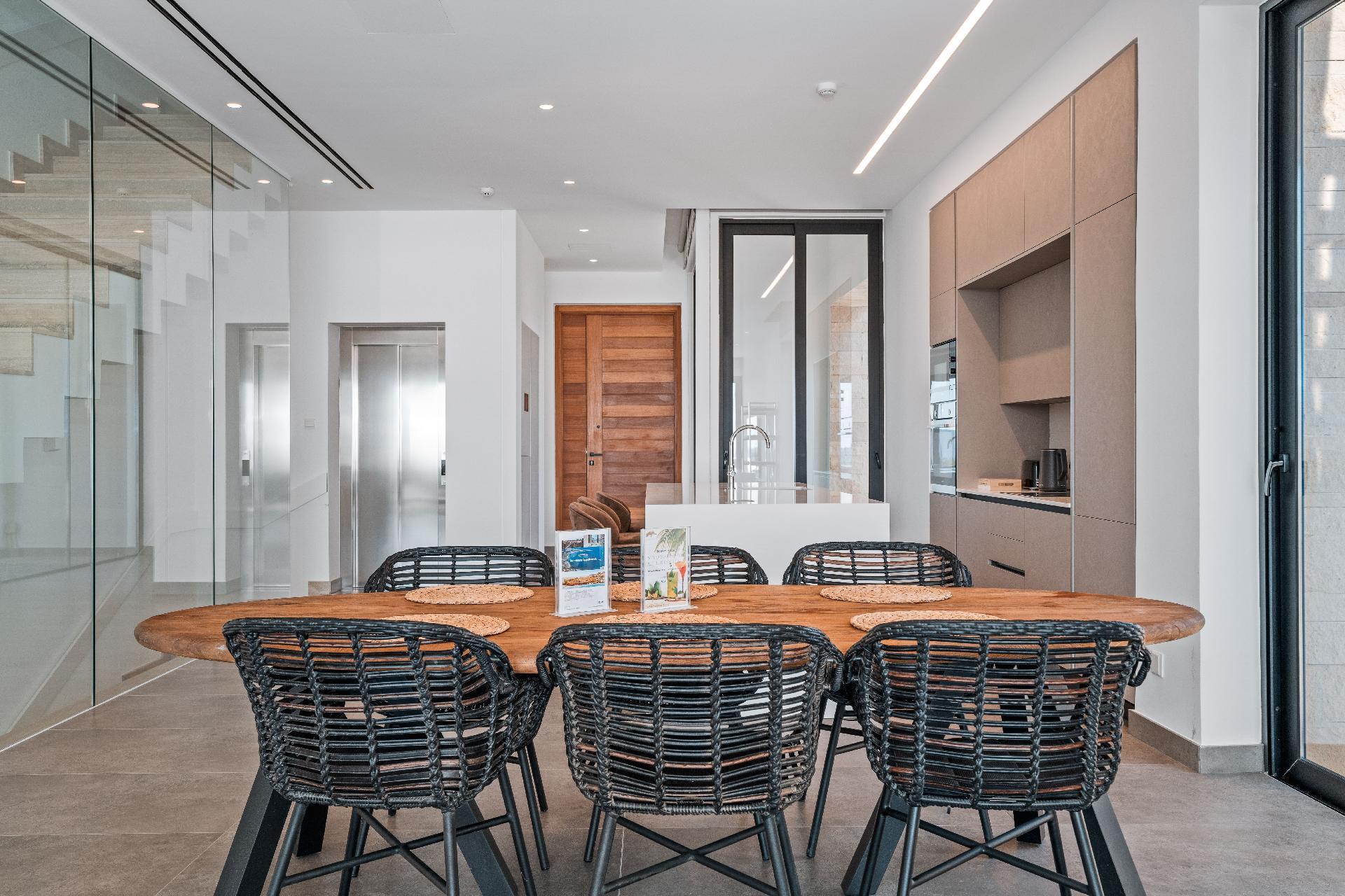 The interior of this fully air-conditioned villa is a testament to contemporary luxury, offering an open-plan kitchen and seamless integration of smart home automation for lighting, blinds, and climate control. Each bedroom is an en-suite equipped with smart TVs, ensuring privacy and convenience. The living and dining areas boast a meticulous design that opens up to outdoor patios, allowing the serene Mediterranean breeze to enhance your living experience. Every floor, from the private underground garage with VIP tunnel access to the upper stories housing the main bedrooms, is connected by an elevator, ensuring effortless movement throughout the villa.