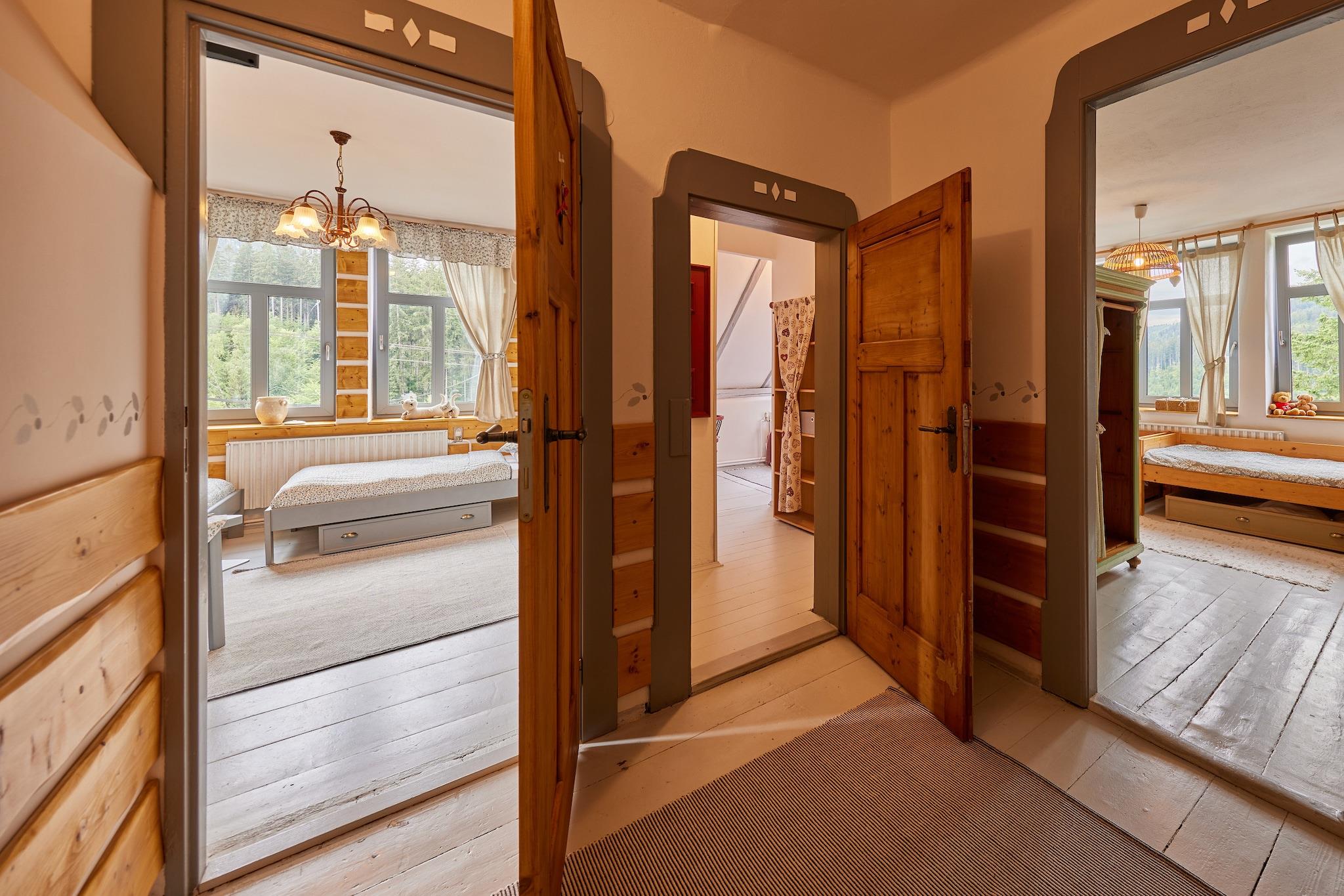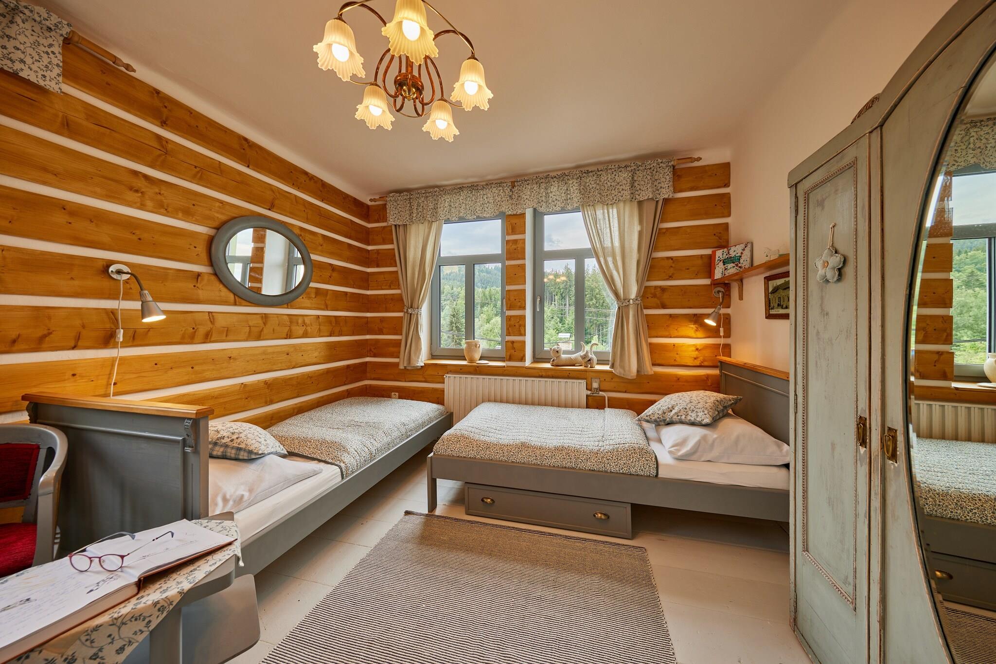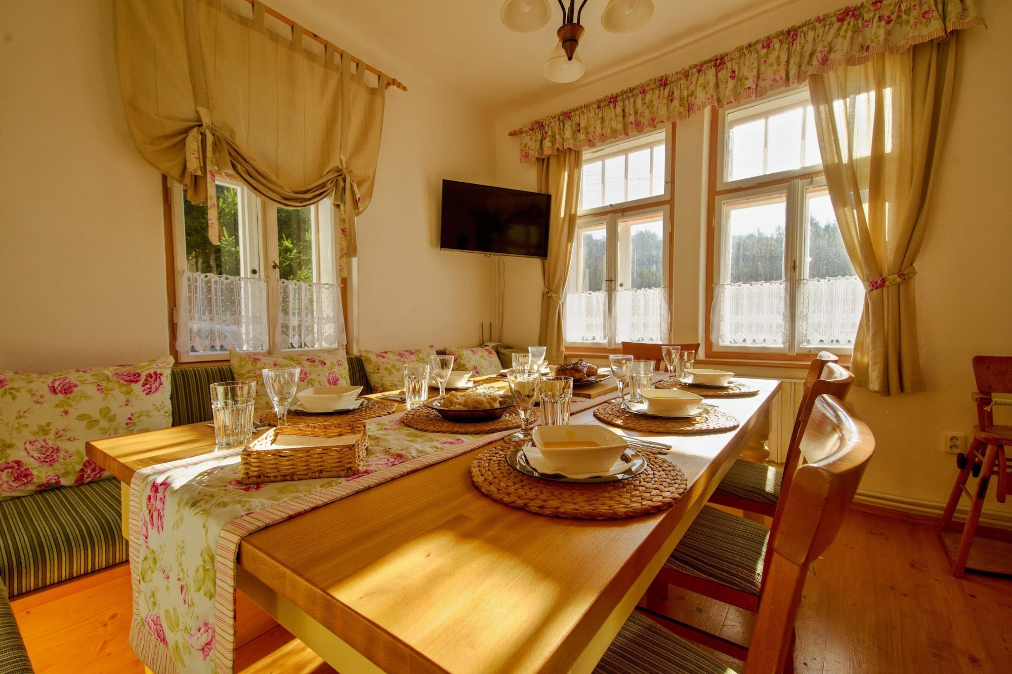 This charming villa offers a cozy and inviting atmosphere, ideal for families or groups of up to 10 guests. It features spacious bedrooms, including two double beds, four single beds, and a bunk bed, providing ample space for everyone. The property is pet-friendly, allowing you to bring your furry friends along to enjoy the stay. With four bathrooms and five toilets, convenience is guaranteed, ensuring a smooth experience for all guests. The villa also boasts a sauna, hot tub, and a beautiful garden, perfect for relaxation after a day of adventures. Nestled in a quiet and picturesque location, the villa offers easy access to various attractions and outdoor activities. Nearby, you’ll find nature reserves with stunning waterfalls, as well as charming towns like Jablonec nad Nisou, known for its historical sites and vibrant water park. For those seeking adventure, several ski resorts are within a short drive, while local cafes and markets offer a taste of the region’s culture and flavors. The villa is equipped with modern amenities to ensure a comfortable stay. The fully furnished kitchen includes essential appliances such as a refrigerator, microwave, and oven, allowing you to prepare your own meals. A dishwasher is also available for easy cleanup. Additional conveniences include a washing machine and dryer, ensuring that you can take care of laundry with ease during your stay.