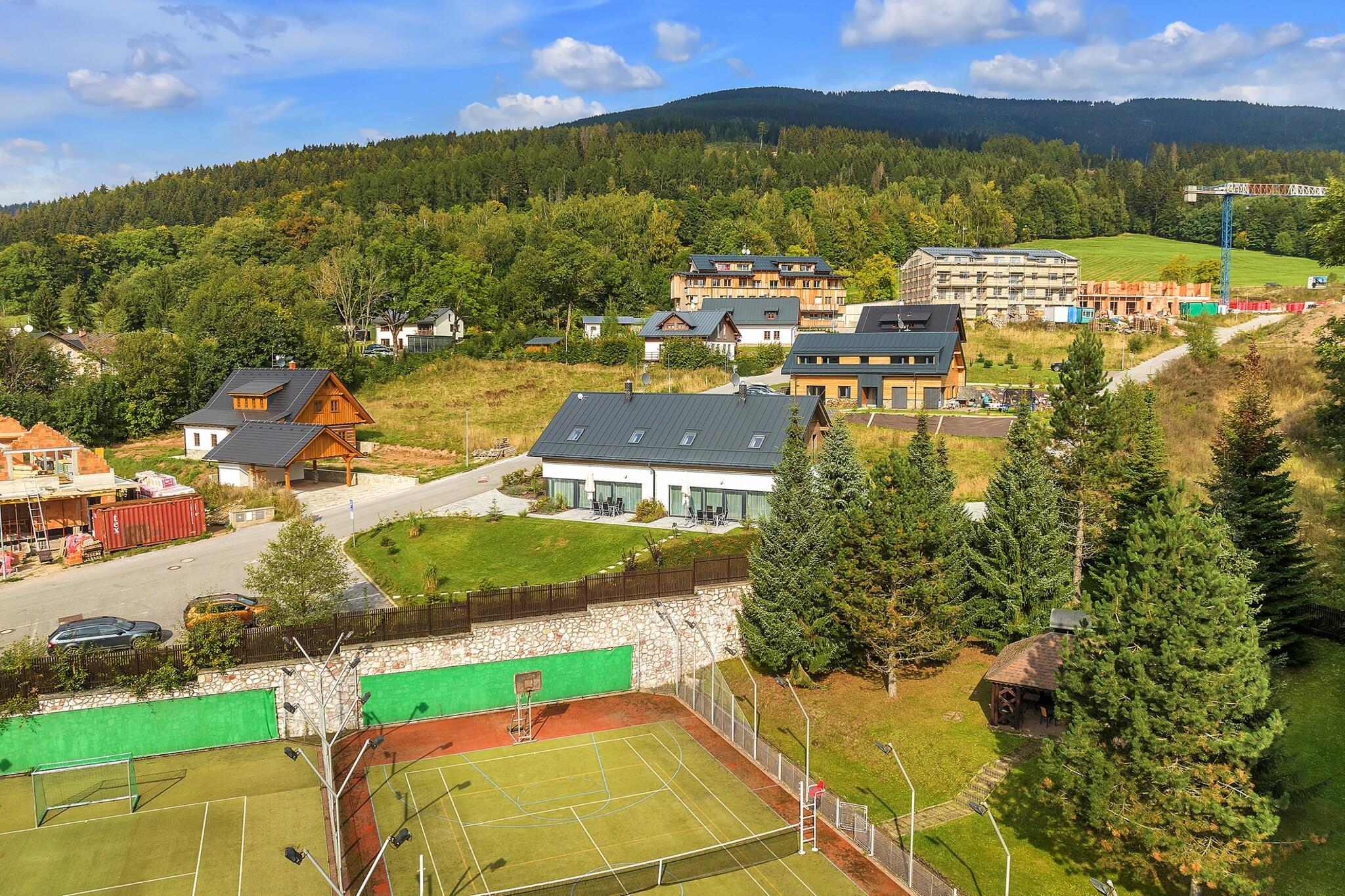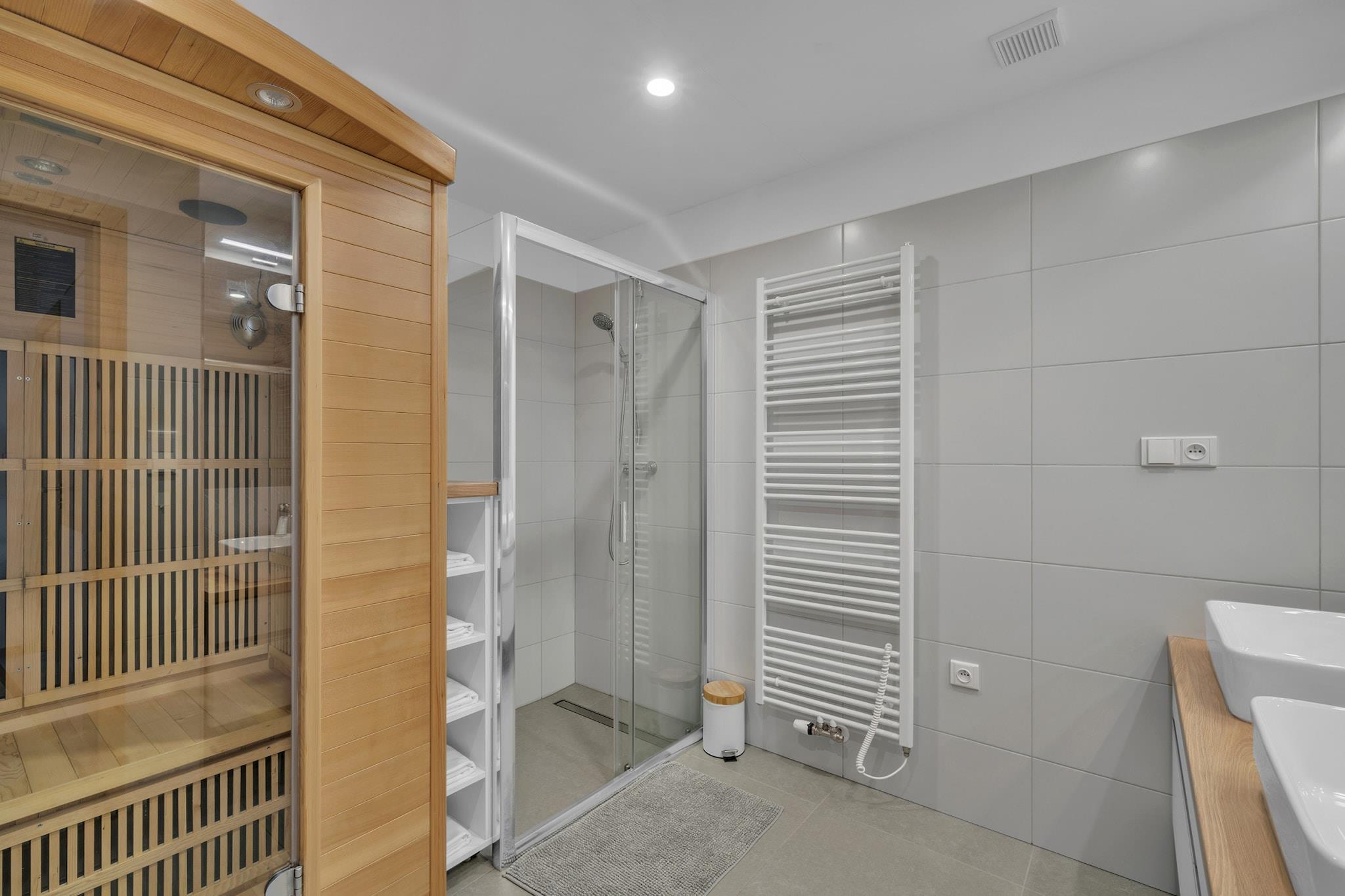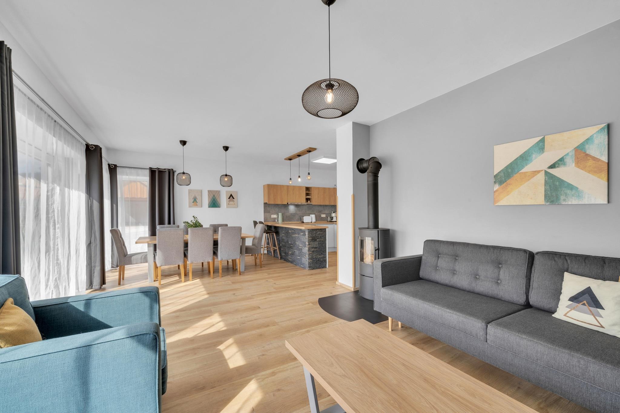 This beautiful modern villa is the ideal getaway for groups of up to 16 people, offering stunning views of the surrounding forests and located near popular ski areas. With ample space inside, everyone can relax and enjoy the comfort of the villa. Whether unwinding in the sauna or enjoying the fresh air in the garden, this villa is perfect for relaxation and adventure. The location offers many opportunities for exploration. Nearby villages, beautiful walking trails, and outdoor activities await. Ski resorts are just a short distance away, with slopes perfect for skiing and snowboarding. In the summer, hiking and mountain biking trails await, along with golf courses nearby. This villa is the ultimate destination for year-round relaxation and adventure. The villa features 6 spacious bedrooms and generous living areas, including a cozy living room with a sofa bed. There are plenty of bathrooms with showers, as well as multiple toilets for convenience. The well-equipped kitchen, perfect for preparing large meals, includes a fridge, freezer, oven, microwave, dishwasher, and all necessary kitchen utensils. Enjoy meals on the barbecue or sip tea and coffee while taking in the views from the terrace.