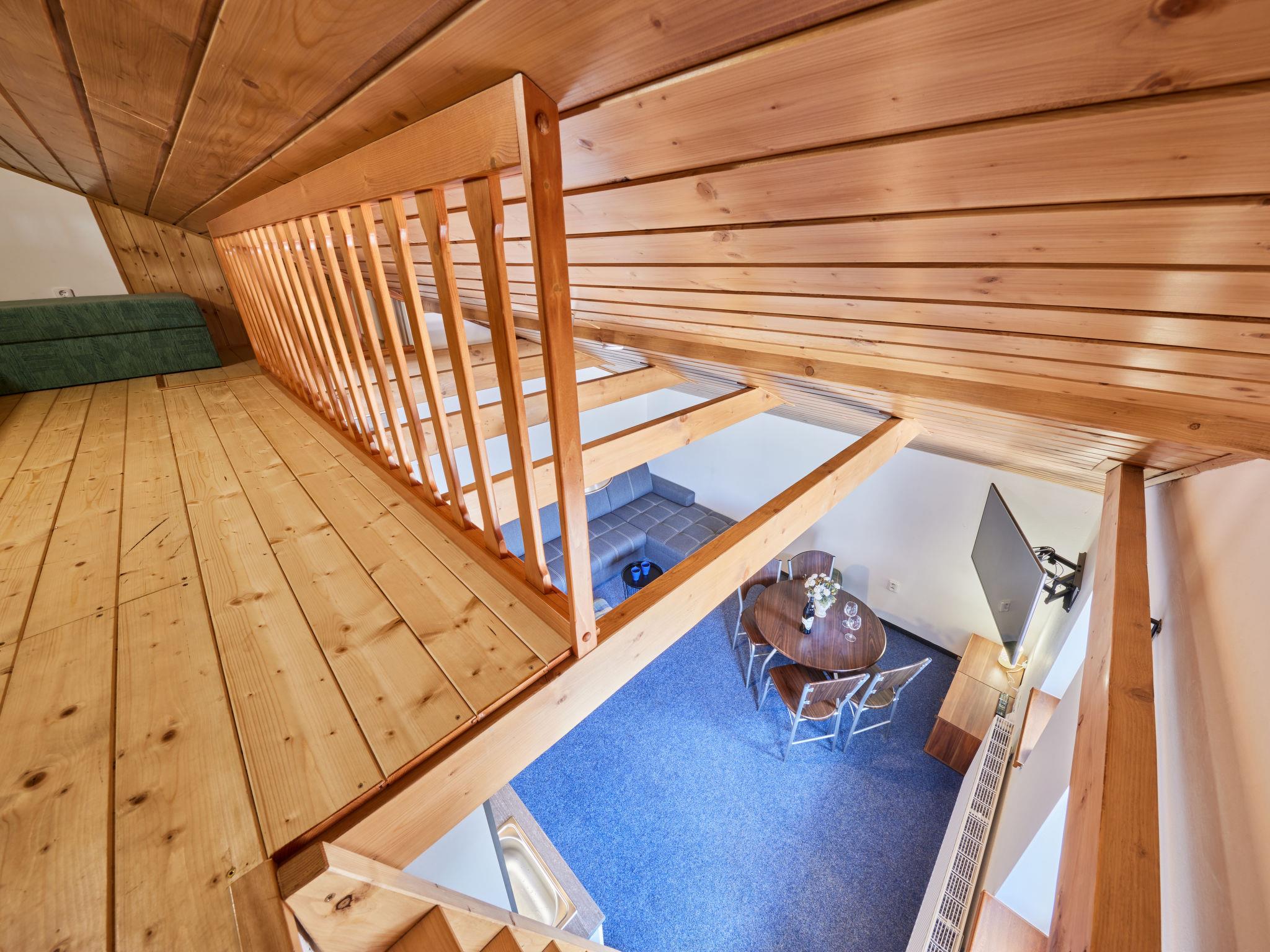 11-room house on 2 levels. 1 room with 1 sofabed, 1 double bed, shower/WC and satellite TV. 2 rooms, each room with 1 double bed, shower/WC and satellite TV. Dining room with dining table and satellite TV. Living room with 1 double sofabed, dining table, kitchen corner, shower/WC and satellite TV. 1 room with 1 double bed. Kitchenette (dishwasher, 4 ceramic glass hob hotplates, kettle, freezer). Upper floor: 1 room with 1 double bed, kitchen corner, shower/WC and satellite TV. 1 room with 2 beds. 1 room with 1 double bed, kitchen corner, shower/WC and satellite TV. Exit to the balcony. 1 room with 2 beds. Living room with 1 double sofabed, dining table, kitchen corner, bath/shower/WC and satellite TV. 1 room with 1 double bed. Gallery with 3 sleeping facilities. Balcony. Terrace furniture. Facilities: Internet (WiFi, free). Please note: suitable for families. Non-smoking house. Maximum 1 small pet/ dog allowed. Instead of an enclosed bedroom, some sleeping areas are located in an open-plan area (gallery, alcove, etc.).