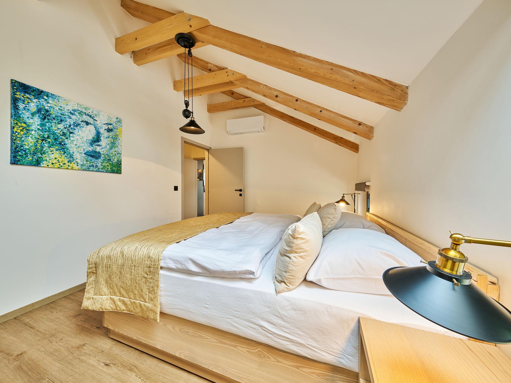 "Luxury Mountain Attic with AC & Netflix", 2-room apartment on the top floor. Very beautiful and stylish furnishings: living/dining room with 1 double sofabed, dining table and TV. 1 room with 1 double bed. Kitchenette (dishwasher, 4 ceramic glass hob hotplates, toaster, kettle, microwave, freezer, electric coffee machine). Shower/WC. Air-conditioning. Box-room. Facilities: washing machine, safe, iron, children's high chair, baby cot, hair dryer. Internet (WiFi, free). Parking at the house. Suitable for families.