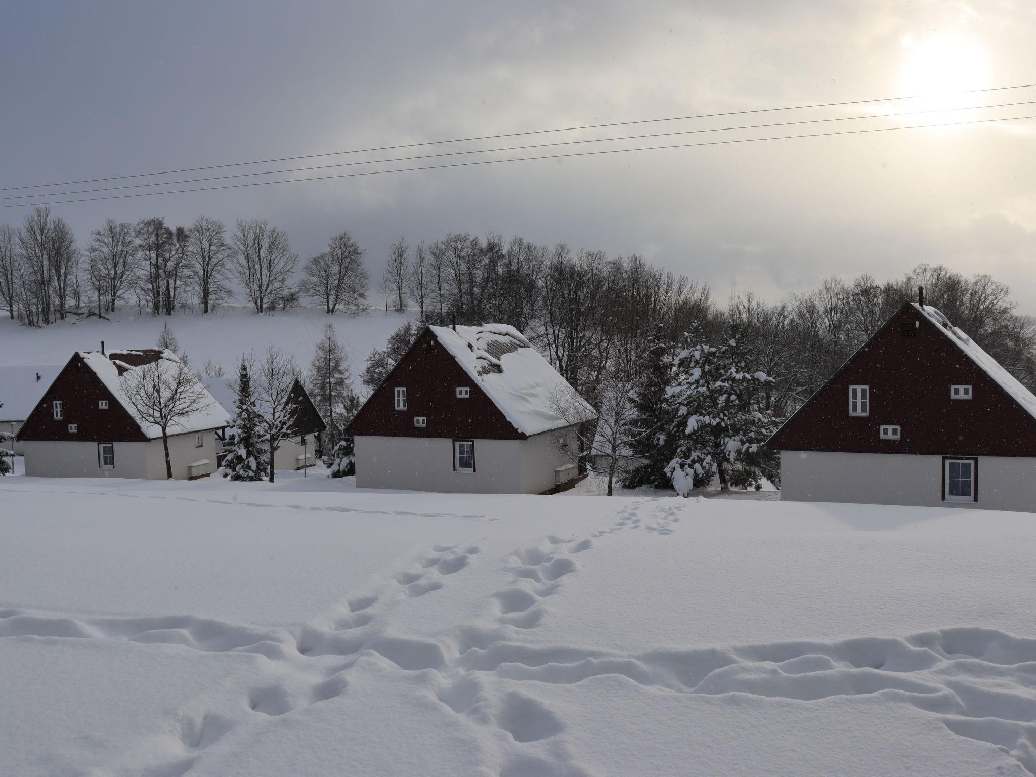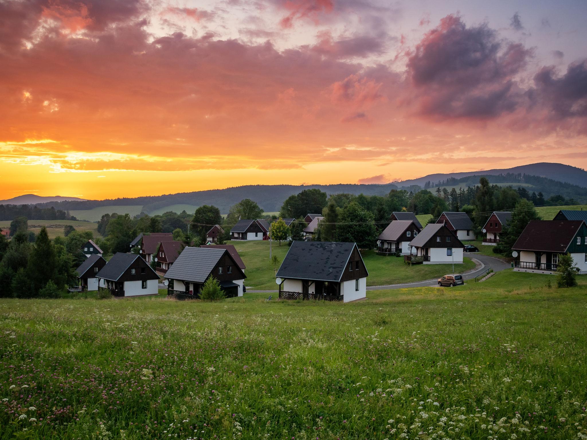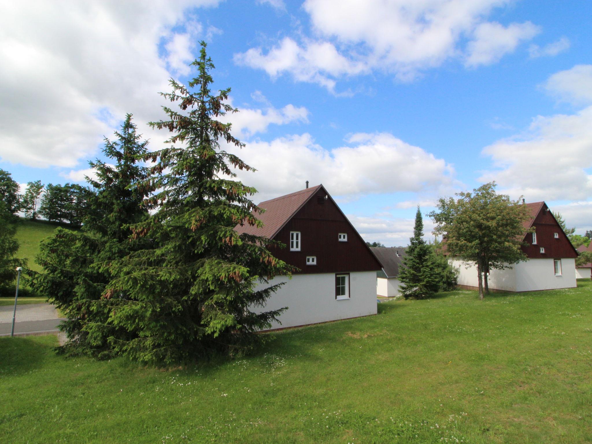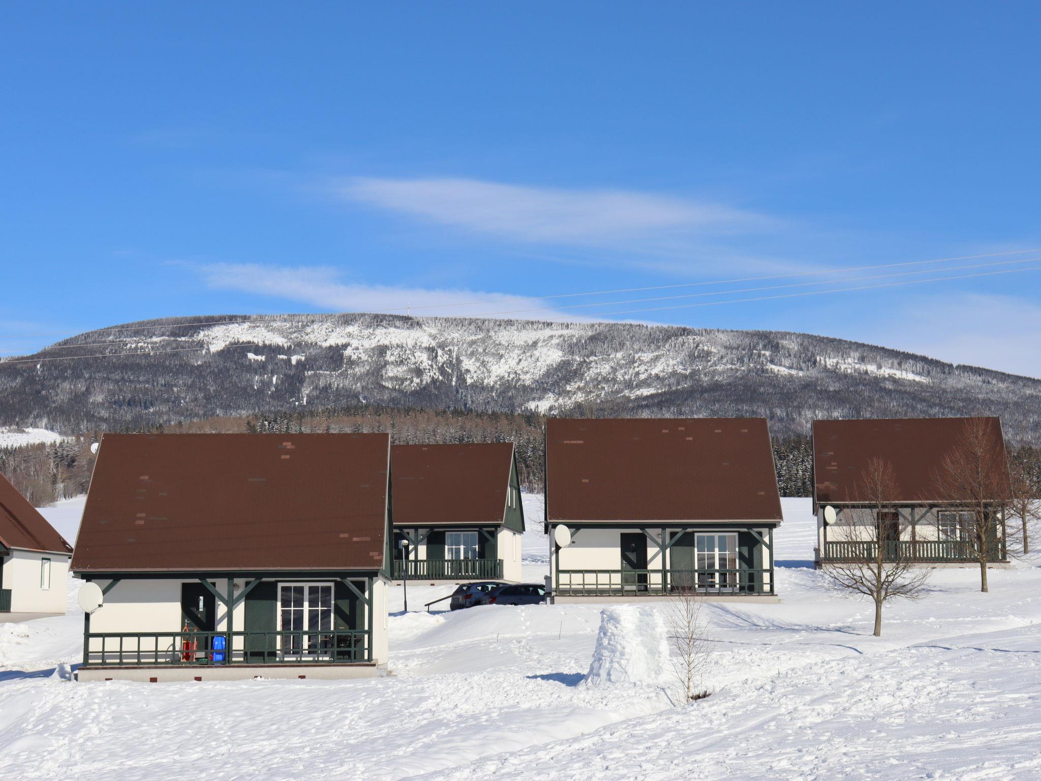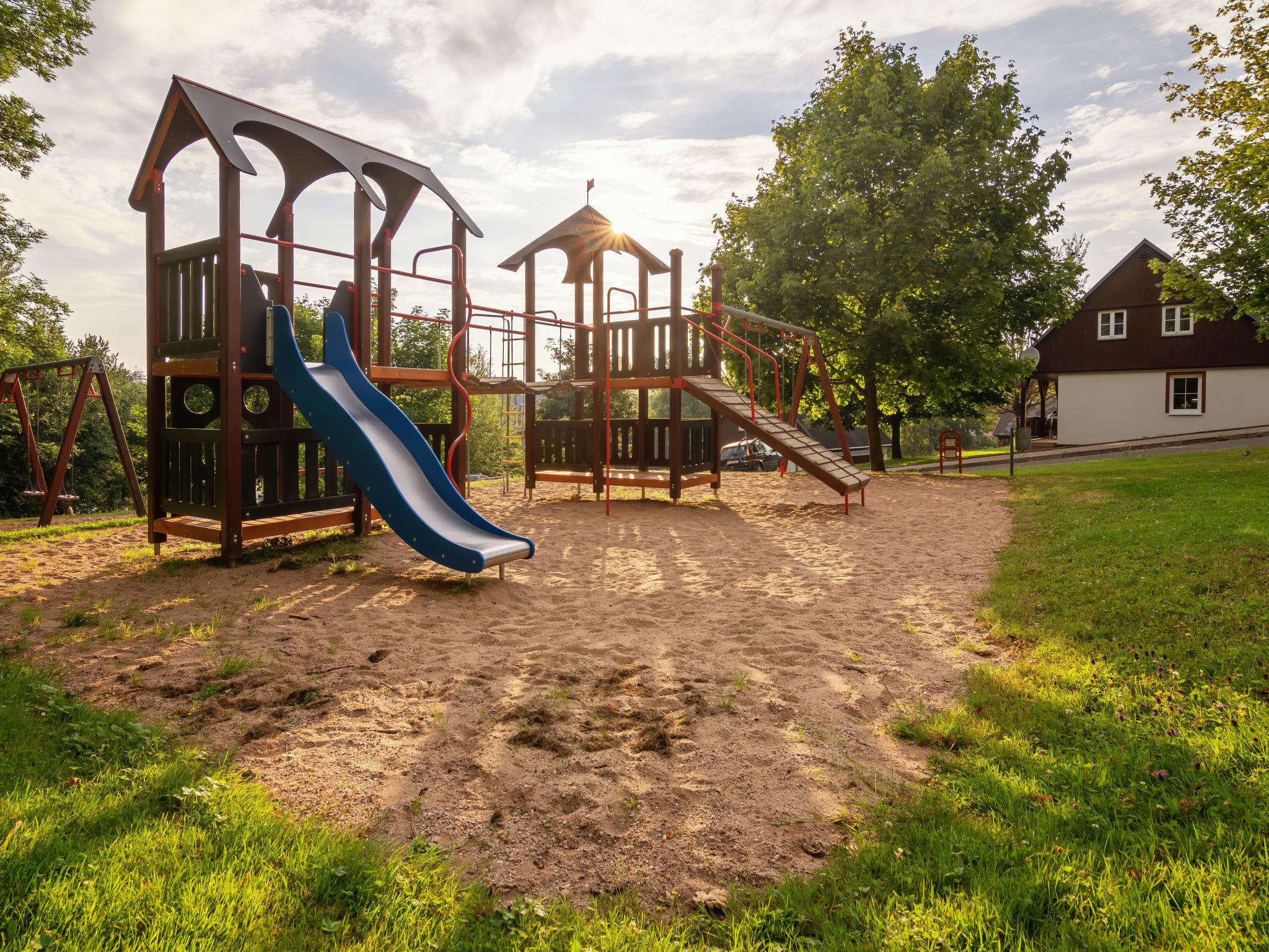 Cistá v Krkonoších 2 km from Cerný Dul: Child friendly, beautiful, comfortable holiday village "Happy Hill", 500 m a.s.l., surrounded by trees and meadows. 43 houses in the resort. On the outskirts, in a secluded, quiet, sunny position, 1.5 km from the lake, 3 km from the skiing area, in the countryside. For shared use: property 6 ha, meadow, swimming pool heated (9 x 4 m, depth 120 cm, seasonal availability: 15.May. - 30.Sep. pool opening hours: 09:00-20:00). Shower/WC in the pool area, table tennis, children's playground (swing, sandbox). In the complex: reception, central heating system. Parking (for 2 cars) at the house. Shop 2.5 km, grocery 2.5 km, supermarket 7.5 km, restaurant 1.6 km, pub garden 400 m, bus stop "Cerný Dul, Cistá-pošta" 400 m, grass beach 1.5 km (small), indoor swimming pool 19 km. Golf course (18 hole) 14 km, tennis 2.5 km, sports centre 2.5 km, walking paths from the house 100 m, cycle lane 100 m, ski lift 3 km, chair lift 3 km, slopes 3 km, ski school 3 km, children's ski school 3 km, sled run 7 km, cross country ski track 100 m. Nearby attractions: Janské Lázne Spa 9 km, Vrchlabí 10 km, Aquapark Trutnov 25 km, Zoo Safari Dvur Králové 29 km, Bozkovské jeskyne 37 km, Adršpašské skály 44 km. Well-known ski regions can easily be reached: Cerný Dul 3 km, Herlíkovice 15 km, Pec pod Snežkou 22 km. Well-known lakes can easily be reached: Cistá 1.5 km, Vrchlabí 9 km. Hiking paths: Snežka 25 km. Please note: the photograph shows a typical example.