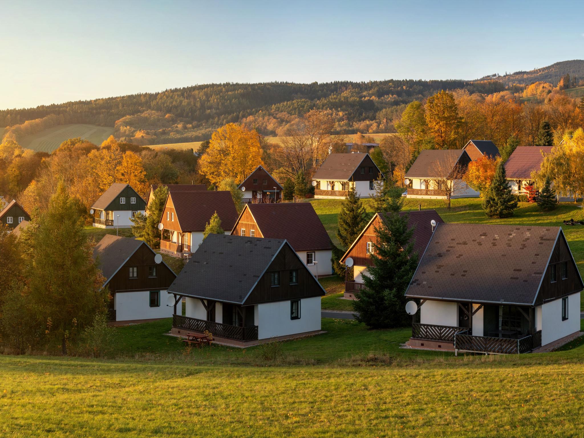 Cistá v Krkonoších 2 km from Cerný Dul: Child friendly, beautiful, comfortable holiday village "Holiday Hill 26", 500 m a.s.l., surrounded by trees and meadows. 43 houses in the resort. On the outskirts, in a secluded, quiet, sunny position, 1.5 km from the lake, 3 km from the skiing area, in the countryside. For shared use: property 6 ha, meadow, swimming pool heated (9 x 4 m, depth 120 cm, seasonal availability: 15.May. - 30.Sep. pool opening hours: 09:00-20:00). Shower/WC in the pool area, table tennis, children's playground (swing, sandbox). Private: terrace, garden furniture, barbecue. In the complex: reception, storage room for bicycles, storage room for skis, central heating system, ski boot dryer. Parking (for 2 cars) at the house. Shop 2.5 km, grocery 2.5 km, supermarket 7.5 km, restaurant 1.6 km, pub garden 400 m, bus stop "Cerný Dul, Cistá-pošta" 400 m, grass beach 1.5 km (small), indoor swimming pool 19 km. Golf course (18 hole) 14 km, tennis 2.5 km, sports centre 2.5 km, walking paths from the house, cycle lane 100 m, ski lift 3 km, chair lift 3 km, slopes 3 km, ski school 3 km, children's ski school 3 km, sled run 7 km, cross country ski track 100 m. Nearby attractions: Janské Lázne Spa 9 km, Vrchlabí 10 km, Aquapark Trutnov 25 km, Zoo Safari Dvur Králové 29 km, Bozkovské jeskyne 37 km, Adršpašské skály 44 km. Well-known ski regions can easily be reached: Cerný Dul 3 km, Herlíkovice 15 km, Pec pod Snežkou 22 km. Well-known lakes can easily be reached: Cistá 1.5 km, Vrchlabí 9 km. Hiking paths: Snežka 25 km.