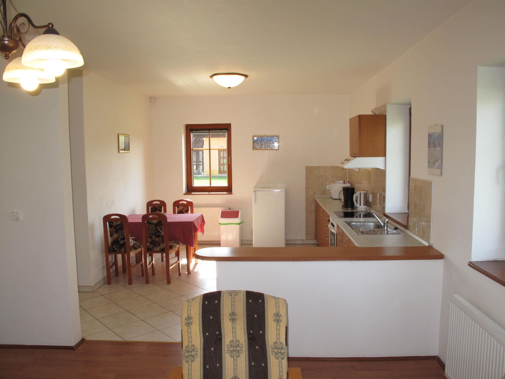 2-room apartment 60 m2. Very beautiful and modern furnishings: living/sleeping room with 2 beds and 1 double sofabed (140 cm), satellite TV. 1 double bedroom. Kitchen (2 hot plates, oven, kettle, microwave, freezer). Bath/WC. Gas heating. Box-room. Beautiful view of the countryside. Facilities: baby cot for up to 6 year olds. Internet (WiFi, free). Suitable for families. Maximum 2 pets/ dogs allowed.