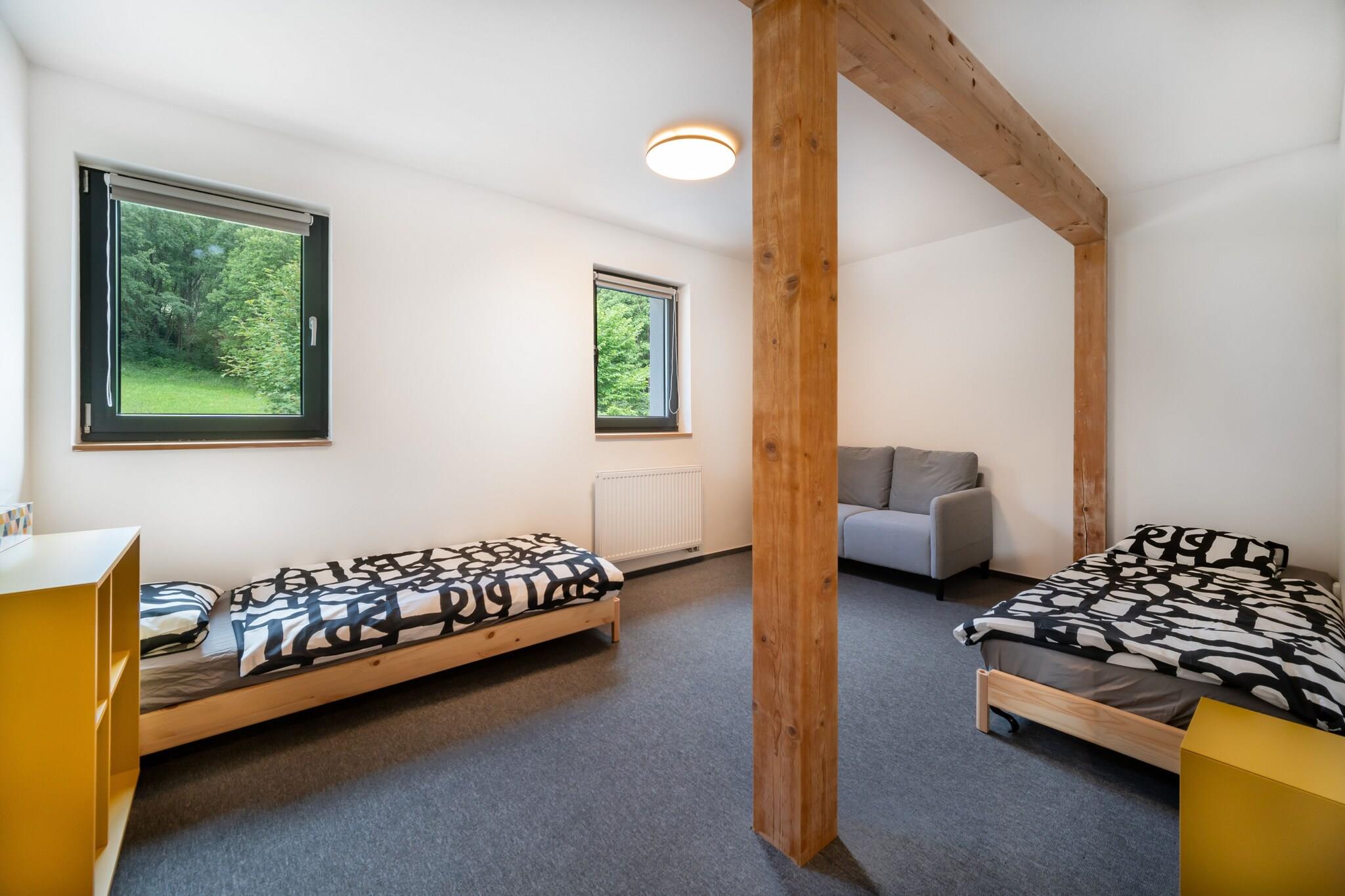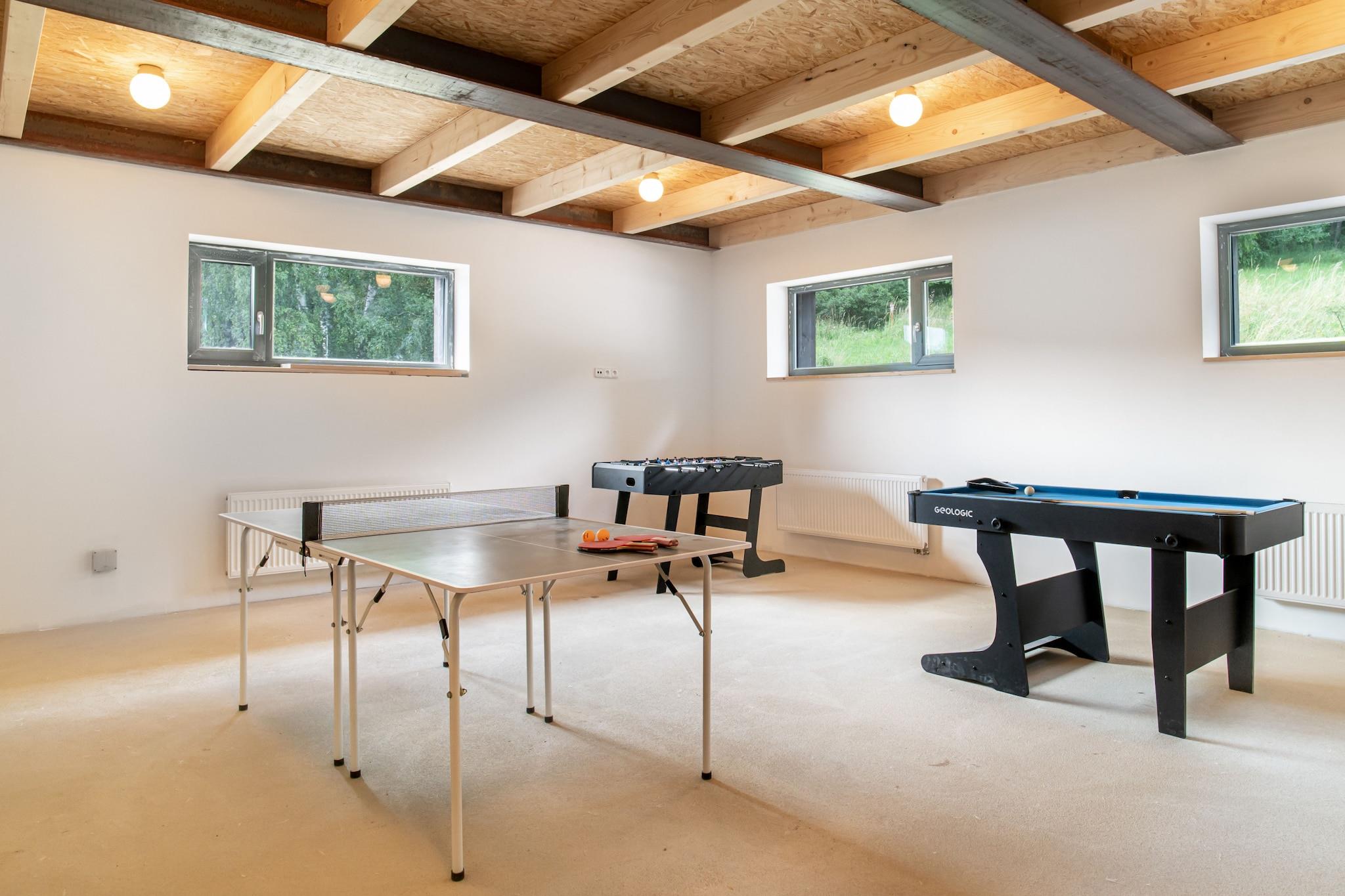 This spacious villa, located in the picturesque Czech Jizera Mountains, is perfect for large groups, offering accommodation for up to 24 people. Recently renovated, the villa is situated in Desná, surrounded by beautiful nature, with hiking trails and forests just a short distance away. The house consists of 5 fully equipped apartments, each with its own bathroom and kitchen, ensuring comfort and privacy for all guests. A communal area with a kitchenette and a fireplace is available, making it easy to gather and enjoy cozy moments together. The villa is a haven for children and pets, with a large garden featuring a swing, slide, and play equipment. In the evenings, guests can relax on the terrace, fire up the barbecue, or enjoy a bonfire. For entertainment, there is a playroom with table tennis, billiards, foosball, and PlayStation games. After an active day, unwind in the wellness area with a sauna and jacuzzi, or savor a self-tapped Czech beer from the beer tap (available for a fee). The location offers ample opportunities for outdoor activities year-round. Nearby attractions include the lookout towers of Rozhledna Svetly vrch and Vyhlidka Spicka, as well as natural pools and lakes for swimming. Winter sports enthusiasts can explore several ski resorts within 10 km, including Desná, Detoa, and Harrachov. For cross-country skiing, a private trail runs right beneath the holiday home. The villa's proximity to Tanvald, Harrachov, and Liberec makes it an ideal base for exploring the region.
