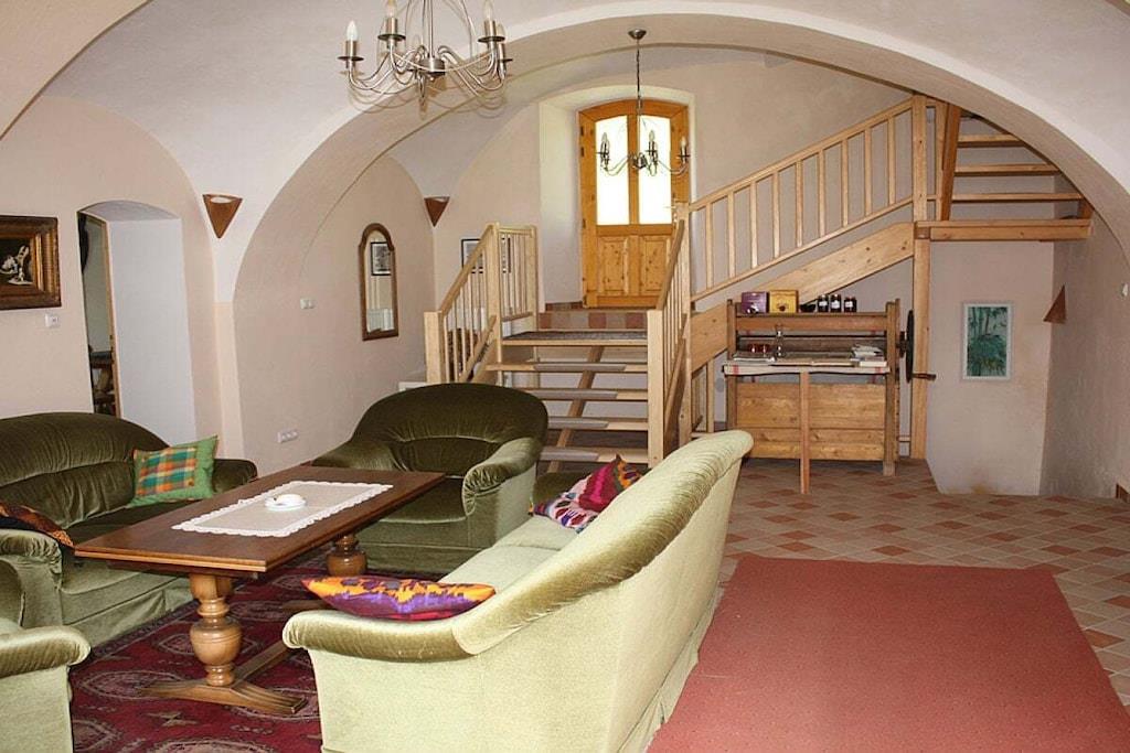 Eine idyllisch, ruhig gelegene, sehr gut ausgestattete Ferien-Studiowohnung mit ca. 100 qm im Nebengebäude einer alten Mühle - um 1800 erbaut, 2002/03 vollkommen neu saniert. Im 1. OG befindet sich das Wohnstudio mit offener Küche, Essplatz und Bett (1,50m) und Du/WC. Im 2.OG ein Schlafraum mit 3 Betten u. Kinderbett. Im EG befindet sich eine gemütlich eingerichtete Wohnhalle mit Kachelofen. Diese ist auch für die zweite Ferienwohnung zugänglich. Seit dem Sommer 2009 wurde das Angebot um einen kleinen Wellnessbereich mit Sauna und Whilrpool erweitert. Hier können Sie Urlaub machen und "die Seele baumeln lassen". Bitte beachten Sie den Belegungskalender der 2. Zwei-Zimmer-Ferienwohnung mit Küche und Dusche/WC - geeignet bis zu 3 Personen.