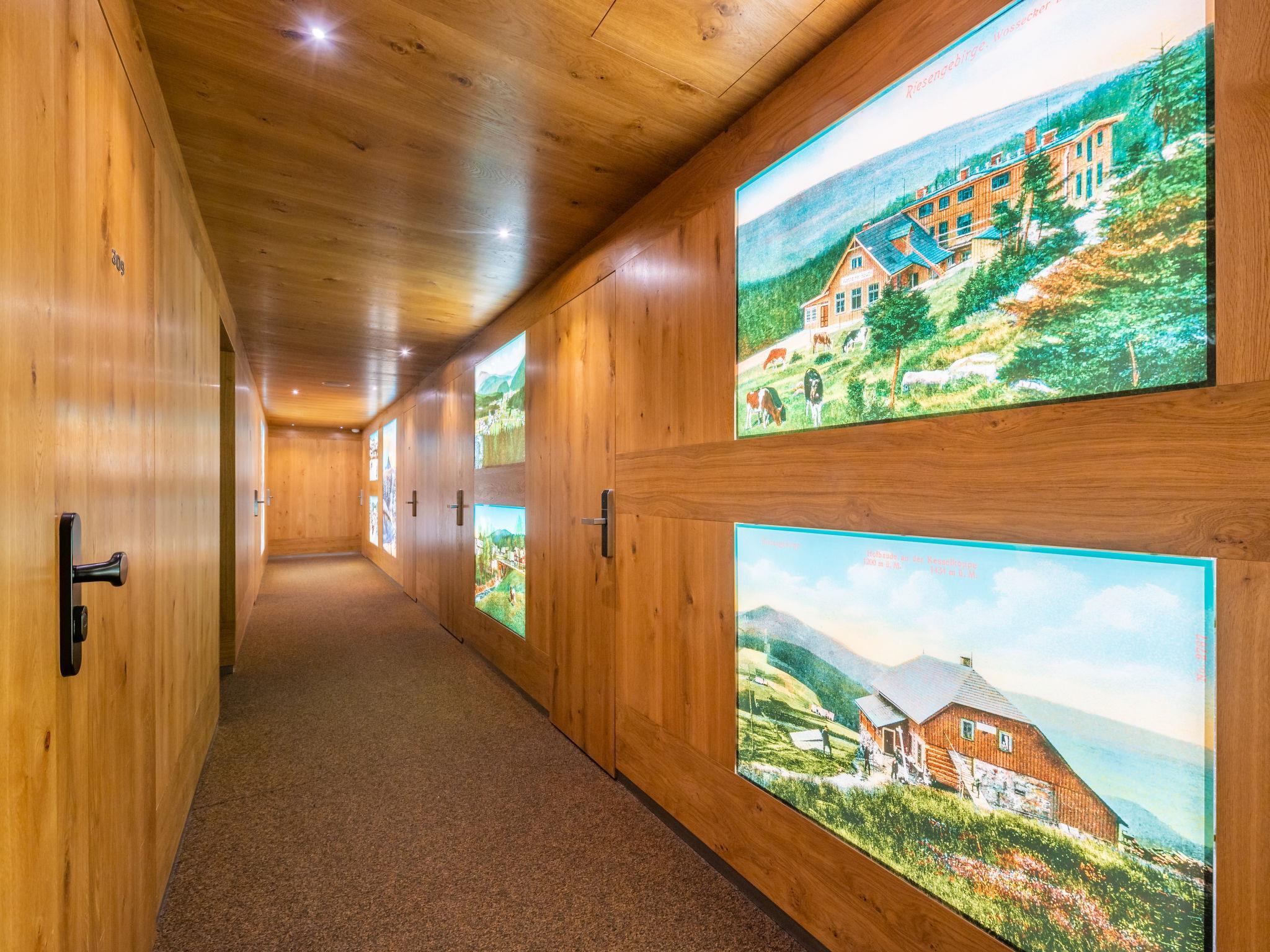 Modern residence, built in 2013. 5 houses in the residence. 500 m from the centre of Harrachov, in a quiet position, 50 m from the edge of the forest, 700 m from the skiing area. For shared use: property 200 m2. Children's playground (slide, swing). In the house: massage (extra). Lift, central heating system. Breakfast on request (extra). Storeroom available. Parking at the house. Shop 1 km, restaurant 400 m, bus stop "Harrachov, Nový Svet, u Motejlku" 500 m, railway station "Harrachov" 2 km, outdoor swimming pool 2 km. Tennis 2 km, indoor tennis centre 2 km, ski lift 50 m, chair lift 700 m, slopes, ski rental 700 m, ski bus stop 50 m, ski school, children's ski school. Nearby attractions: Bobová dráha 300 m, Mumlavský vodopád 2.5 km, Korenov 8 km, Jizerka 15 km, Jablonec nad Nisou 29 km, Termy Cieplickie (PL) 30 km, Liberec 35 km, Ješted 40 km. Well-known ski regions can easily be reached: Certova hora 700 m, Zákoutí 2 km, Rýžovište 3 km, Príchovice 10 km, Rokytnice nad Jizerou 15 km. Hiking paths: Western City Karpacz(Pl) 40 km, Park miniatury Kowary44km,Karpacz (Pl) 39 km, Giganteria Piechowice(Pl) 23 km. The keys‘ handover takes place by the agency Interhome Harrachov. HARRACHOV CARD guest card included in the price.