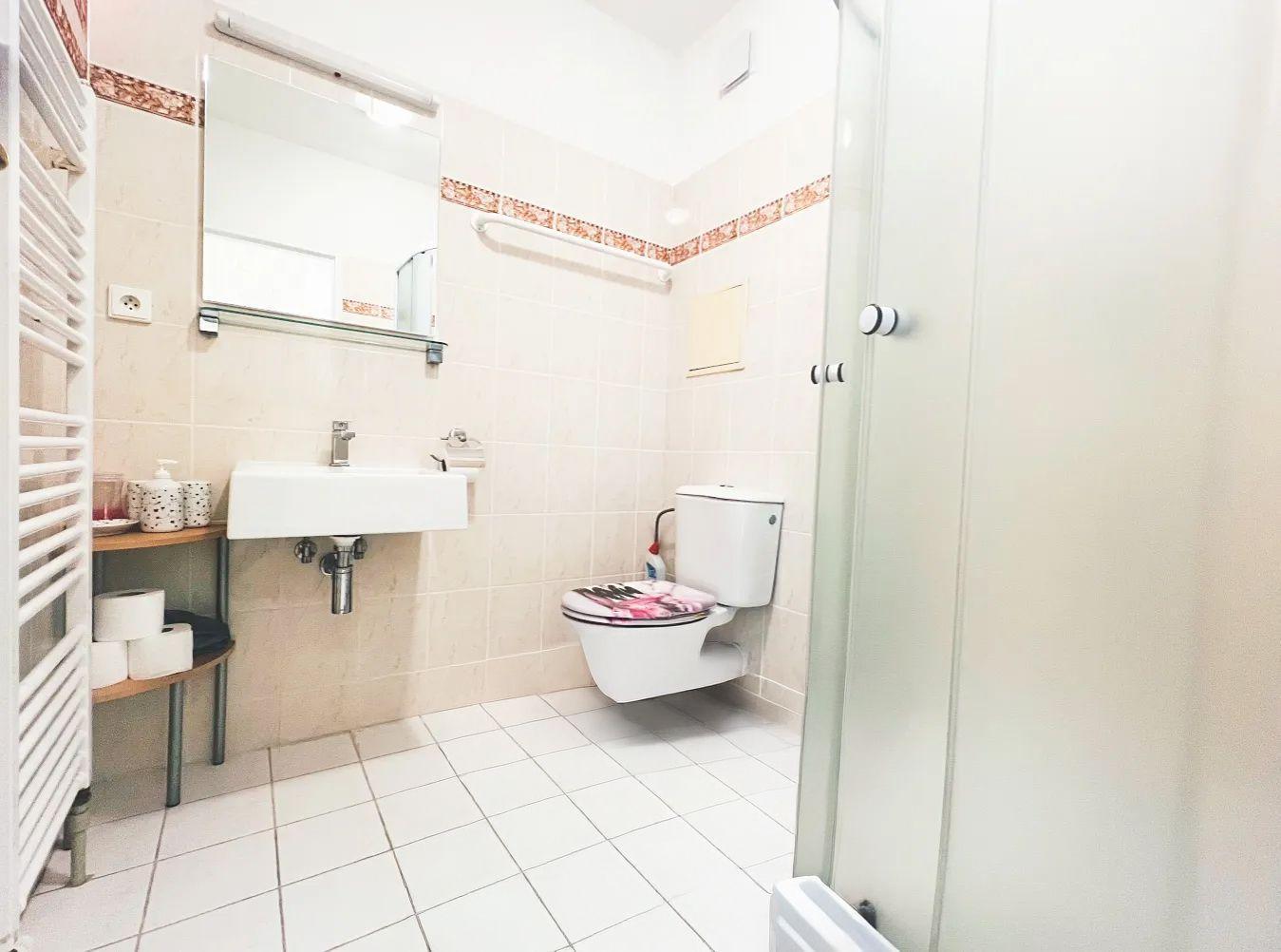 The studio apartment is located on the first floor of a four-story, modern apartment building, recently built in 2000. It offers a spacious living and sleeping area, a separate, fully equipped kitchen, and a bathroom. The living area is furnished with a comfortable sofa, a 200 cm x 200 cm double bed, a satellite TV, a DVD and CD player, a radio, and a wooden dining table with four chairs. A safe is also available for storing your valuables (available for a fee). The sofa converts into another double bed, also measuring 200 cm x 200 cm. Adjacent to the kitchen is a double hotplate, a refrigerator with a freezer compartment, a microwave, a kettle, a toaster, and a coffee maker. The bathroom features a modern shower cubicle, a vanity with a wall mirror, a hairdryer, and a toilet. A vacuum cleaner is available, and plenty of bed linen and towels are provided.