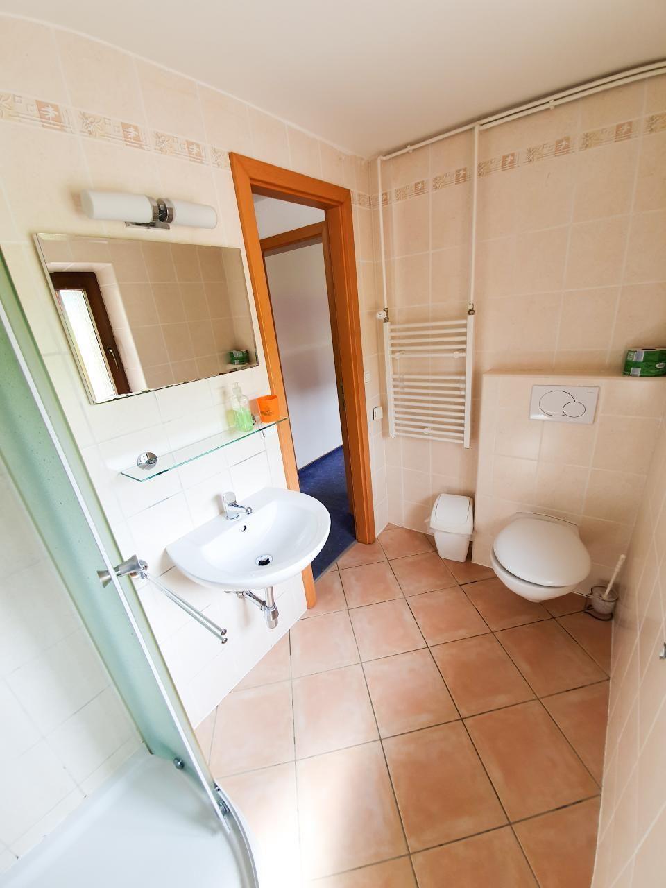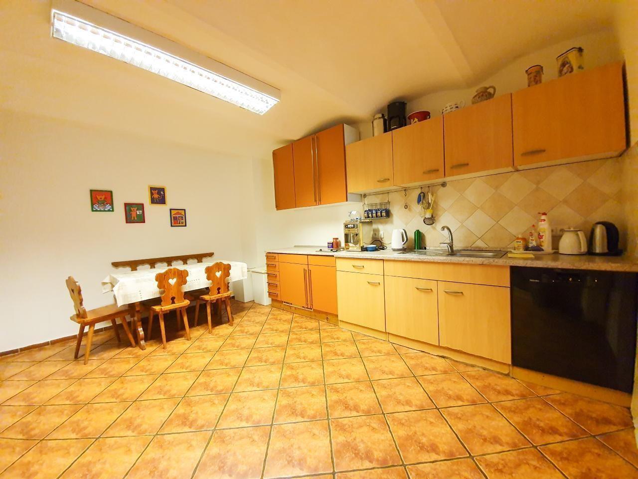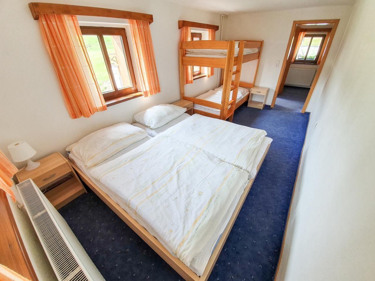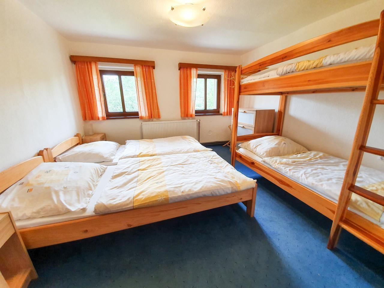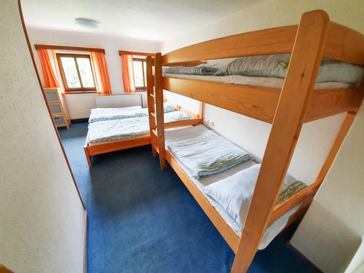 On the ground floor there is a lounge with a fireplace and enough tables and chairs for all guests. Next door is a communal kitchen where you can prepare your meals. We do not offer catering. On the first floor there are 6 rooms with a total of 20 beds - double beds and bunk beds. 5 rooms have private bathrooms and toilets, 1 room has its own bathroom in the corridor.