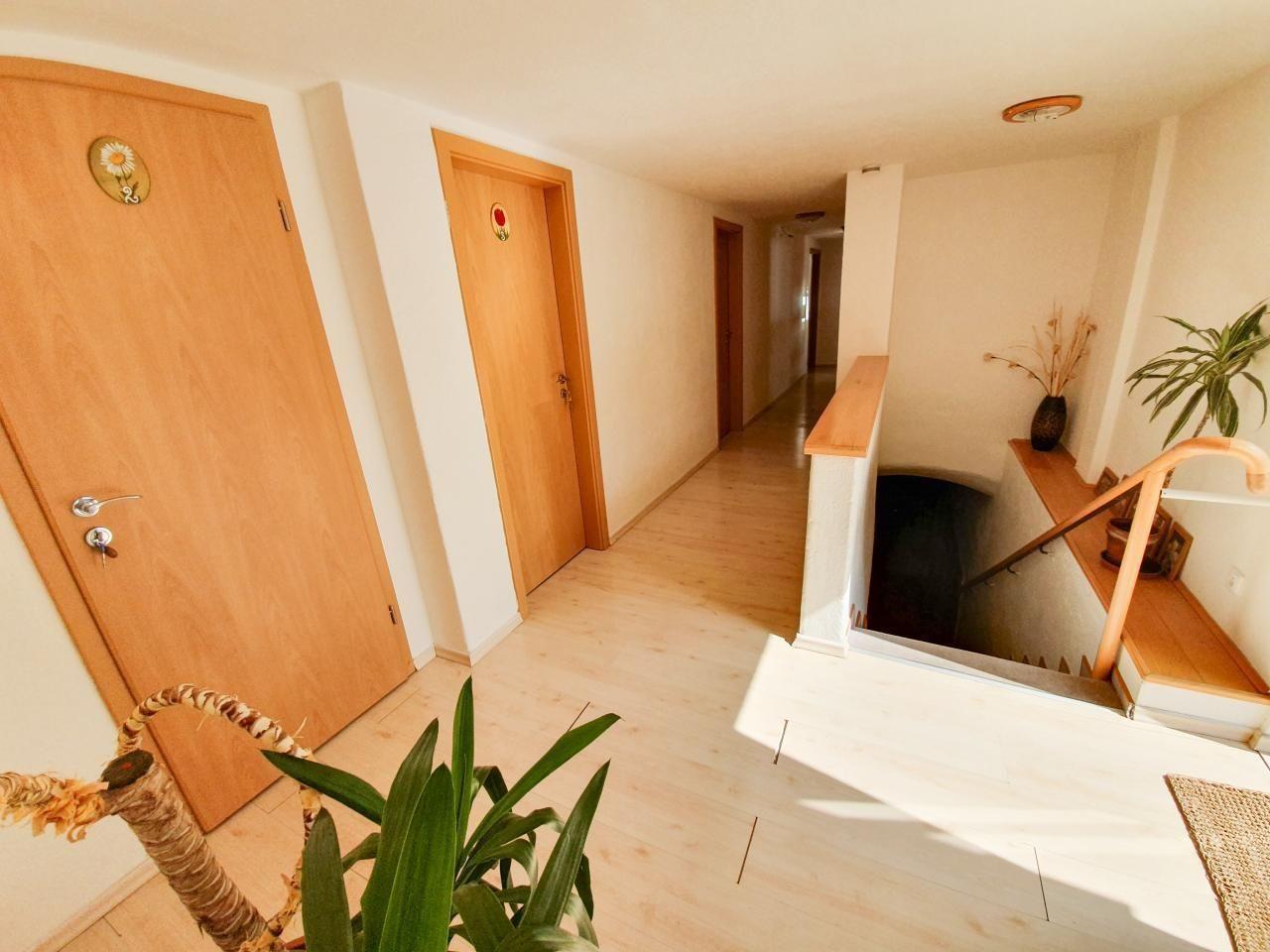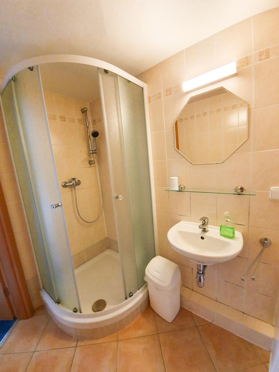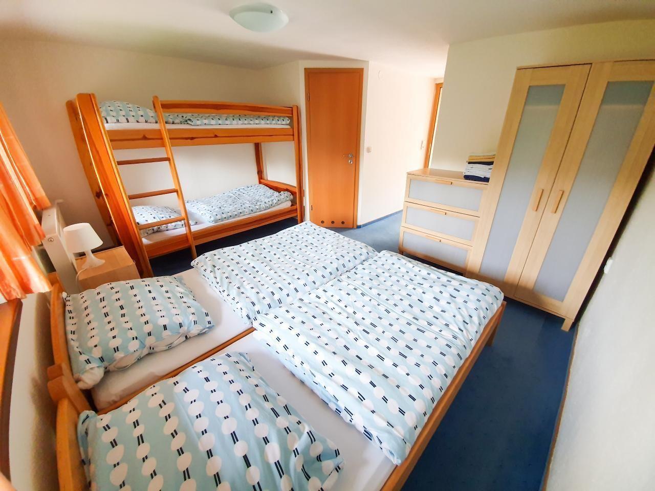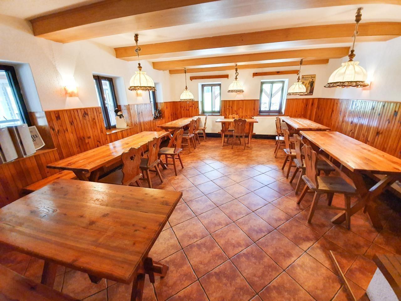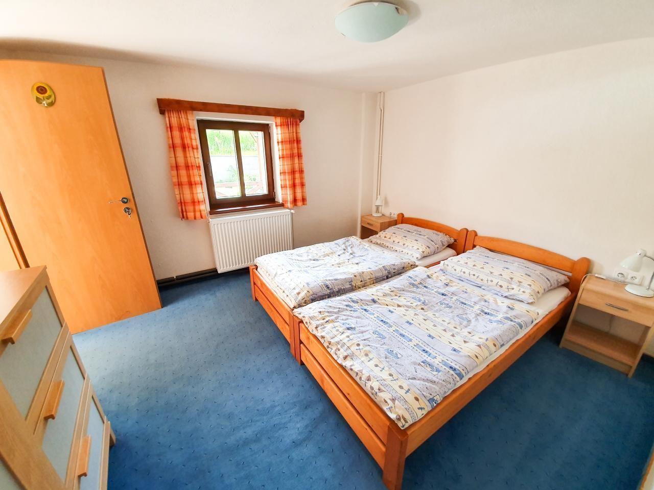 On the ground floor there is a lounge with a fireplace and enough tables and chairs for all guests. Next door is a communal kitchen where you can prepare your meals. We do not offer catering. On the first floor there are 6 rooms with a total of 20 beds - double beds and bunk beds. 5 rooms have private bathrooms and toilets, 1 room has its own bathroom in the corridor.
