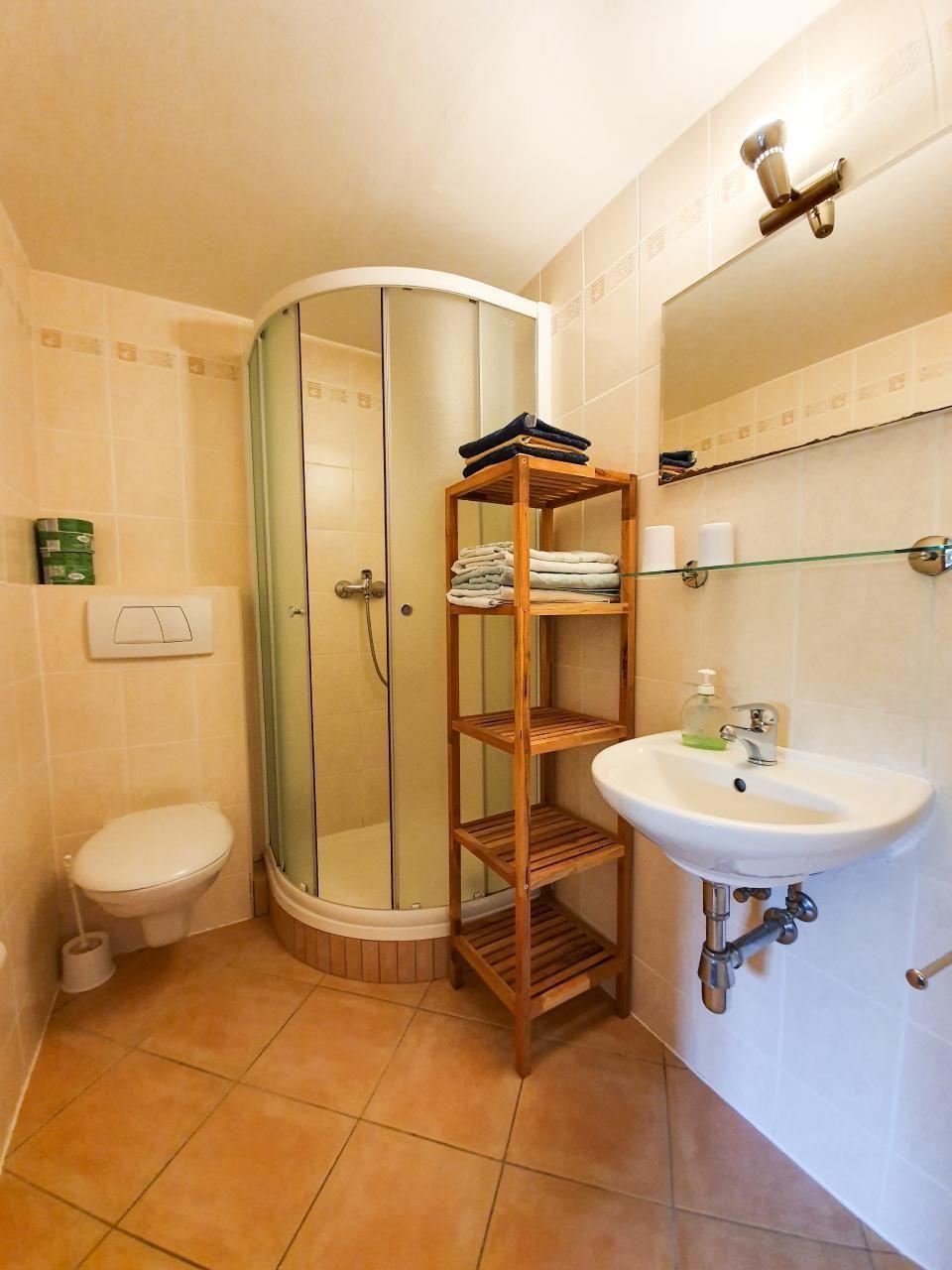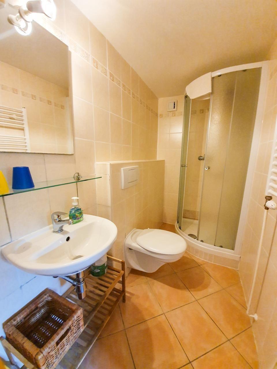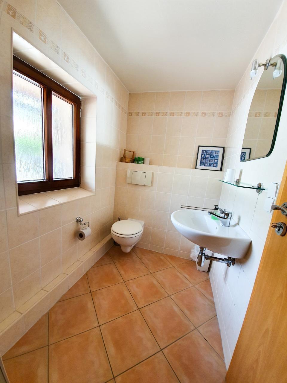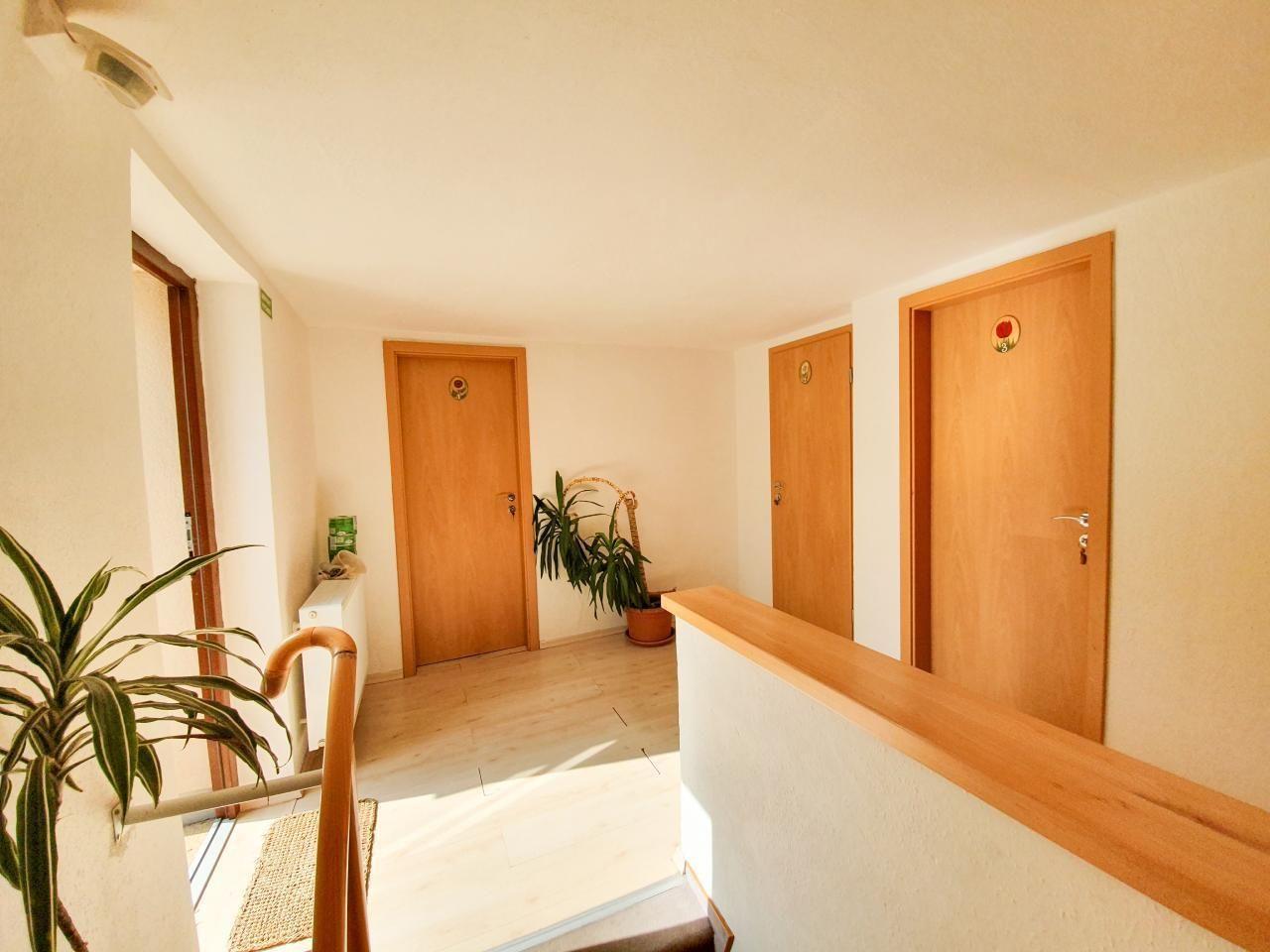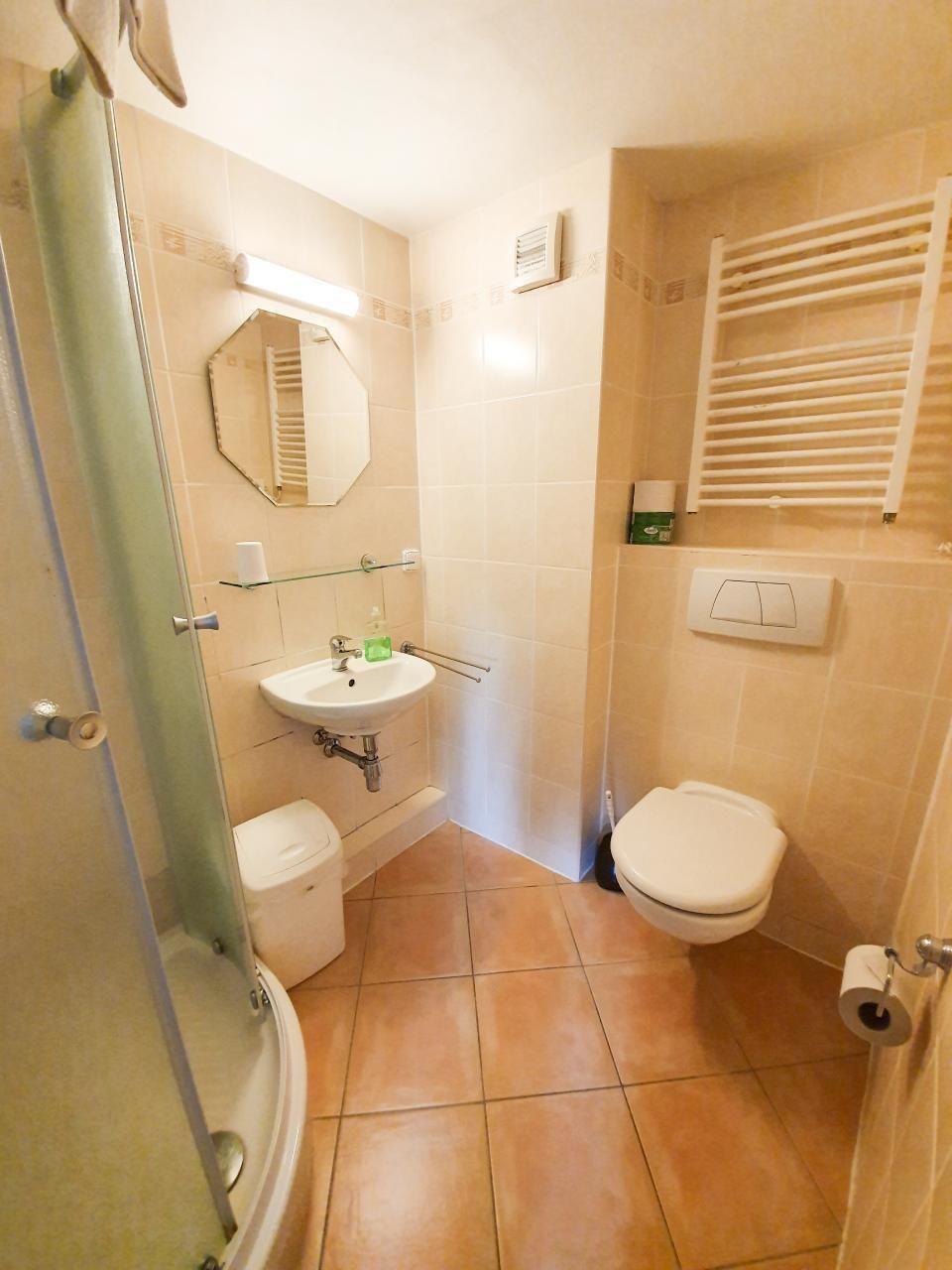 On the ground floor there is a lounge with a fireplace and enough tables and chairs for all guests. Next door is a communal kitchen where you can prepare your meals. We do not offer catering. On the first floor there are 6 rooms with a total of 20 beds - double beds and bunk beds. 5 rooms have private bathrooms and toilets, 1 room has its own bathroom in the corridor.