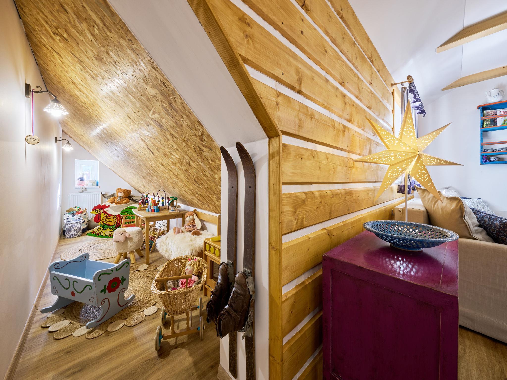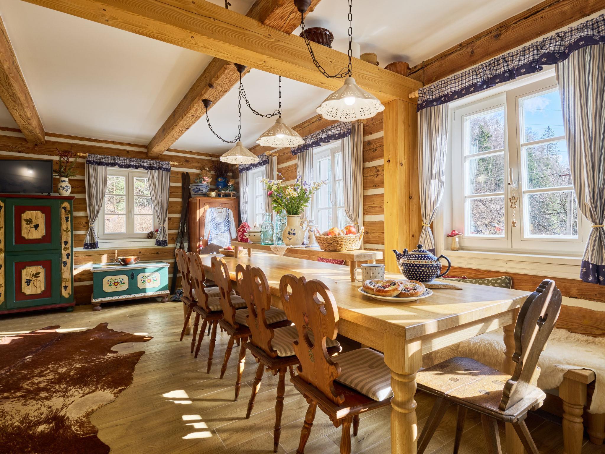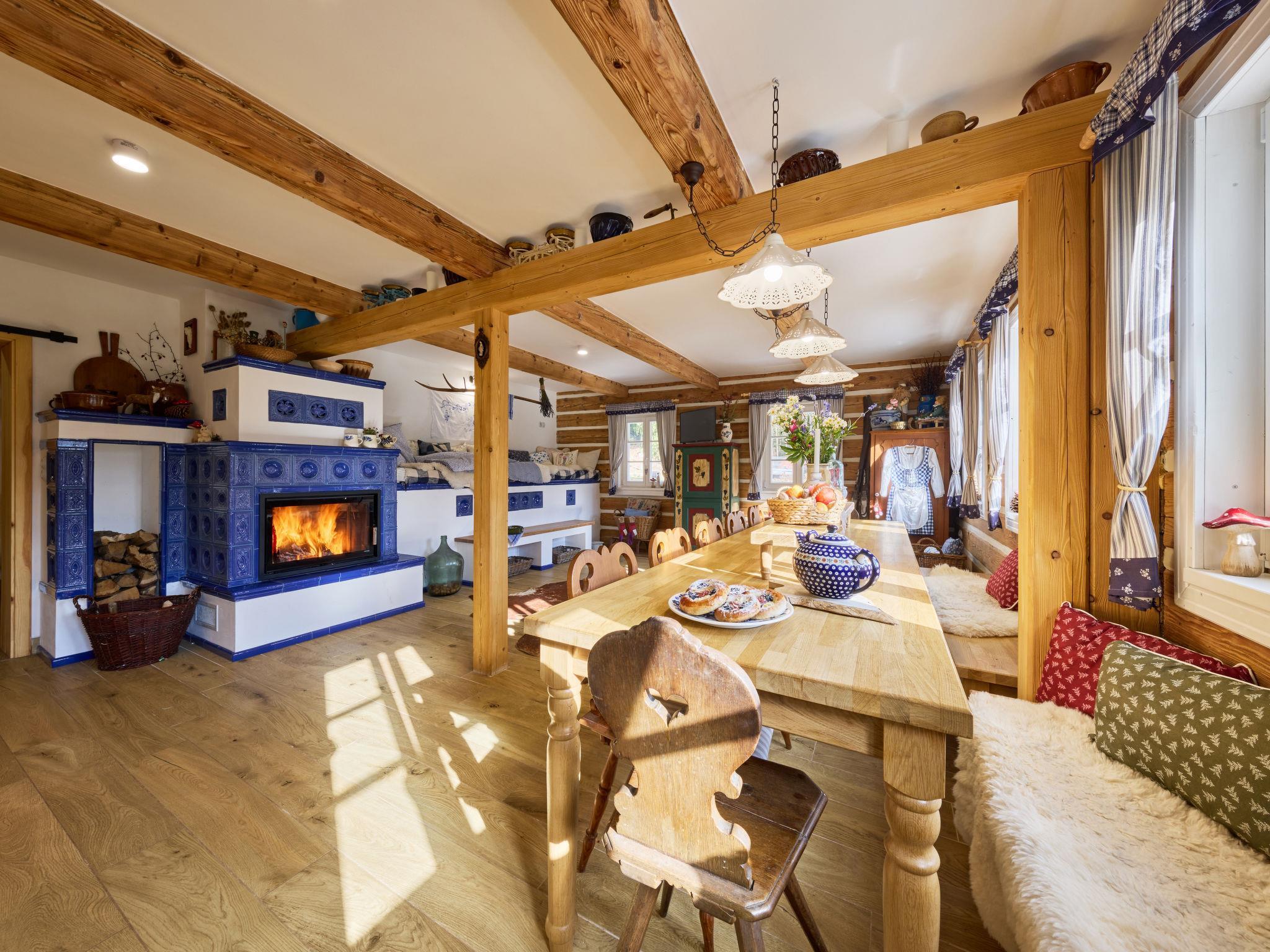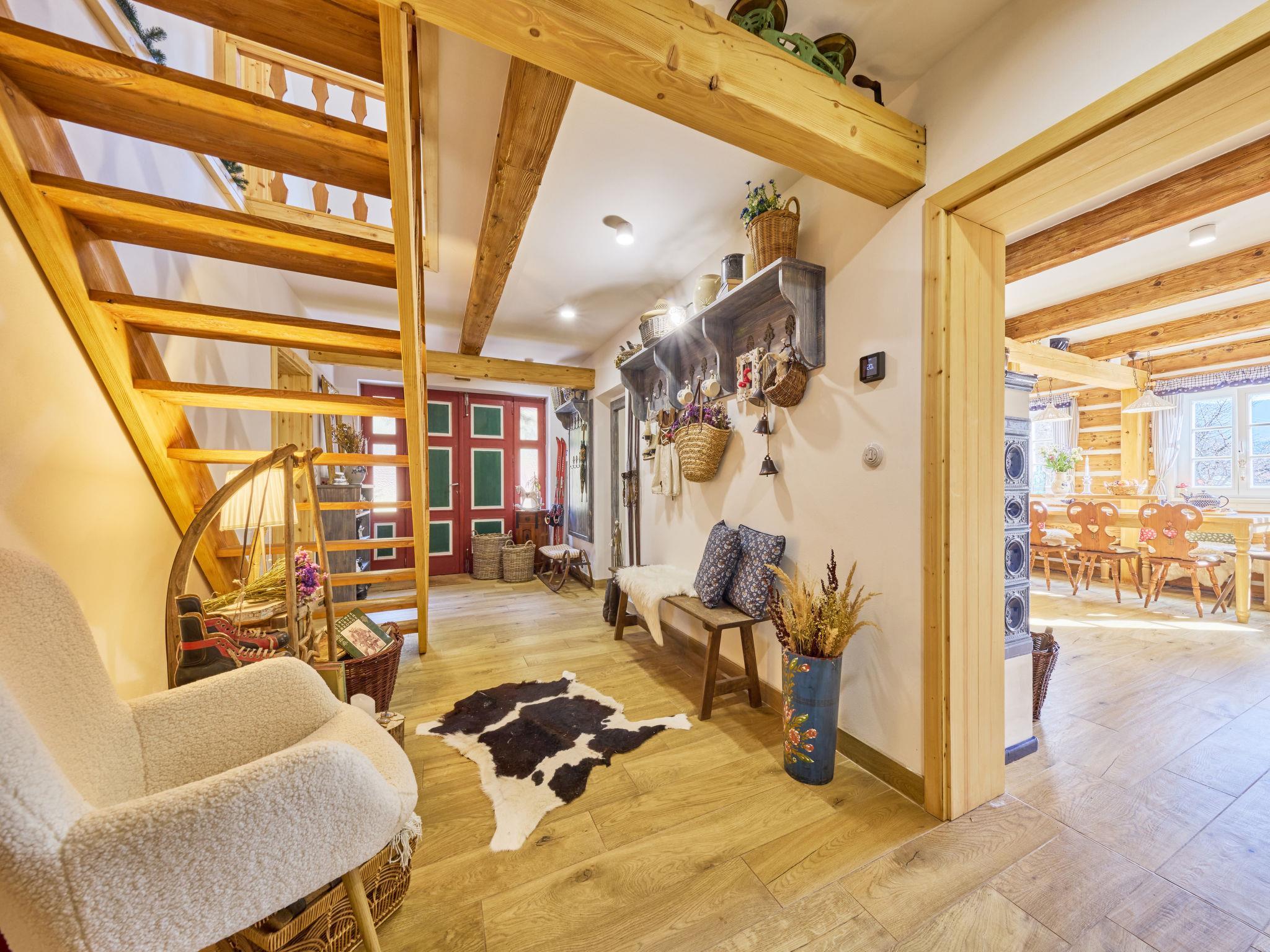 "Charming Mountain Lodge & Wellness", 7-room chalet on 2 levels. Fully renovated in 2023, very beautiful and rustic furnishings: living/dining room with dining table, TV and tiled stove. 1 room with 5 beds. 1 room with 1 double bed and 1 folding bed. Lounge. Kitchenette (oven, dishwasher, 4 ceramic glass hob hotplates, toaster, kettle, microwave, freezer, electric coffee machine). Shower, shower/WC, 3 sep. WC's, Sauna. Upper floor: open living room with TV. 1 room with 1 x 2 bunk beds, 1 french bed and 1 double bed. 1 room with 1 x 2 bunk beds, 1 french bed and 1 double bed. Facilities: washing machine, dryer, children's high chair, baby cot. Internet (WiFi, free). Suitable for families. Maximum 1 small pet/ dog allowed.