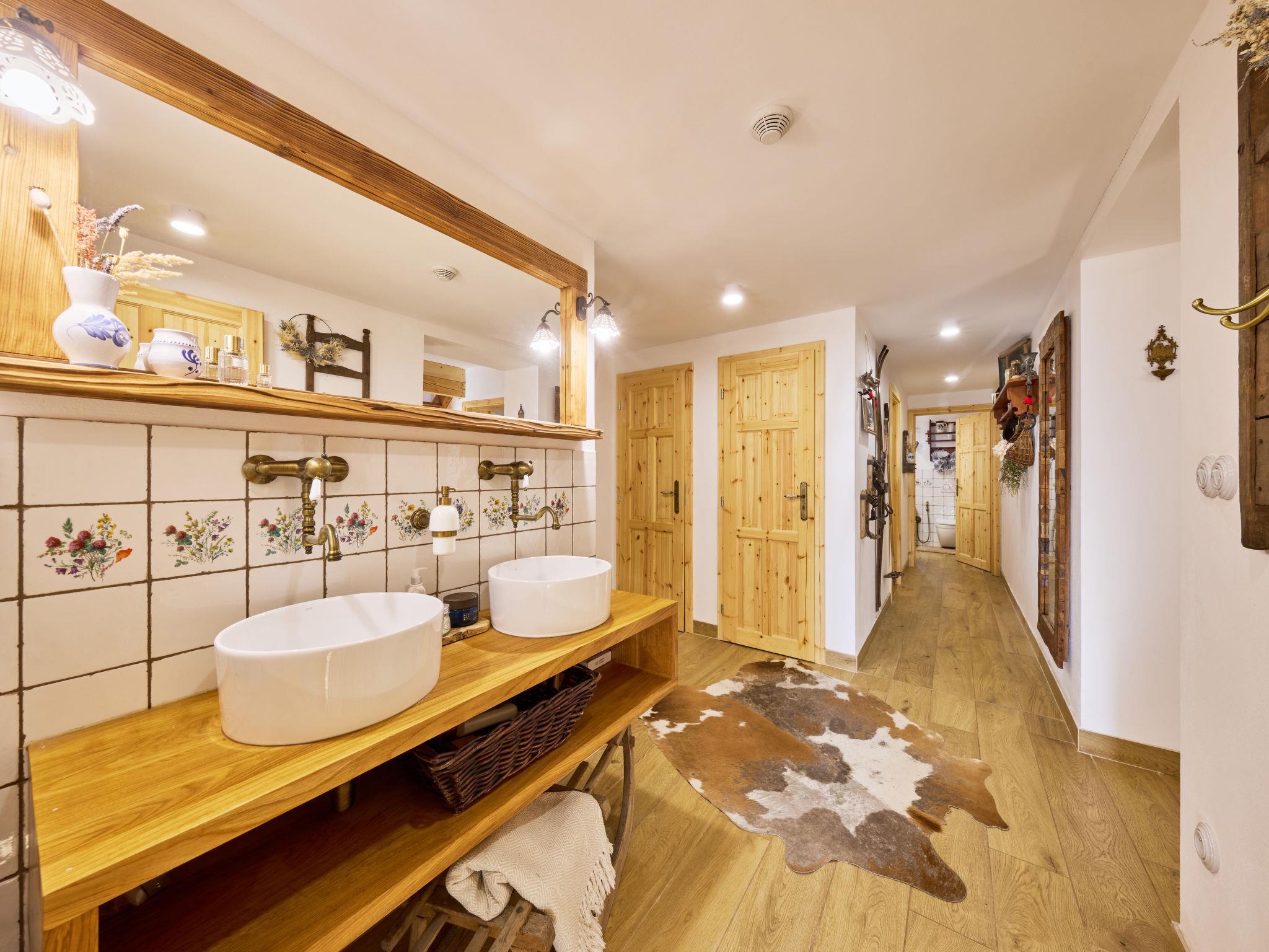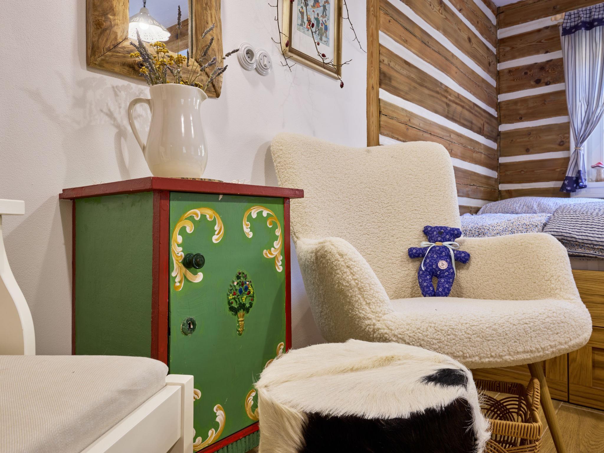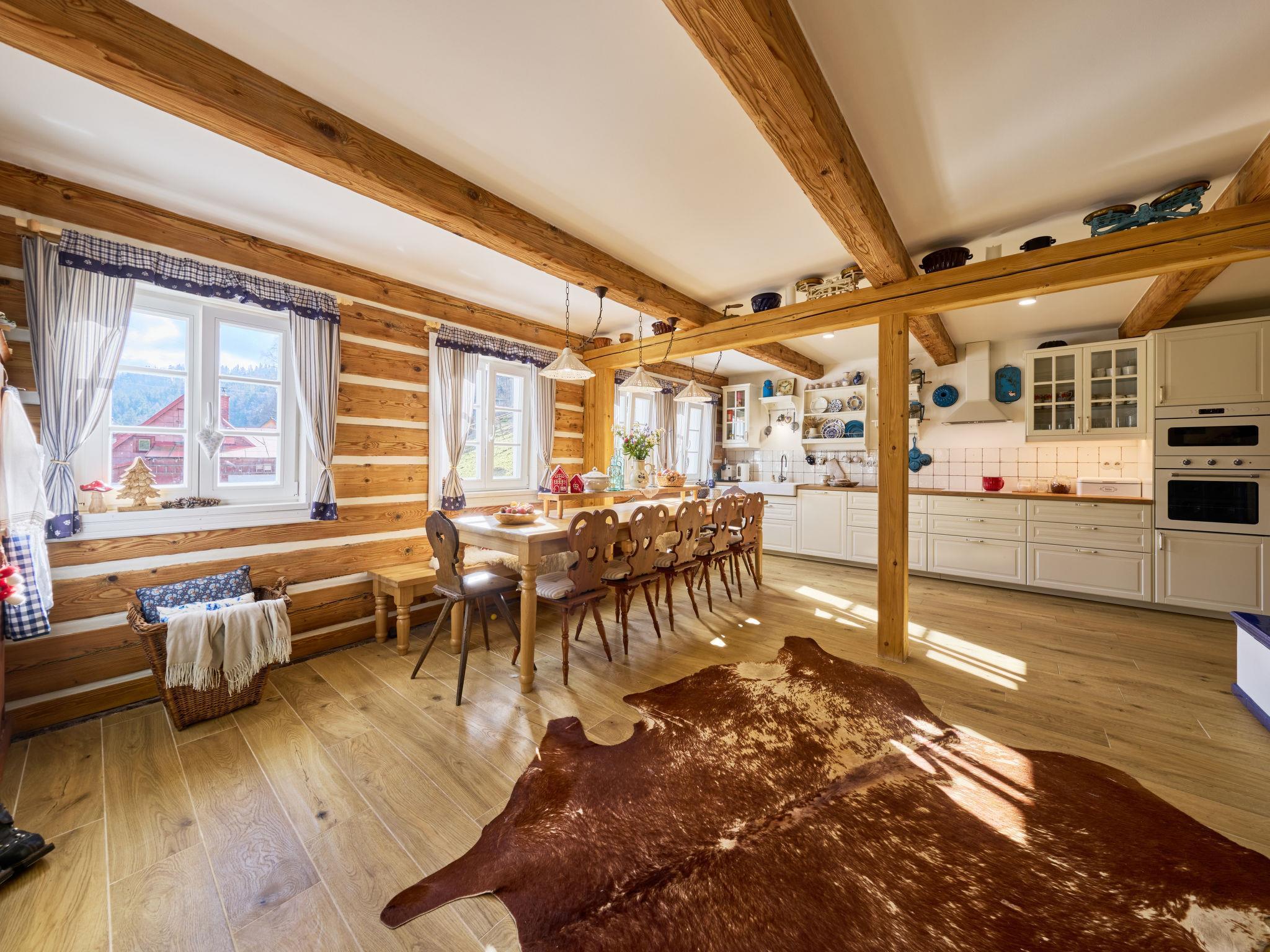 "Charming Mountain Lodge & Wellness", 7-room chalet on 2 levels. Fully renovated in 2023, very beautiful and rustic furnishings: living/dining room with dining table, TV and tiled stove. 1 room with 5 beds. 1 room with 1 double bed and 1 folding bed. Lounge. Kitchenette (oven, dishwasher, 4 ceramic glass hob hotplates, toaster, kettle, microwave, freezer, electric coffee machine). Shower, shower/WC, 3 sep. WC's, Sauna. Upper floor: open living room with TV. 1 room with 1 x 2 bunk beds, 1 french bed and 1 double bed. 1 room with 1 x 2 bunk beds, 1 french bed and 1 double bed. Facilities: washing machine, dryer, children's high chair, baby cot. Internet (WiFi, free). Suitable for families. Maximum 1 small pet/ dog allowed.