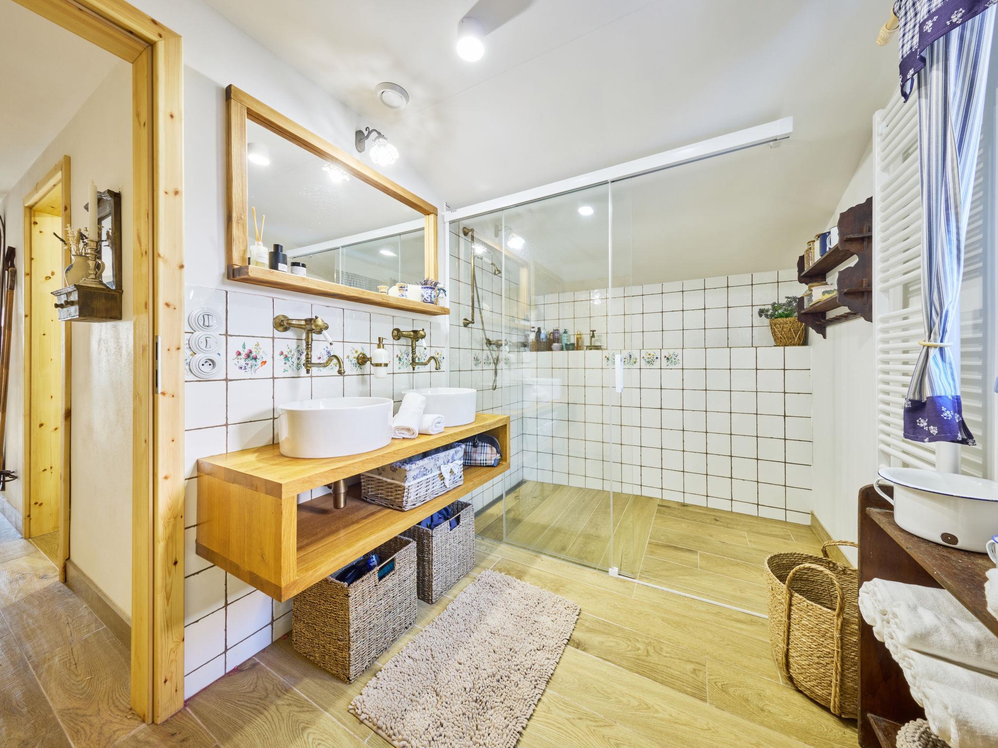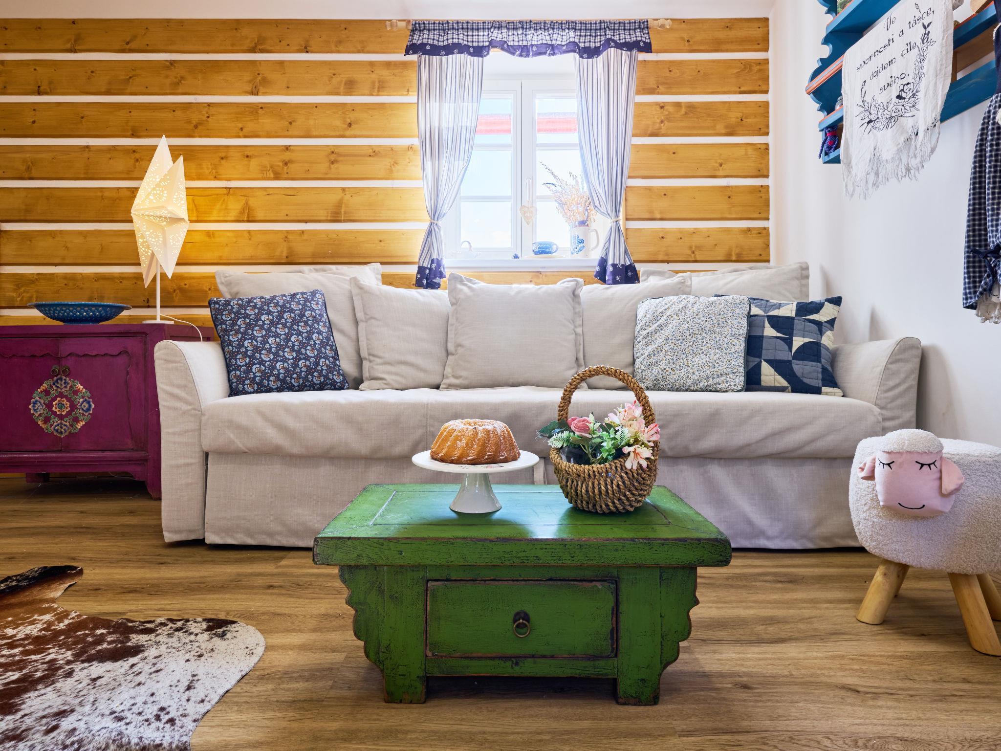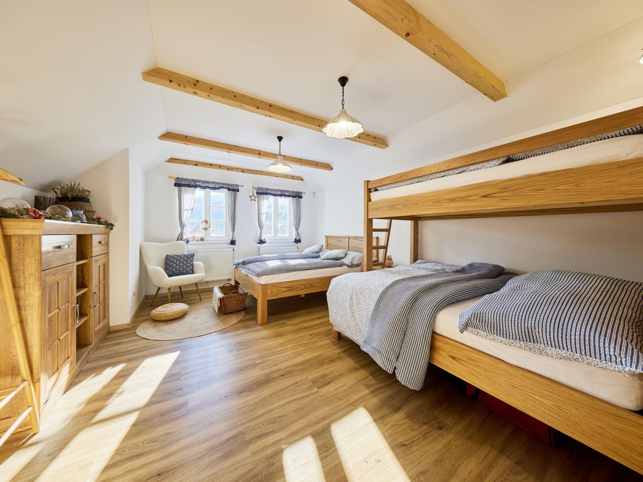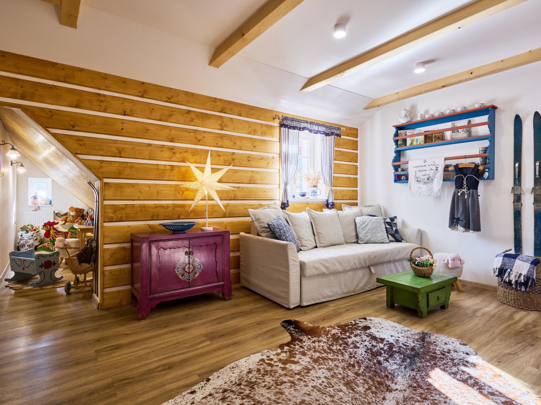 "Charming Mountain Lodge & Wellness", 7-room chalet on 2 levels. Fully renovated in 2023, very beautiful and rustic furnishings: living/dining room with dining table, TV and tiled stove. 1 room with 5 beds. 1 room with 1 double bed and 1 folding bed. Lounge. Kitchenette (oven, dishwasher, 4 ceramic glass hob hotplates, toaster, kettle, microwave, freezer, electric coffee machine). Shower, shower/WC, 3 sep. WC's, Sauna. Upper floor: open living room with TV. 1 room with 1 x 2 bunk beds, 1 french bed and 1 double bed. 1 room with 1 x 2 bunk beds, 1 french bed and 1 double bed. Facilities: washing machine, dryer, children's high chair, baby cot. Internet (WiFi, free). Suitable for families. Maximum 1 small pet/ dog allowed.