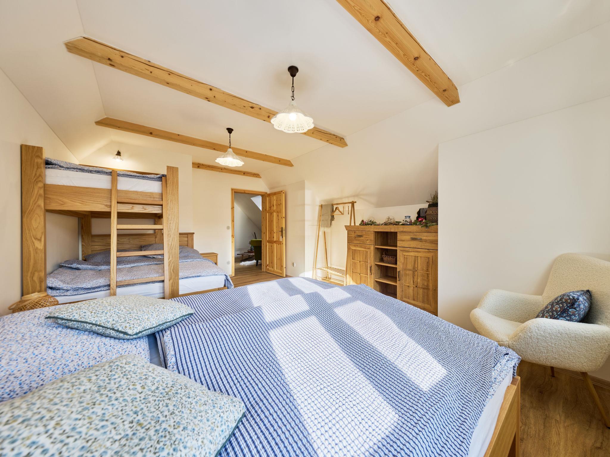 Temný Dul 3 km from Janské Lázne: Very beautiful, rustic country house "Charming Mountain Lodge & Wellness", 2 storeys, detached, built in 1850, renovated in 2023. In a quiet, sunny position, 100 m from the edge of the forest, 2.5 km from the skiing area, directly by the river. Private: garden (not fenced). Patio, fireplace. In the house: WiFi, sauna, storage room for skis, central heating system, laundry, washing machine, tumble dryer. Parking at the house. Grocery 1.5 km, restaurant 900 m, bus stop "Svoboda nad Úpou - Maršov" 400 m, railway station "Svoboda nad Úpou" 3 km, park "Farmapark Muchomurka" 3 km, outdoor swimming pool 7 km, indoor swimming pool 4.5 km. Golf course (18 hole) 9 km, tennis 4 km, minigolf 1.6 km, walking paths from the house, cycle lane 500 m, cable car 5 km, ski lift 2.5 km, gondola lift 5 km, skisport facilities 5 km, slopes 2.5 km, ski rental 3500 km, ski bus stop 200 m, ski school 5 km, children's ski school 5 km, sled run 6 km, cross country ski track 1.5 km, children's playground 800 m. Nearby attractions: Pohádková výstava 1.5 km, Svoboda n. Ú. 2.5 km, hrádek Aichelburg 4 km, Janské Lázne Spa 5 km, Stezka korunami stromu 6 km, Pec pod Snežkou, Relaxpark, bobová dráha 10 km, Trutnov, Malá Úpa 14 km, Vrchlabí 20 km, Zoo Dvur Králové, Adršpach, Karpacz 35 km. Well-known ski regions can easily be reached: Svoboda nad Úpou 2.5 km, Janské Lázne 3.5 km, Cerná Hora – Pec, Portášky, Mladé Buky 7 km, Malá Úpa 16 km, Špindleruv Mlýn 40 km. Hiking paths: Krkonošský národní park. Please note: suitable for families.
