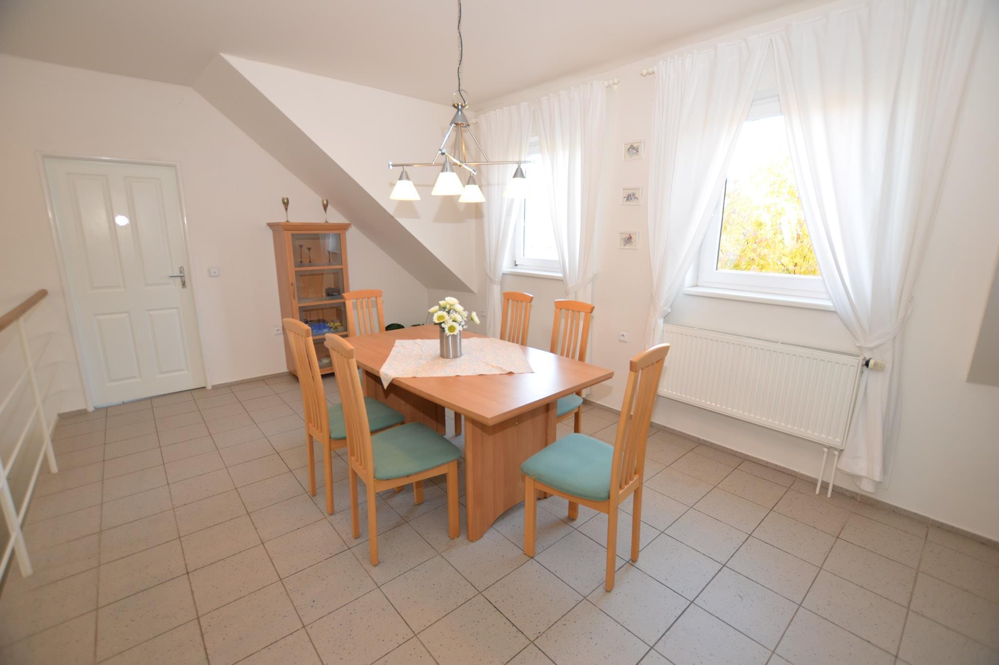On the 1st floor: (Living room(TV, seating area), dining room(dining table, fridge-freezer, tumble dryer, washing machine), Kitchen(cooker(ceramic), coffee machine, oven, microwave, dishwasher), bedroom(single bed, double bed), bedroom(double bed), bedroom(2x single bed, double bed), bathroom(bath tub, massage shower, washbasin, toilet)) heating(central), garden(shared with other guests, fenced), garden furniture, BBQ(shared with other guests), parking, swimming pool(shared with other guests, heatable, roofed, 8 x 4 m.)