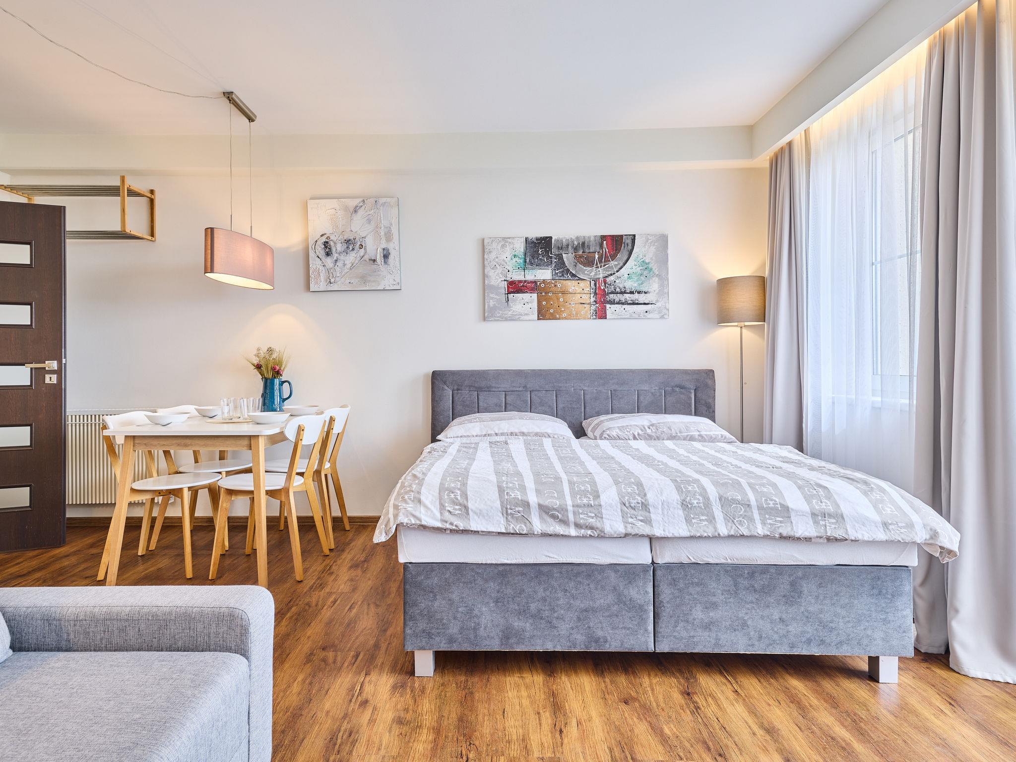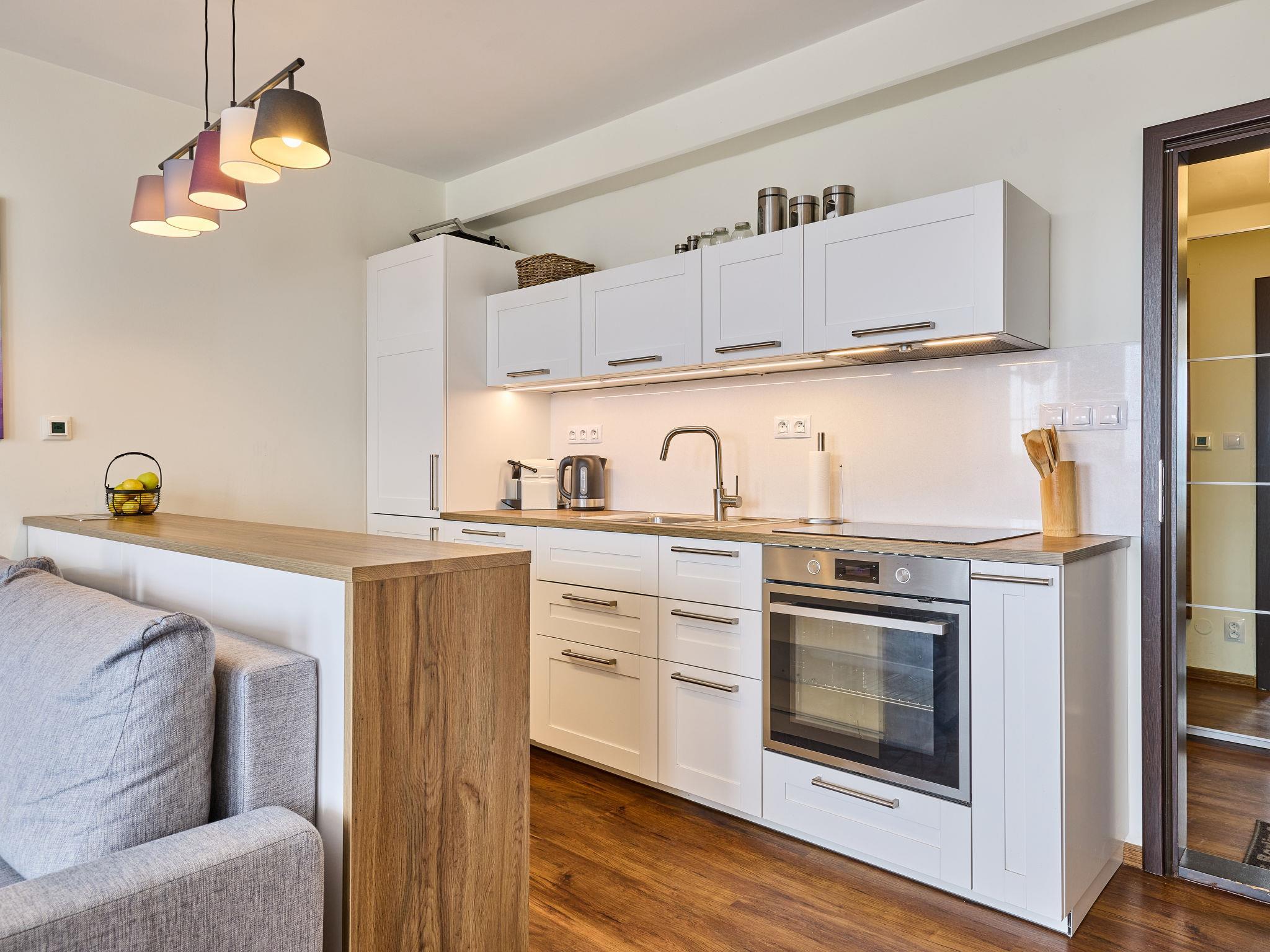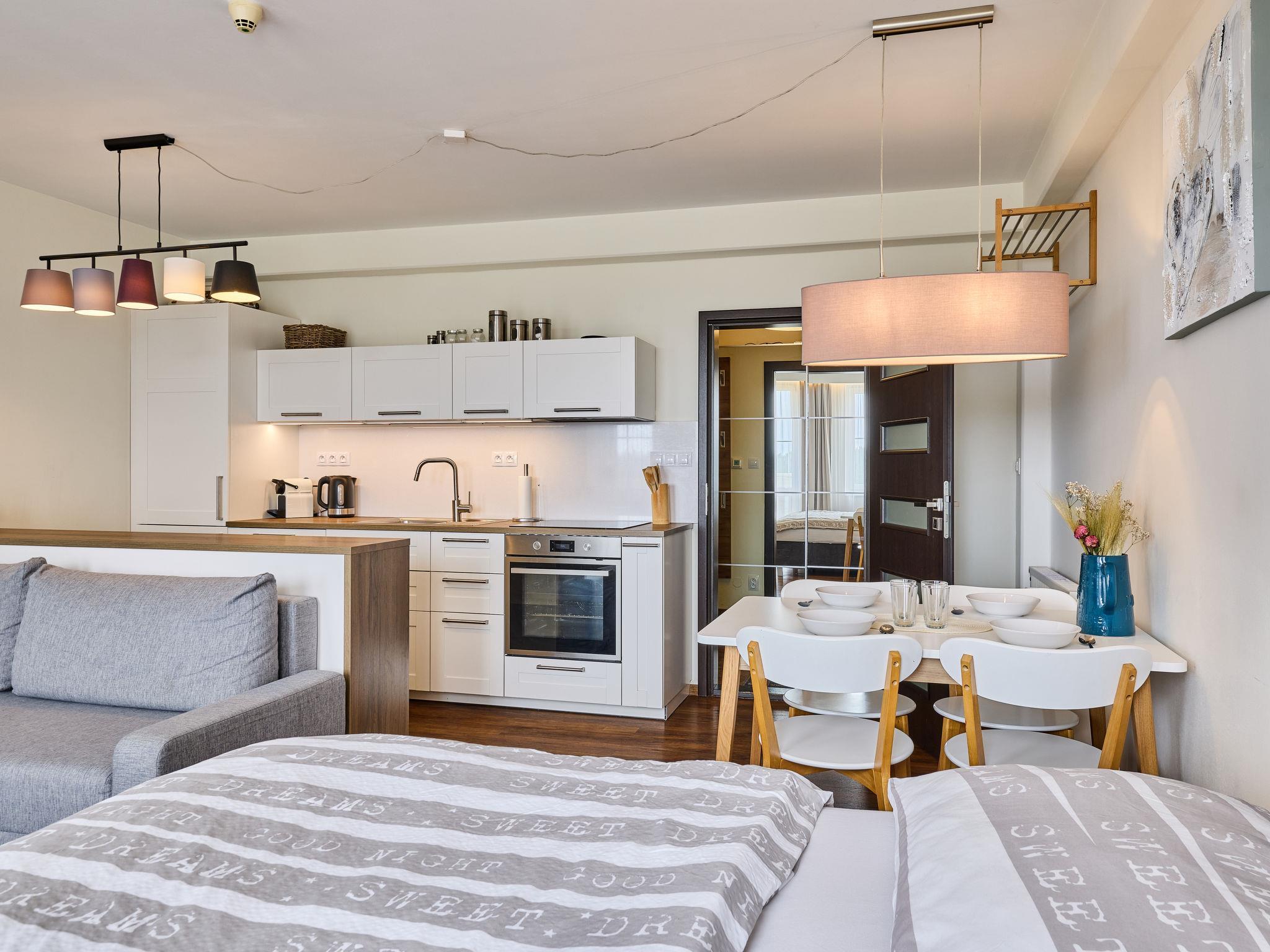 "Horní Mísecky", 1-room apartment 35 m2, on the ground floor. Renovated in 2018, modern and stylish furnishings: living/sleeping room with 1 double sofabed (1 x 140 cm), 1 double bed, dining table and satellite TV. Kitchenette (oven, dishwasher, 4 ceramic glass hob hotplates, toaster, kettle, microwave, freezer, electric coffee machine). Shower/WC. Electric heating. Balcony. Balcony furniture. Facilities: washing machine. Internet (WiFi, free). Parking (roofed). Please note: suitable for families. Non-smokers only.