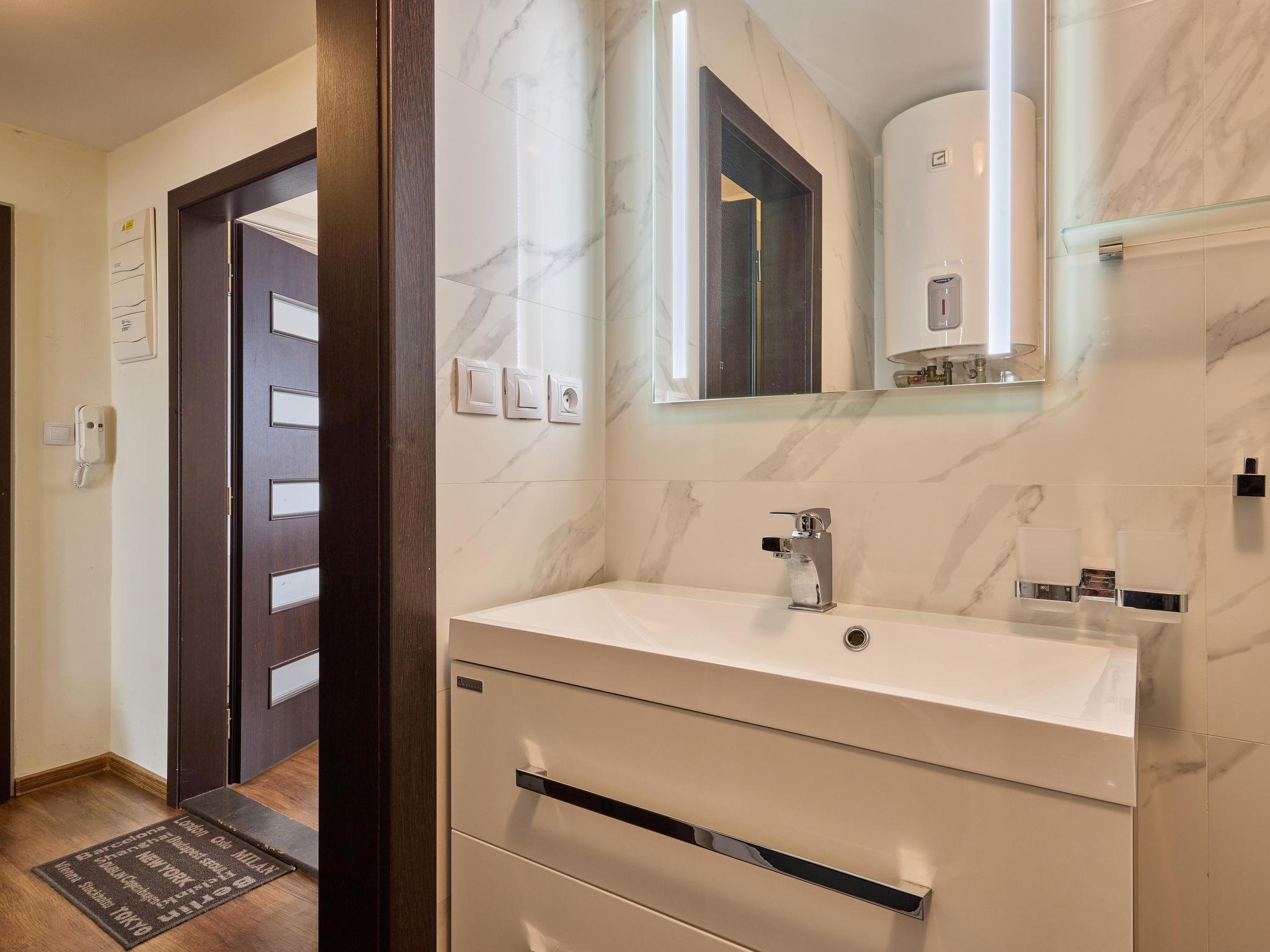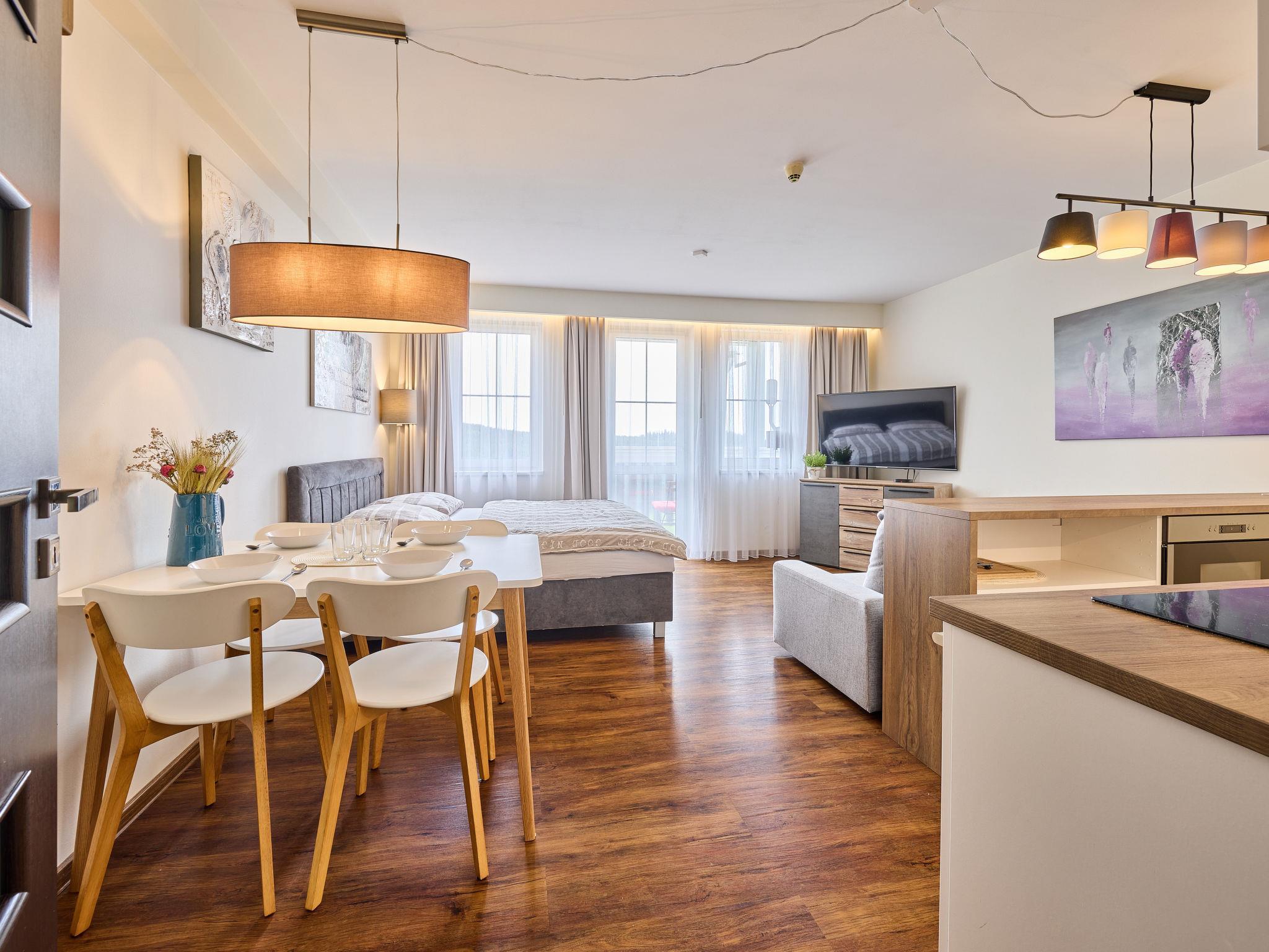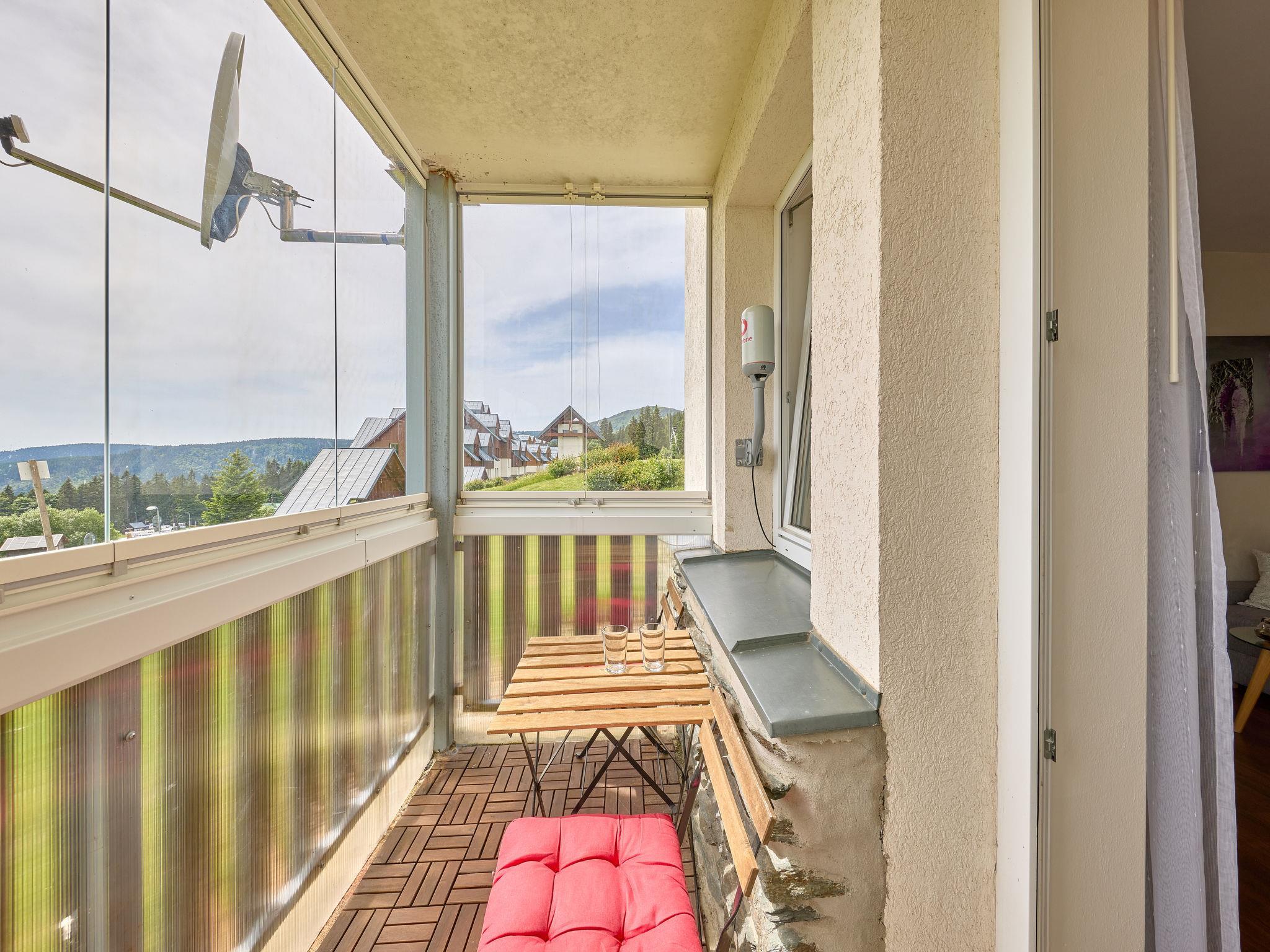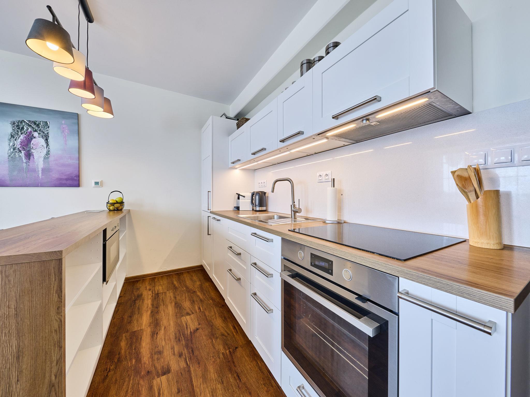 "Horní Mísecky", 1-room apartment 35 m2, on the ground floor. Renovated in 2018, modern and stylish furnishings: living/sleeping room with 1 double sofabed (1 x 140 cm), 1 double bed, dining table and satellite TV. Kitchenette (oven, dishwasher, 4 ceramic glass hob hotplates, toaster, kettle, microwave, freezer, electric coffee machine). Shower/WC. Electric heating. Balcony. Balcony furniture. Facilities: washing machine. Internet (WiFi, free). Parking (roofed). Please note: suitable for families. Non-smokers only.
