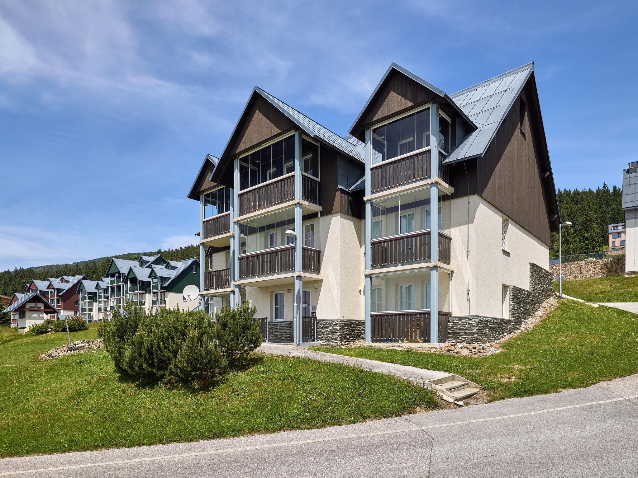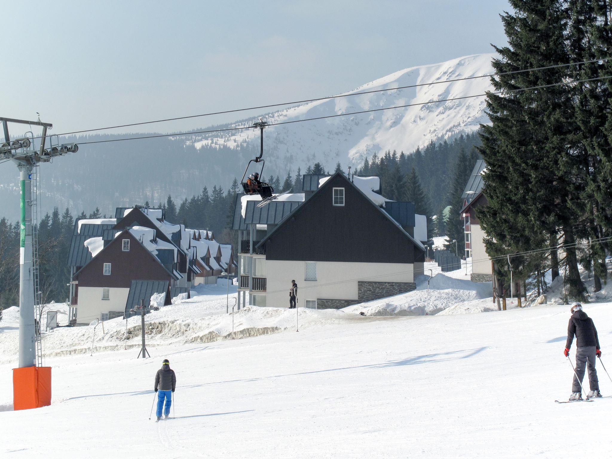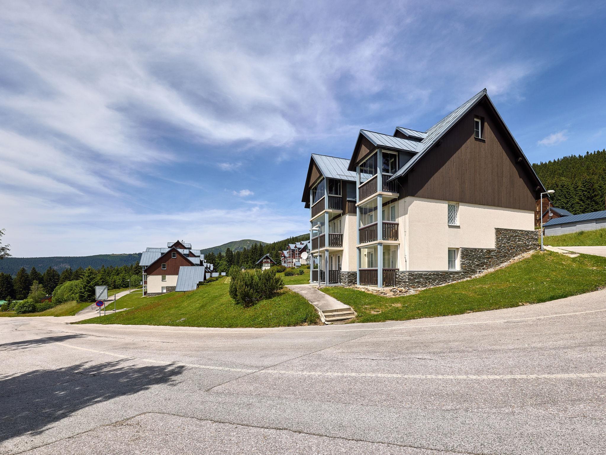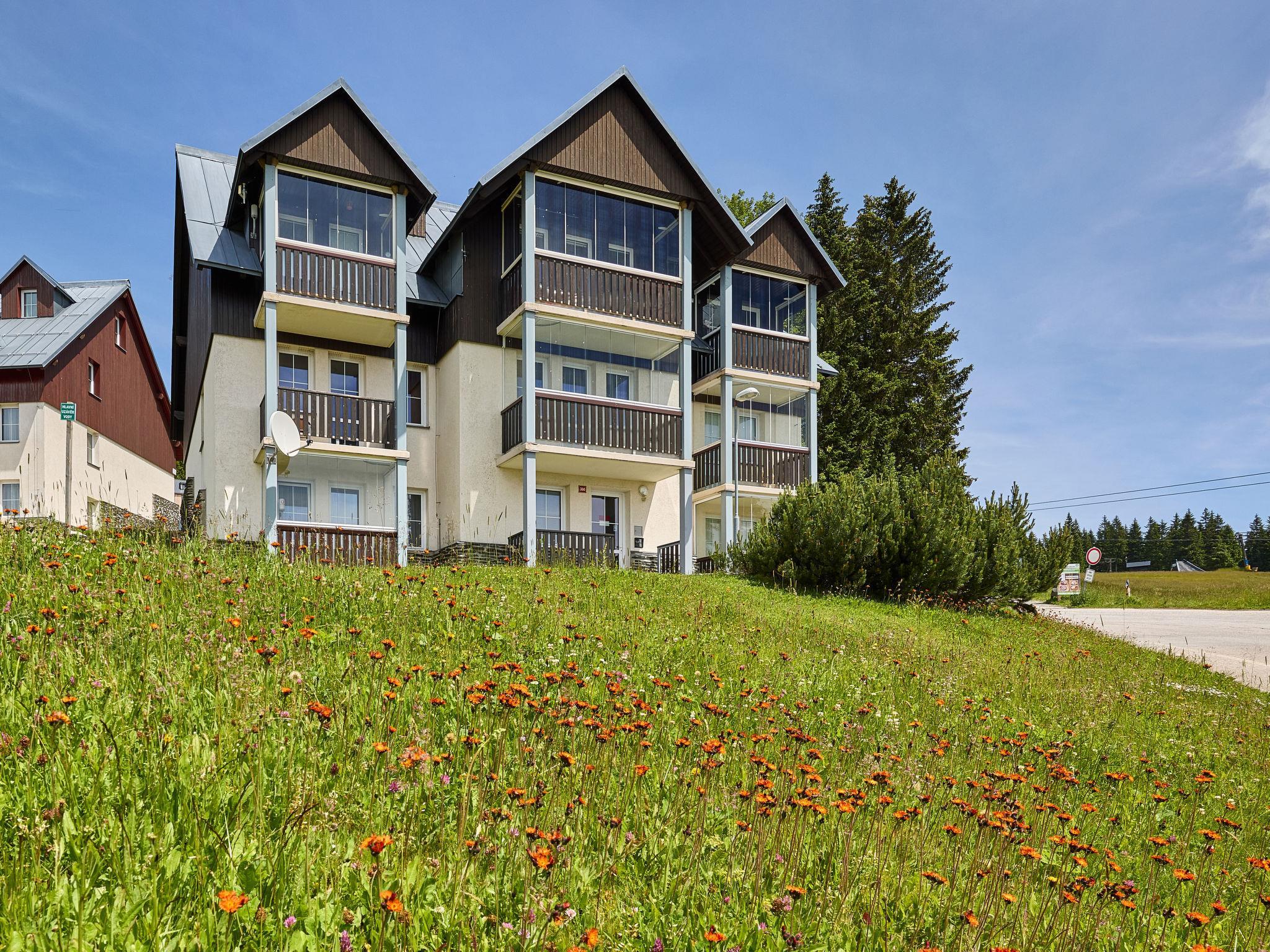 Modern, beautiful apartment house 1'000 m a.s.l.. 10 m from the centre of Horní Mísecky, 9 km from the centre of Vitkovice, 20 km from the centre of Jilemnice, in a sunny position on a slope, 50 m from the skiing area. For shared use: property, communal covered parking. Shop 9 km, supermarket 20 km, bus stop "Vítkovice, Horní Mísecky" 130 m. Slopes 50 m. Please note: no lift.