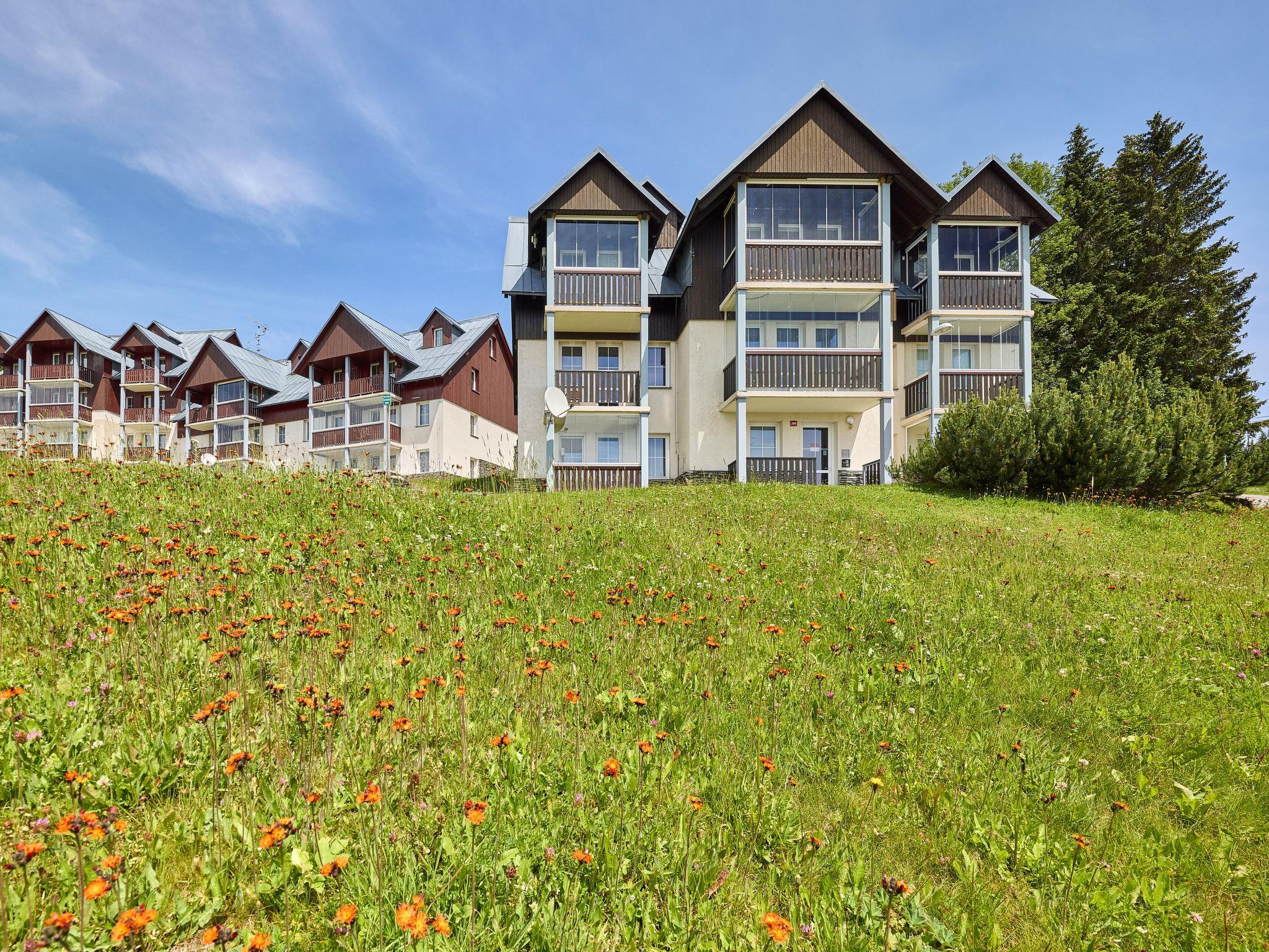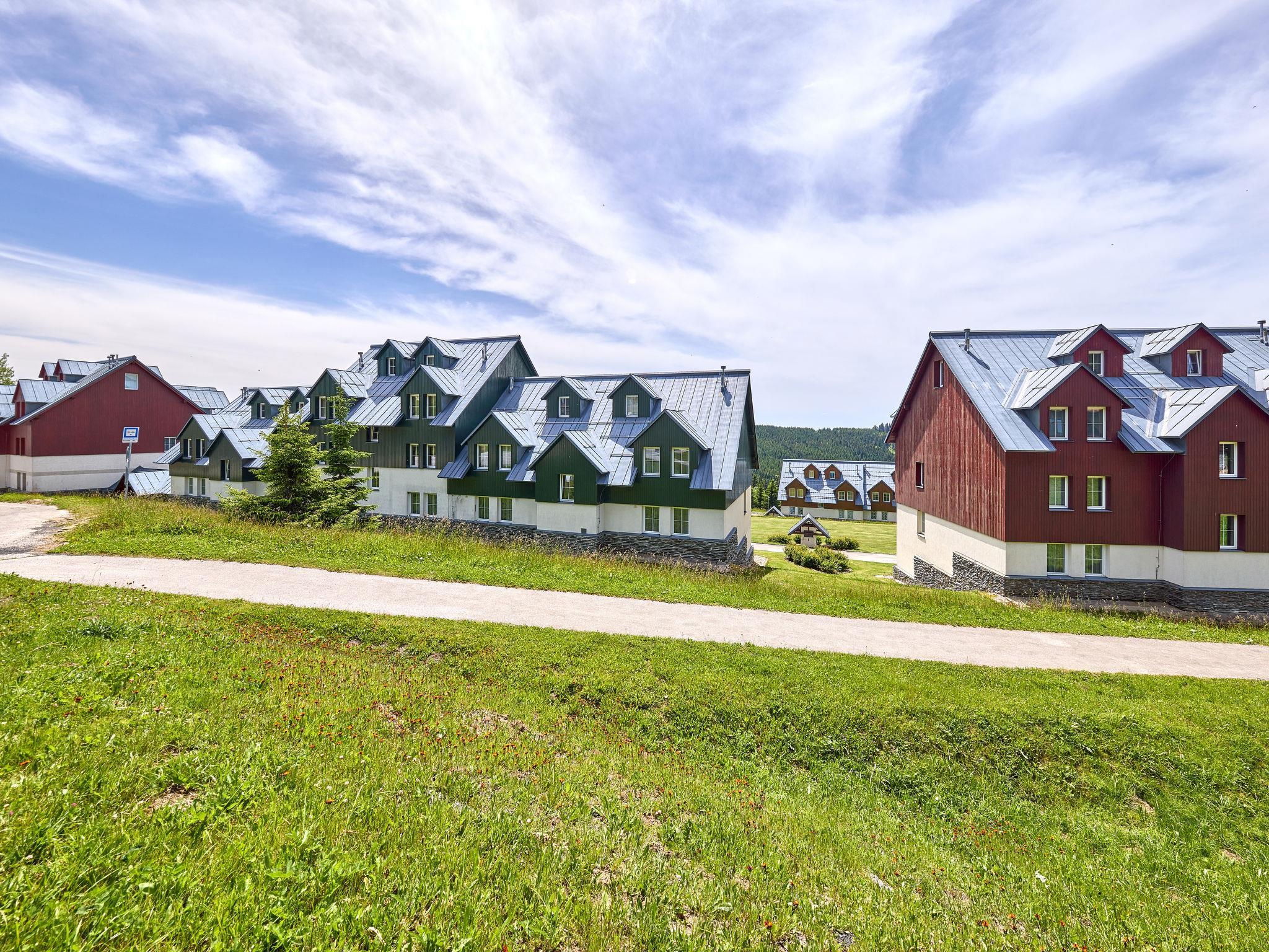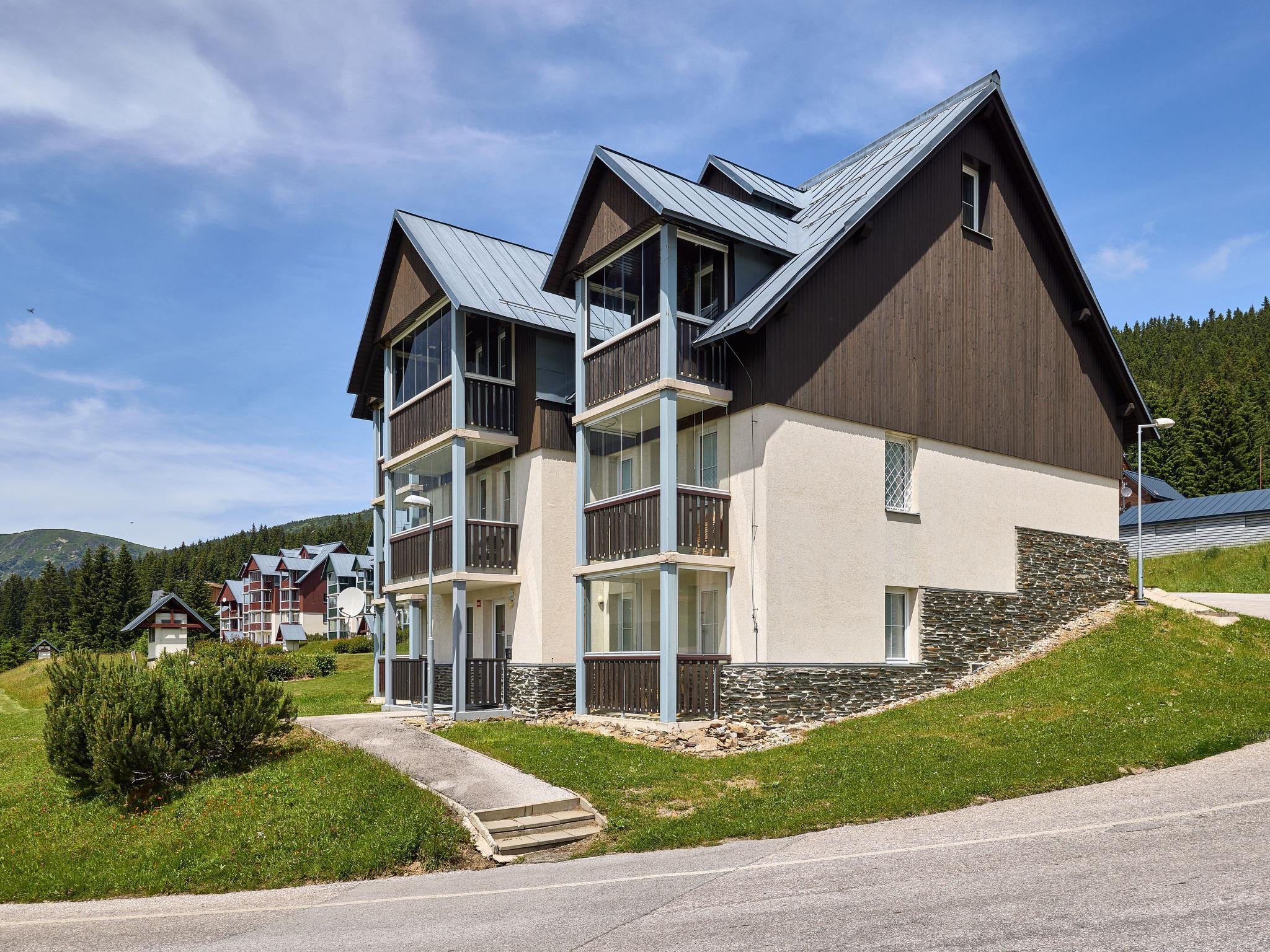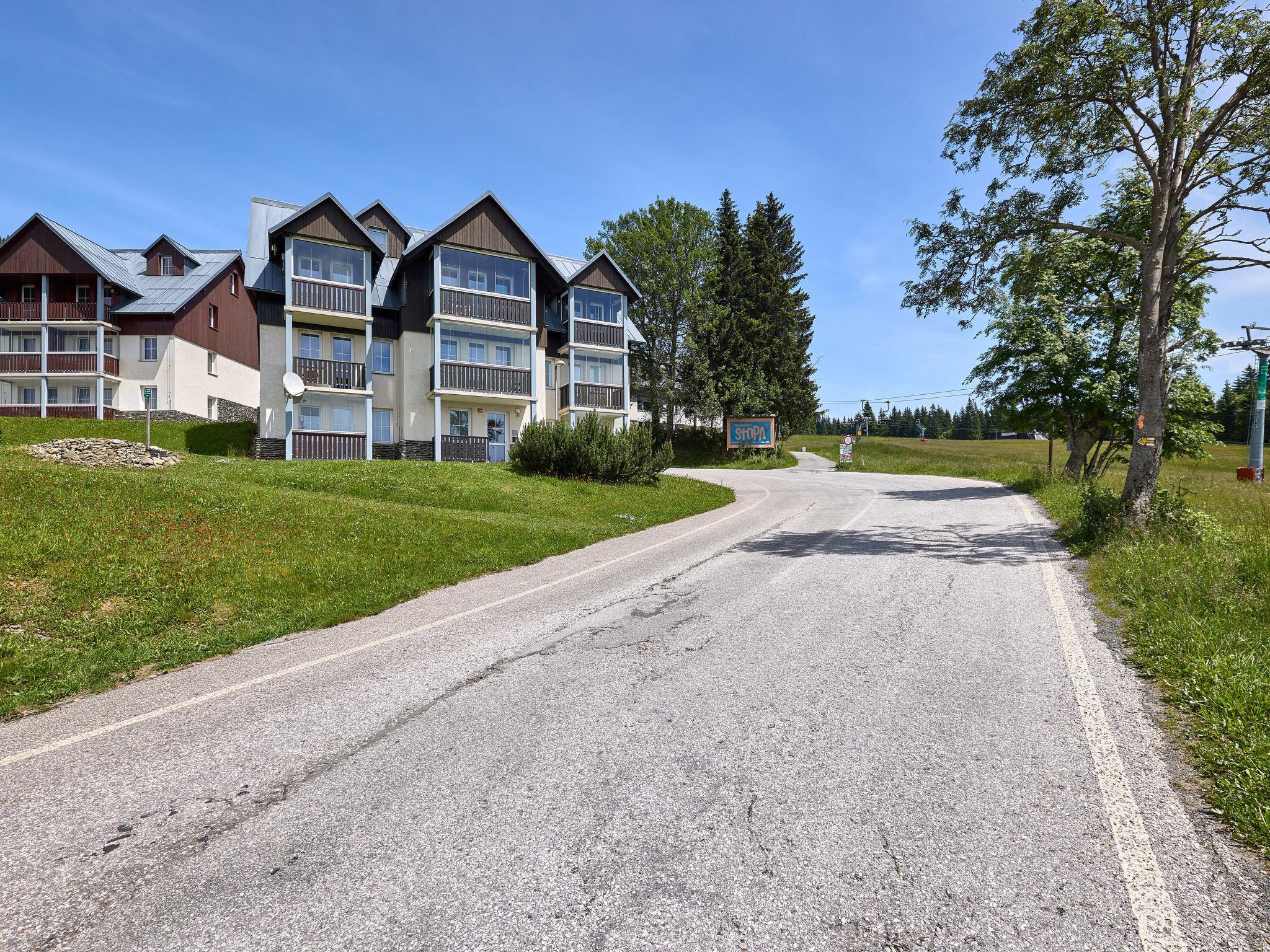Modern, beautiful apartment house 1'000 m a.s.l.. 10 m from the centre of Horní Mísecky, 9 km from the centre of Vitkovice, 20 km from the centre of Jilemnice, in a sunny position on a slope, 50 m from the skiing area. For shared use: property, communal covered parking. Shop 9 km, supermarket 20 km, bus stop "Vítkovice, Horní Mísecky" 130 m. Slopes 50 m. Please note: no lift.