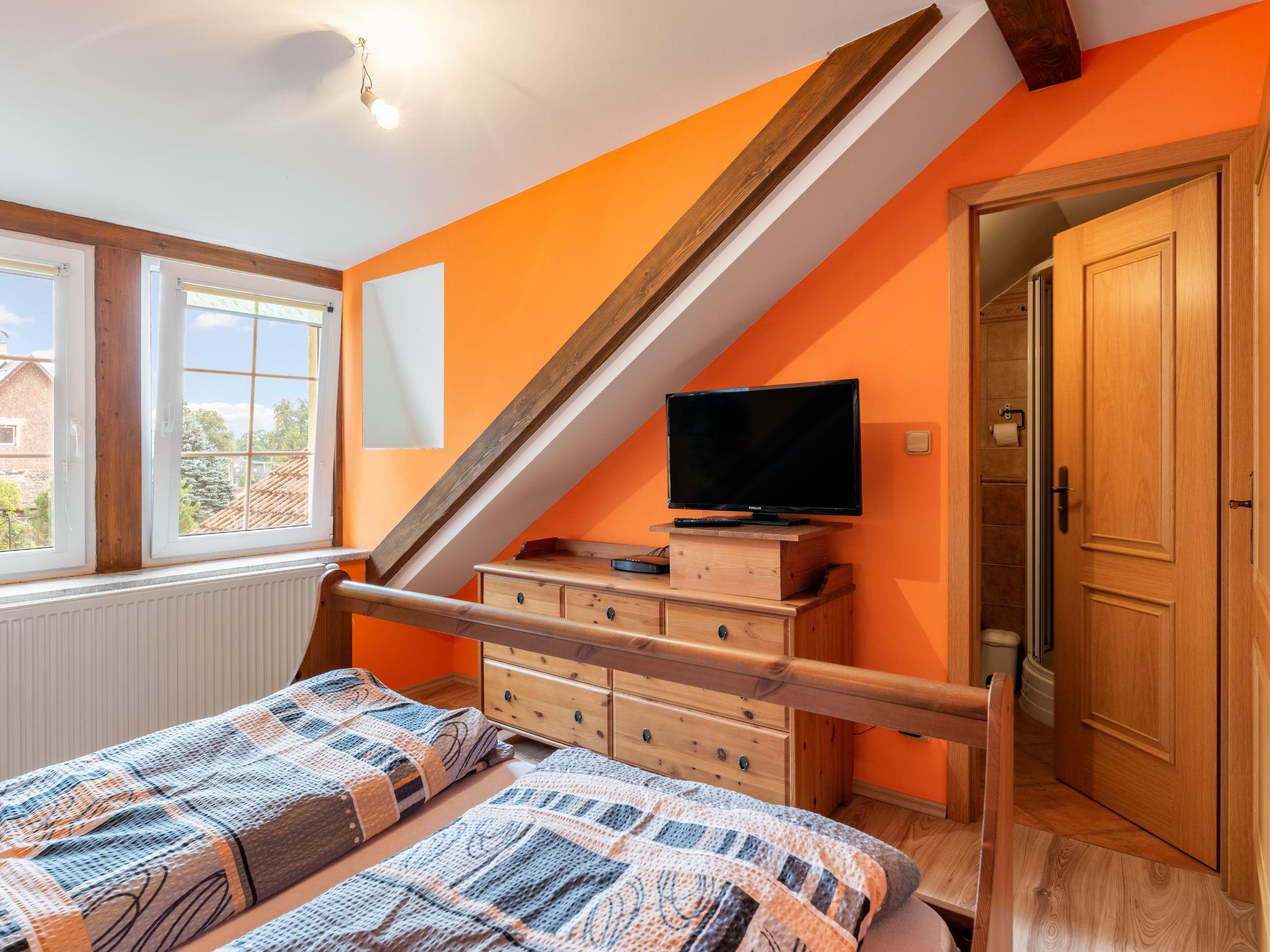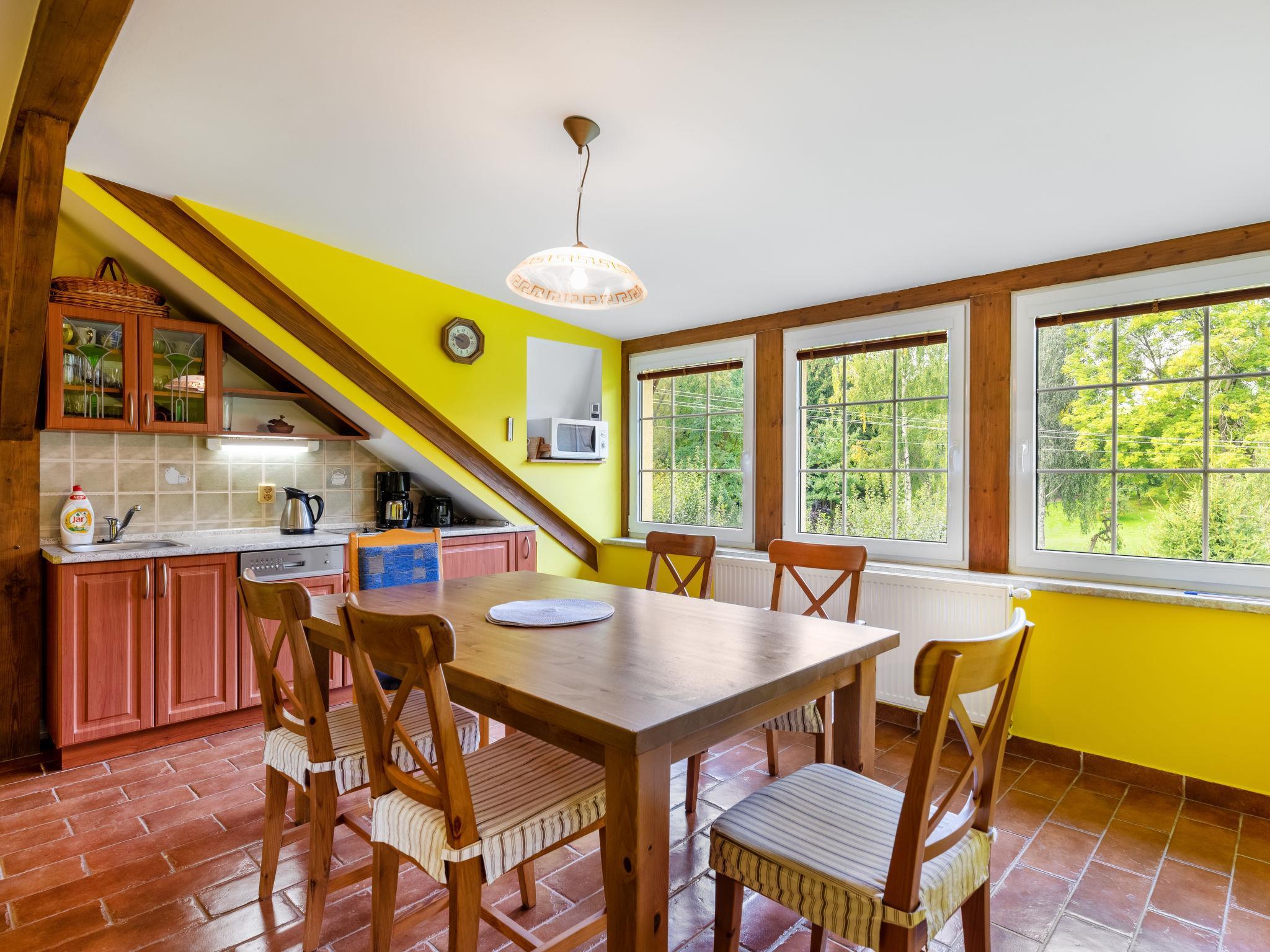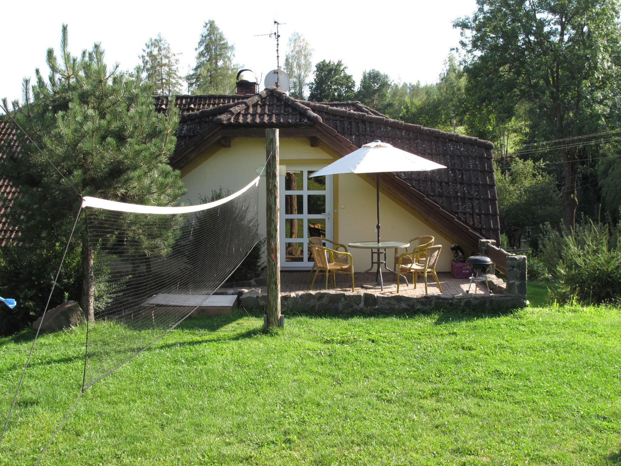 Slemeno, 2 km from Dolní Kalná: Modern, beautiful 2-family house "Relax apartment", 400 m a.s.l.. 900 m from the centre of Slemeno, on the outskirts, 5 km from the centre of Hostinné, 13 km from the centre of Jilemnice, 6 km from the skiing area. For shared use: property 1'200 m2, lawn. Private: swimming pool (above ground) round (3,6 m diameter, depth 80 cm, seasonal availability: 01.Jul. - 31.Aug.). Terrace, garden furniture, barbecue, fireplace, parking (for 2 cars) at the house. Shop 2 km, supermarket 5 km, restaurant 4 km, bus stop 900 m, railway station "Hostinné" 5 km, outdoor swimming pool 3 km, indoor swimming pool 13 km. Golf course (18 hole) 20 km, walking paths from the house, cycle lane 50 m, ski lift 16 km, chair lift 20 km, slopes 6 km, ski rental 16 km, ski school 16 km, children's ski school 16 km, cross country ski track 6 km. Nearby attractions: Jilemnice 13 km, Zvicina 15 km, Vrchlabí 16 km, Trutnov 17 km, Pec pod Snežkou 34 km, Zoo Dvur Králové, zámek Kuks (UNESCO). Well-known ski regions can easily be reached: Knežický vrch - Vrchlabí 16 km, Mladé Buky 20 km, Pec pod Snežkou 34 km. Well-known lakes can easily be reached: Dolce 18 km. Please note: the owner lives in the same residence. Owner lives in separate semi-detached house. Separate grass pitch available including goals and net for ball games.