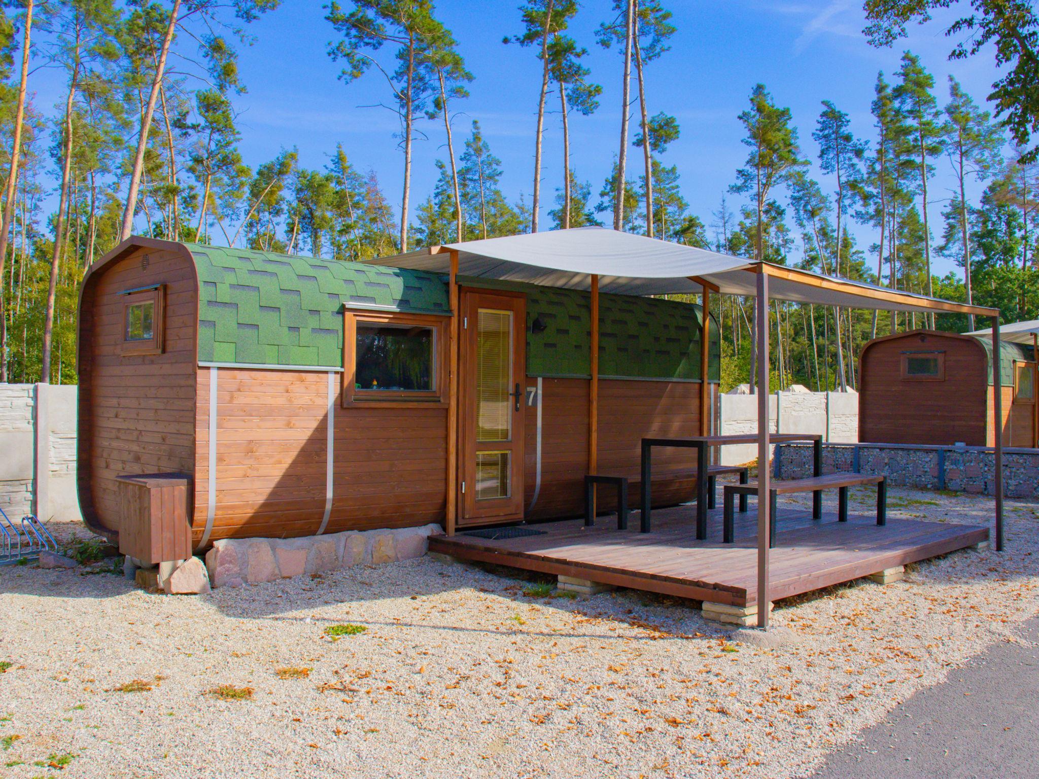 Child friendly holiday village "Kemp Stríbrný rybník". 25 houses in the resort. In the district of Malšova Lhota, 5 km from the centre of Hradec Králové, along the wooded area, on the lake. For shared use: property. Table tennis, boccia (extra), beach volleyball, arbour, barbecue, fireplace, children's playground, bathing jetty. In the complex: reception, restaurant, bar, bistro, playroom, washing machine (for shared use, extra), bicycle rental. Parking (extra) on the premises. Bus stop "Stríbrný rybník" 700 m, railway station "Blešno" 5 km, sandy beach 50 m, bathing lake "50". Sports harbour, minigolf, sports centre, walking paths from the house, cycle lane, fishing possibilities 50 m. Nearby attractions: Adventure park Firmsport, letní kino, tutistický vlácek do lesa, Stezka siluet, Rytírské hradište 3 km, Park Na Vetvi 3 km, Obory se zverí 4.2 km, Obrí akvárium, Botanická zahrada 4.7 km. Hiking paths: Pohádková, Vodnická stezka 6 km, Planetárium, planetární stezka 8.4 km, Zoopark Stežery, Rozhledna Milír 15 km. Please note: entertainment in the season. Suitable for families. Fishing [permit required]. The photograph shows a typical example.