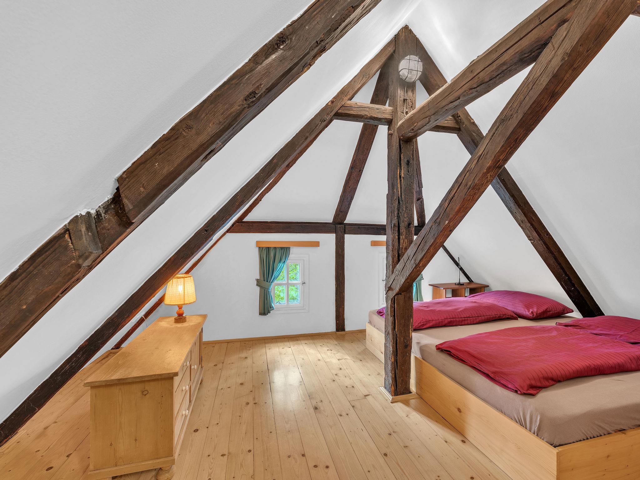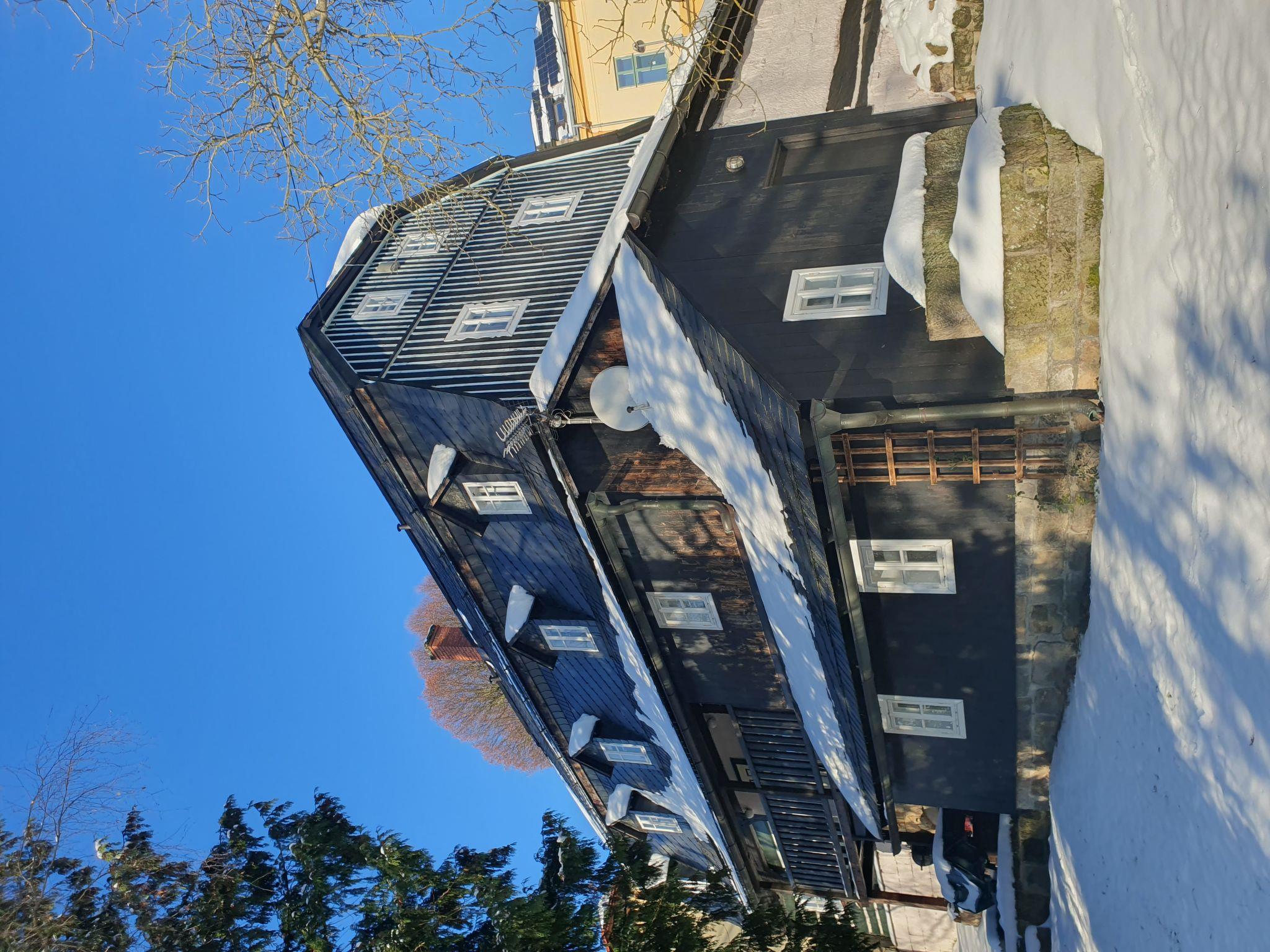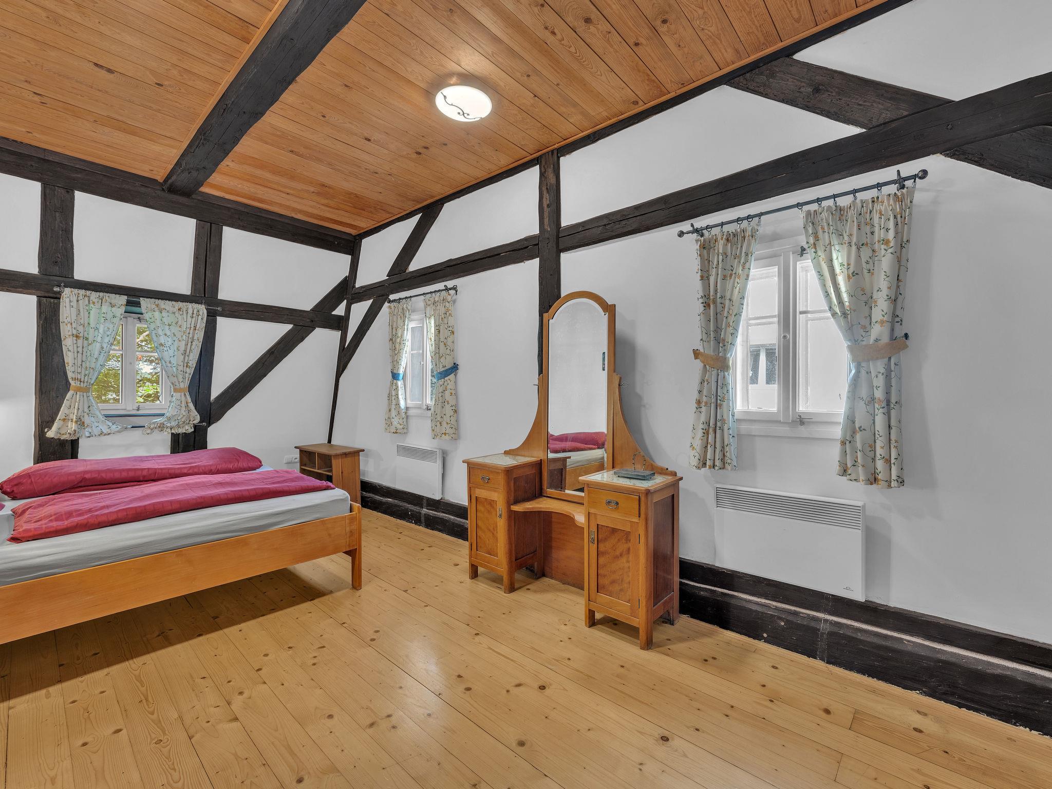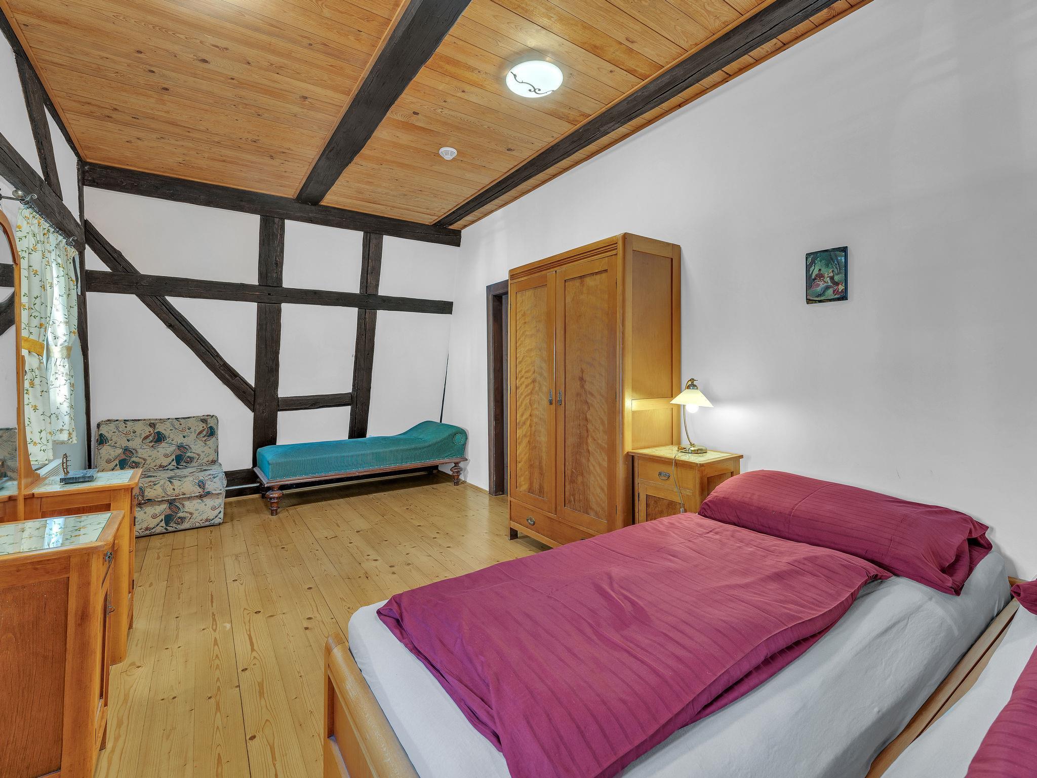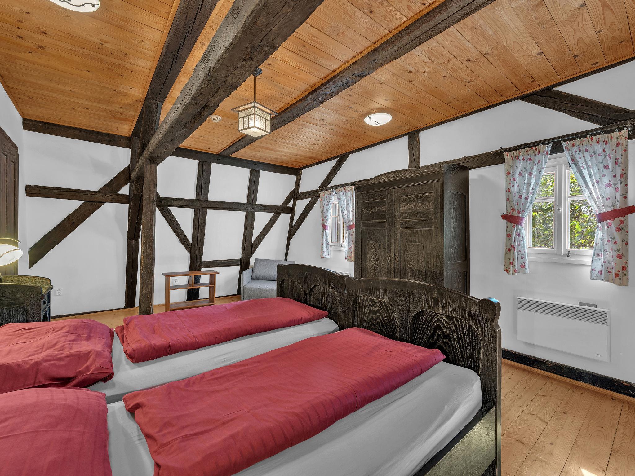 6-room house 140 m2 on 3 levels. Antique furnishings: living room with dining table, international TV channels and tiled stove. 1 room with 1 double bed and shower/WC. Kitchenette (oven, dishwasher, 4 ceramic glass hob hotplates, kettle, microwave). Sep. WC. On the lower ground floor: shower/WC, Sauna. Upper floor: 1 room with 1 double bed and shower/bidet/WC. 1 room with 1 double bed and shower/bidet/WC. Top floor: 1 room with sloping ceilings with 1 double bed and shower/WC. 1 room with sloping ceilings with 1 double bed and bath/WC. Heating. View of the garden and the countryside. Facilities: washing machine. Internet (WiFi, free). Please note: suitable for families. Non-smoking house. Smoke alarm. On the ground floor, there is a second separate kitchen unit with a microwave oven, refrigerator and stove.