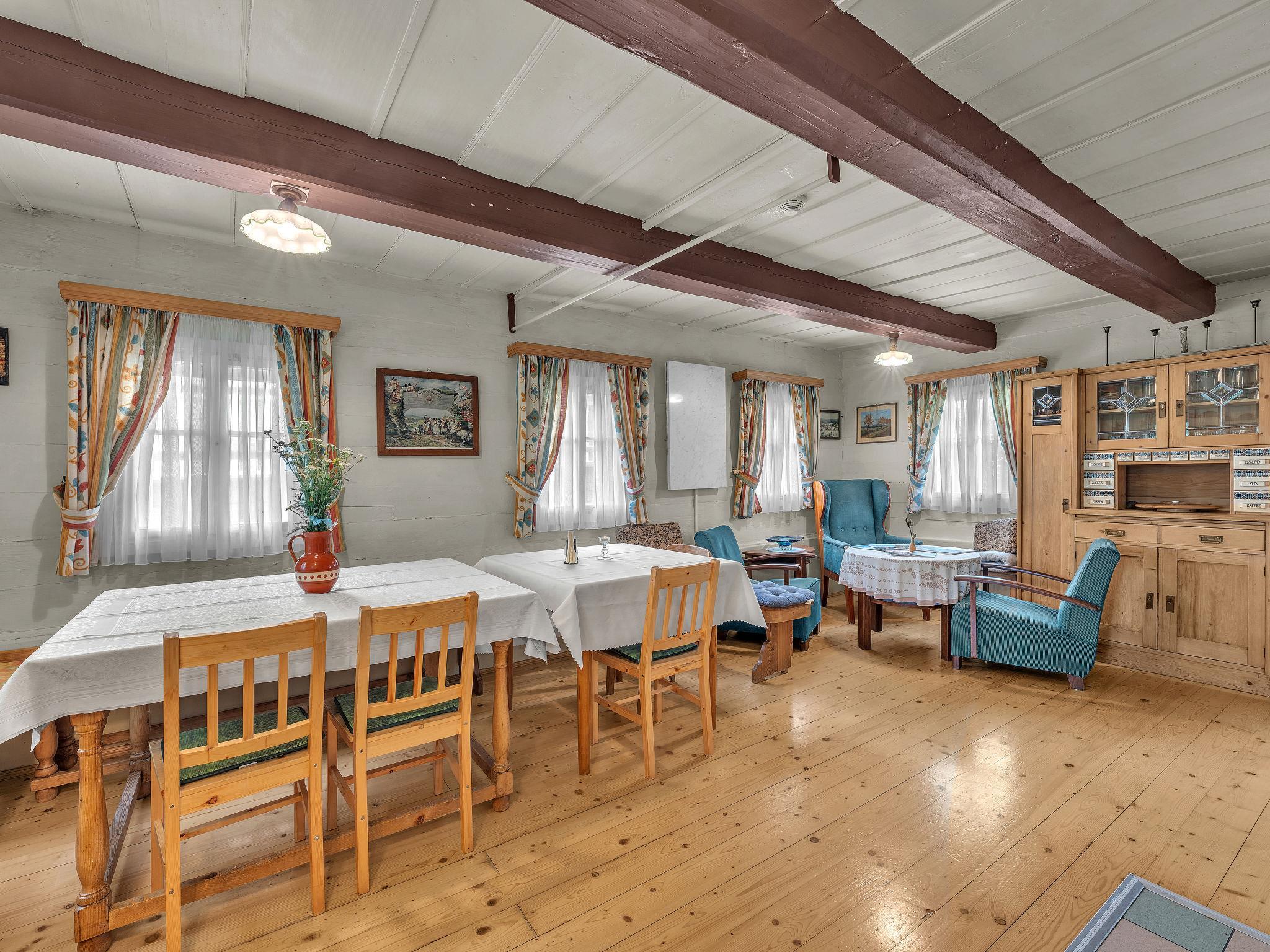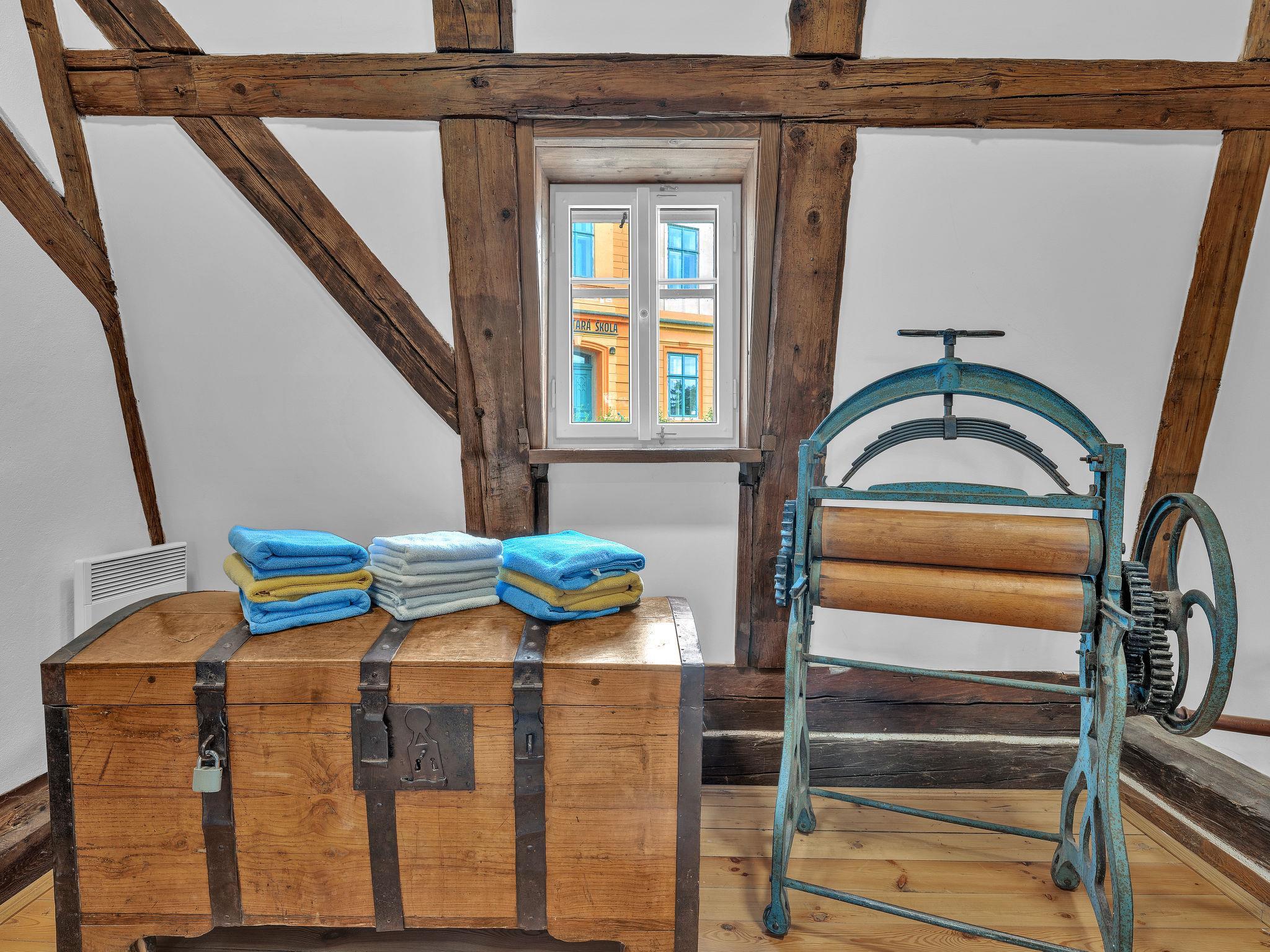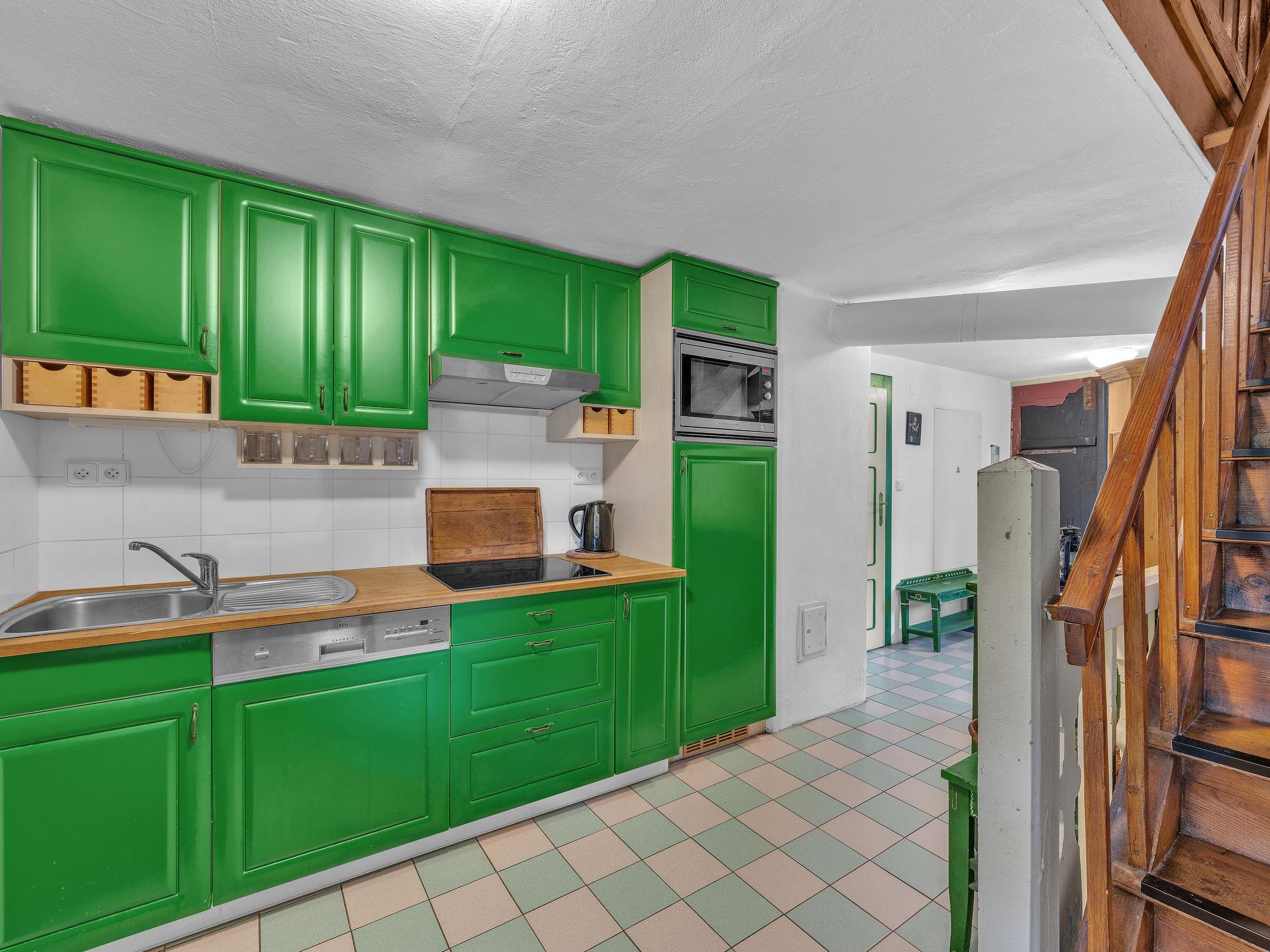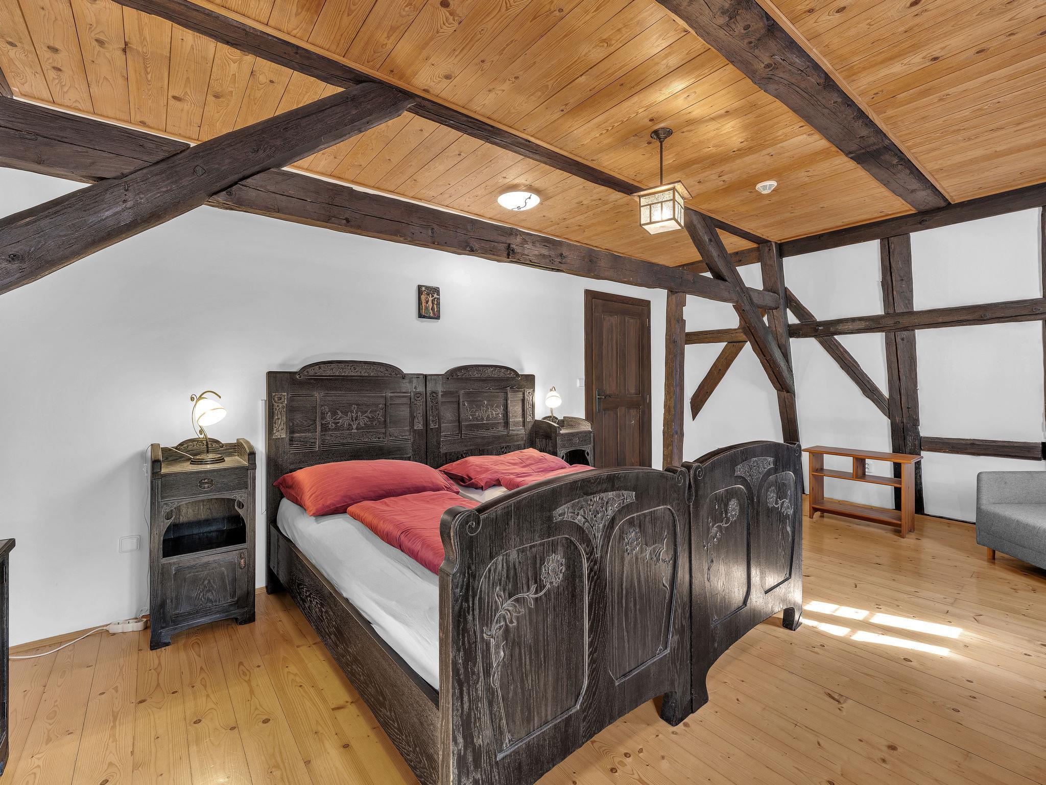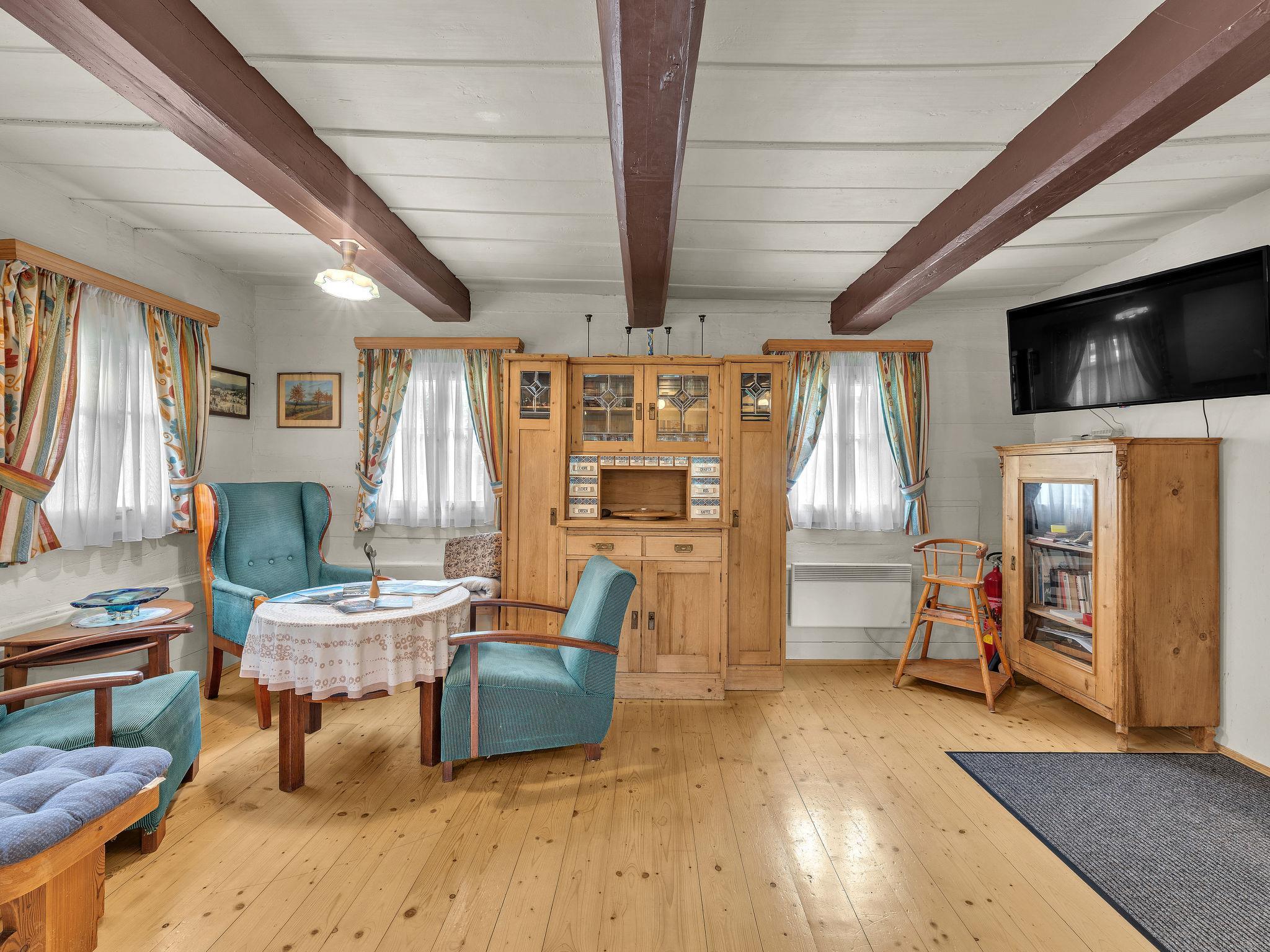 6-room house 140 m2 on 3 levels. Antique furnishings: living room with dining table, international TV channels and tiled stove. 1 room with 1 double bed and shower/WC. Kitchenette (oven, dishwasher, 4 ceramic glass hob hotplates, kettle, microwave). Sep. WC. On the lower ground floor: shower/WC, Sauna. Upper floor: 1 room with 1 double bed and shower/bidet/WC. 1 room with 1 double bed and shower/bidet/WC. Top floor: 1 room with sloping ceilings with 1 double bed and shower/WC. 1 room with sloping ceilings with 1 double bed and bath/WC. Heating. View of the garden and the countryside. Facilities: washing machine. Internet (WiFi, free). Please note: suitable for families. Non-smoking house. Smoke alarm. On the ground floor, there is a second separate kitchen unit with a microwave oven, refrigerator and stove.