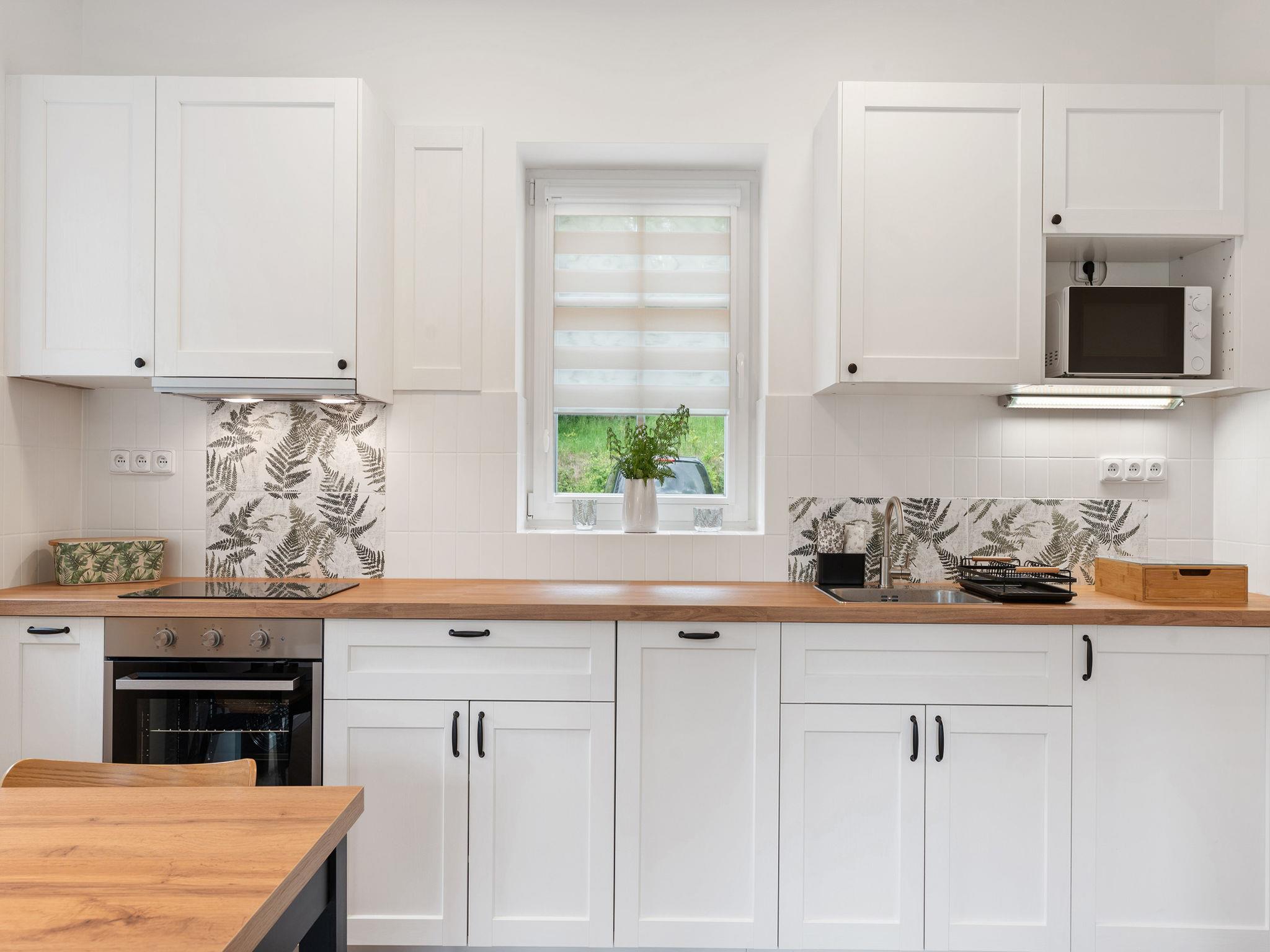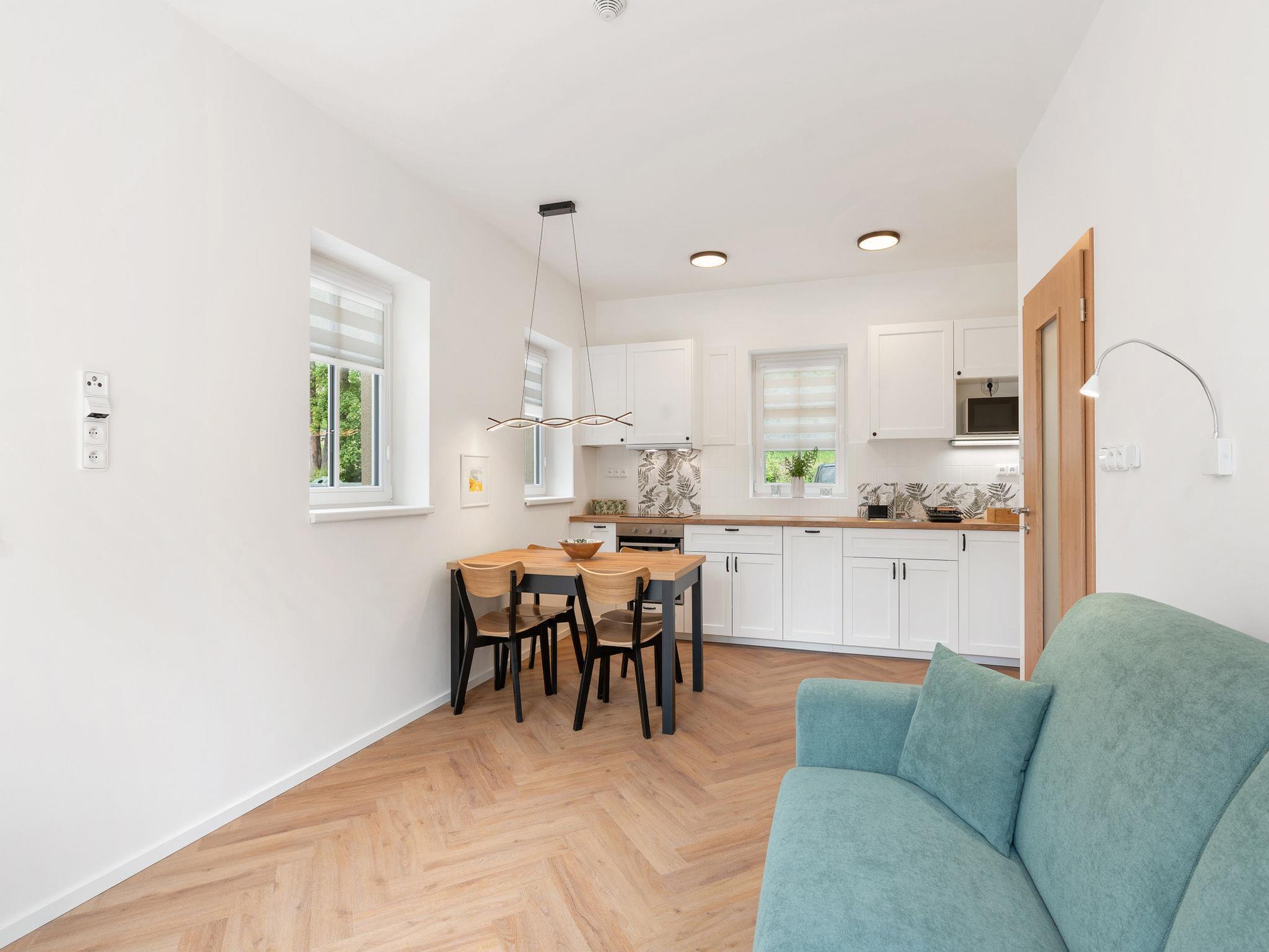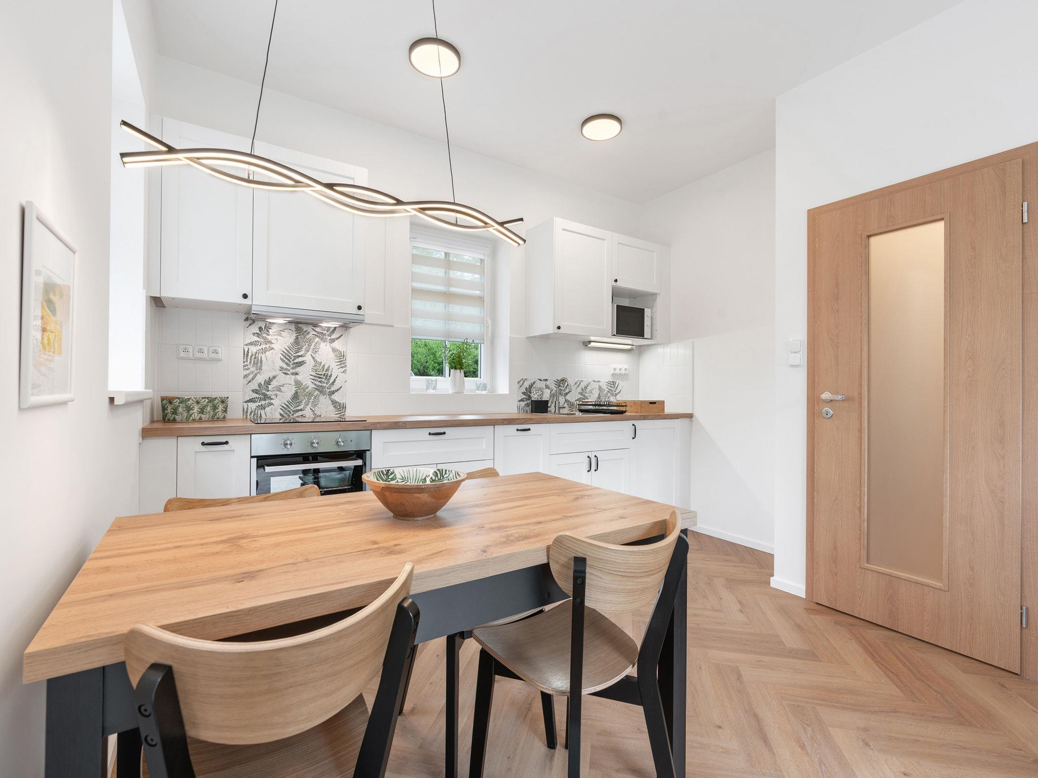 2-room apartment on the ground floor. Very beautiful furnishings: living/sleeping room with 1 double sofabed (140 cm), TV. Exit to the balcony. 1 room with 1 double bed. Kitchenette (oven, dishwasher, 2 ceramic glass hob hotplates, kettle, microwave, electric coffee machine) with dining nook. Shower/WC. Balcony. Balcony furniture. Beautiful view of the garden and the forest. Facilities: hair dryer. Internet (WiFi, free). Parking. Suitable for families. Maximum 2 pets/ dogs allowed.