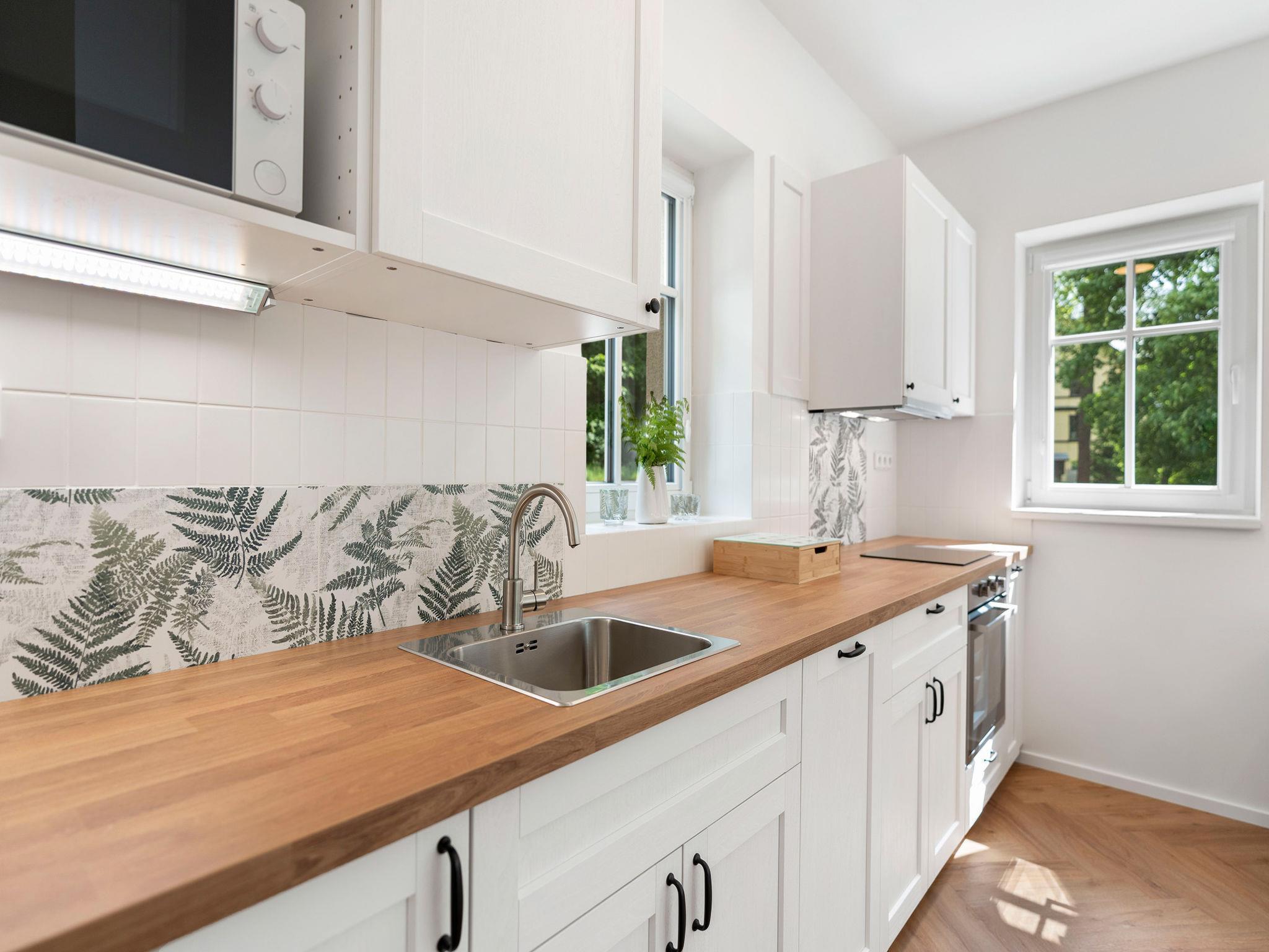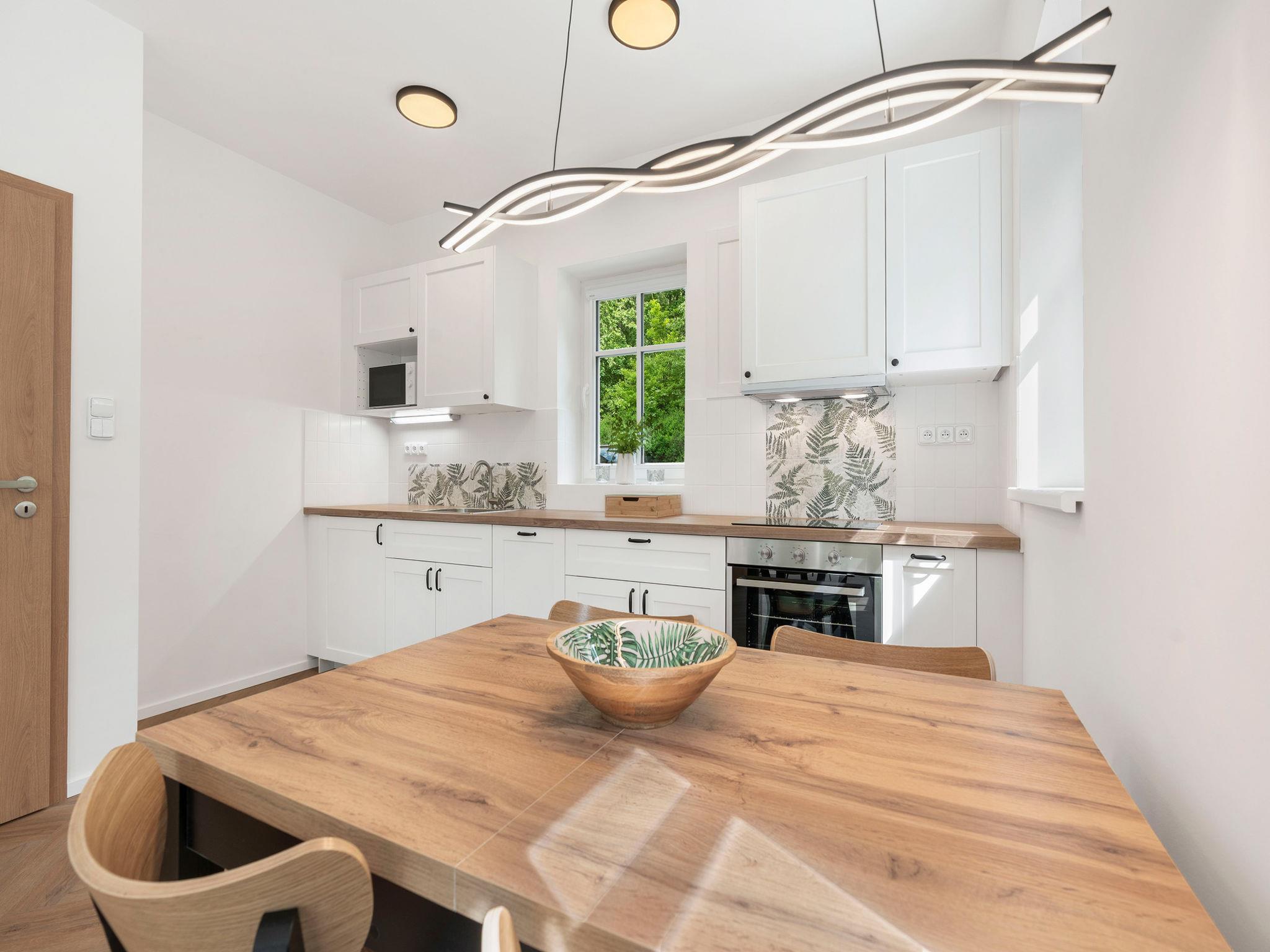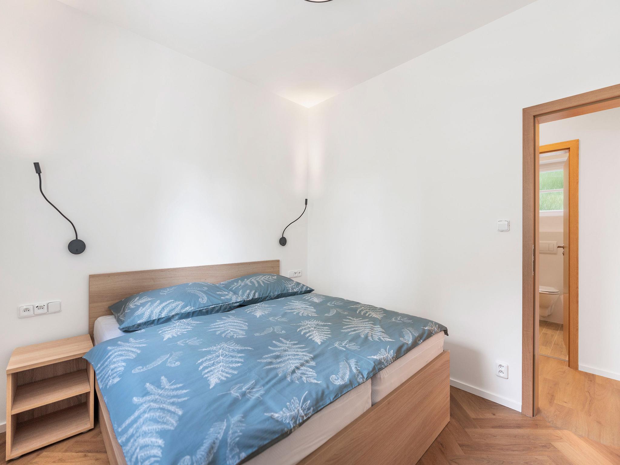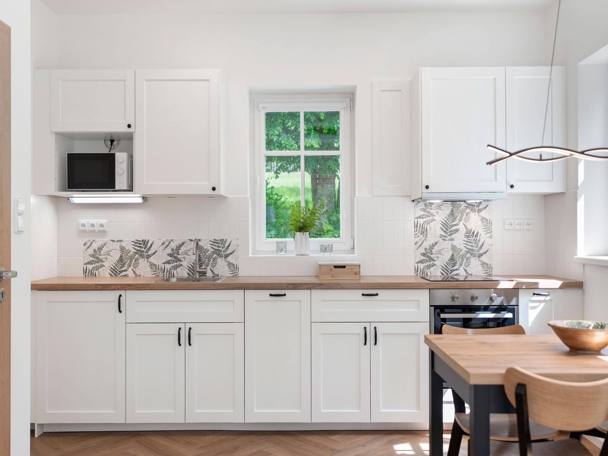 2-room apartment on the ground floor. Very beautiful furnishings: living/sleeping room with 1 double sofabed (140 cm), TV. Exit to the balcony. 1 room with 1 double bed. Kitchenette (oven, dishwasher, 2 ceramic glass hob hotplates, kettle, microwave, electric coffee machine) with dining nook. Shower/WC. Balcony. Balcony furniture. Beautiful view of the garden and the forest. Facilities: hair dryer. Internet (WiFi, free). Parking. Suitable for families. Maximum 2 pets/ dogs allowed.