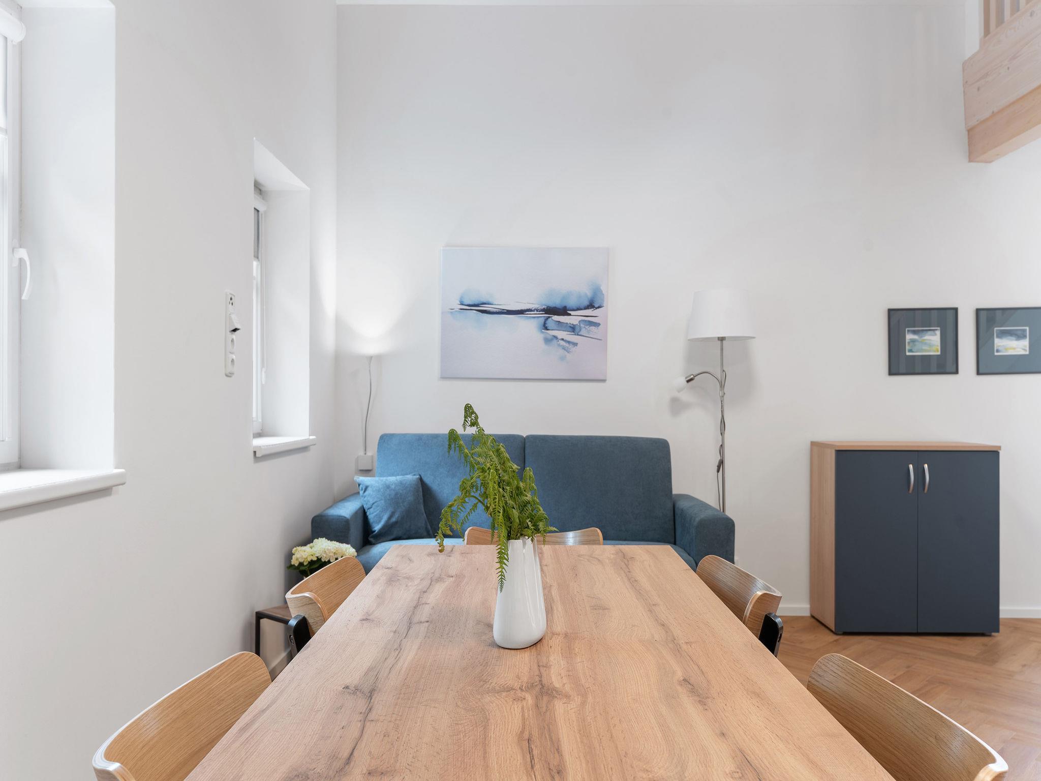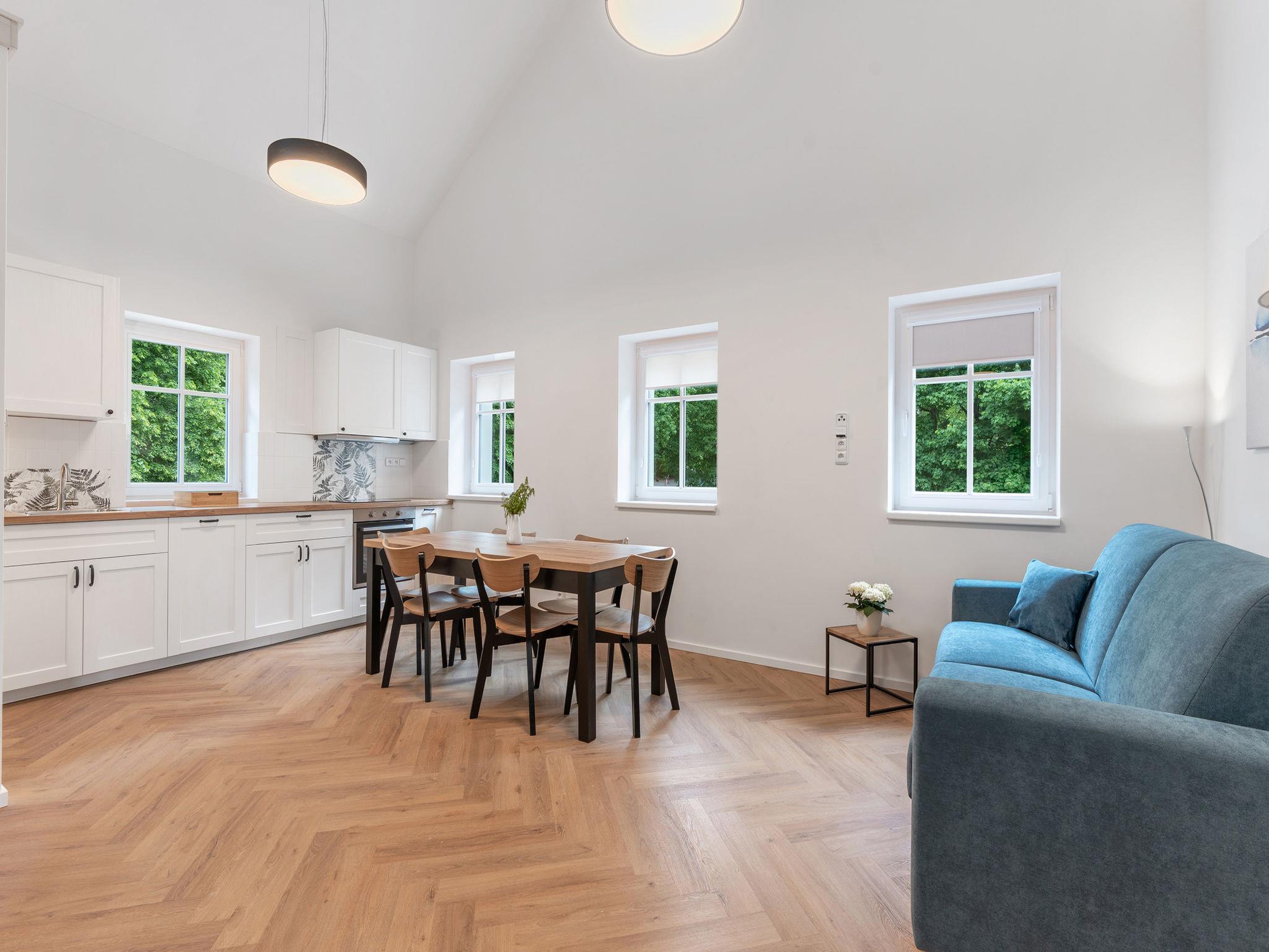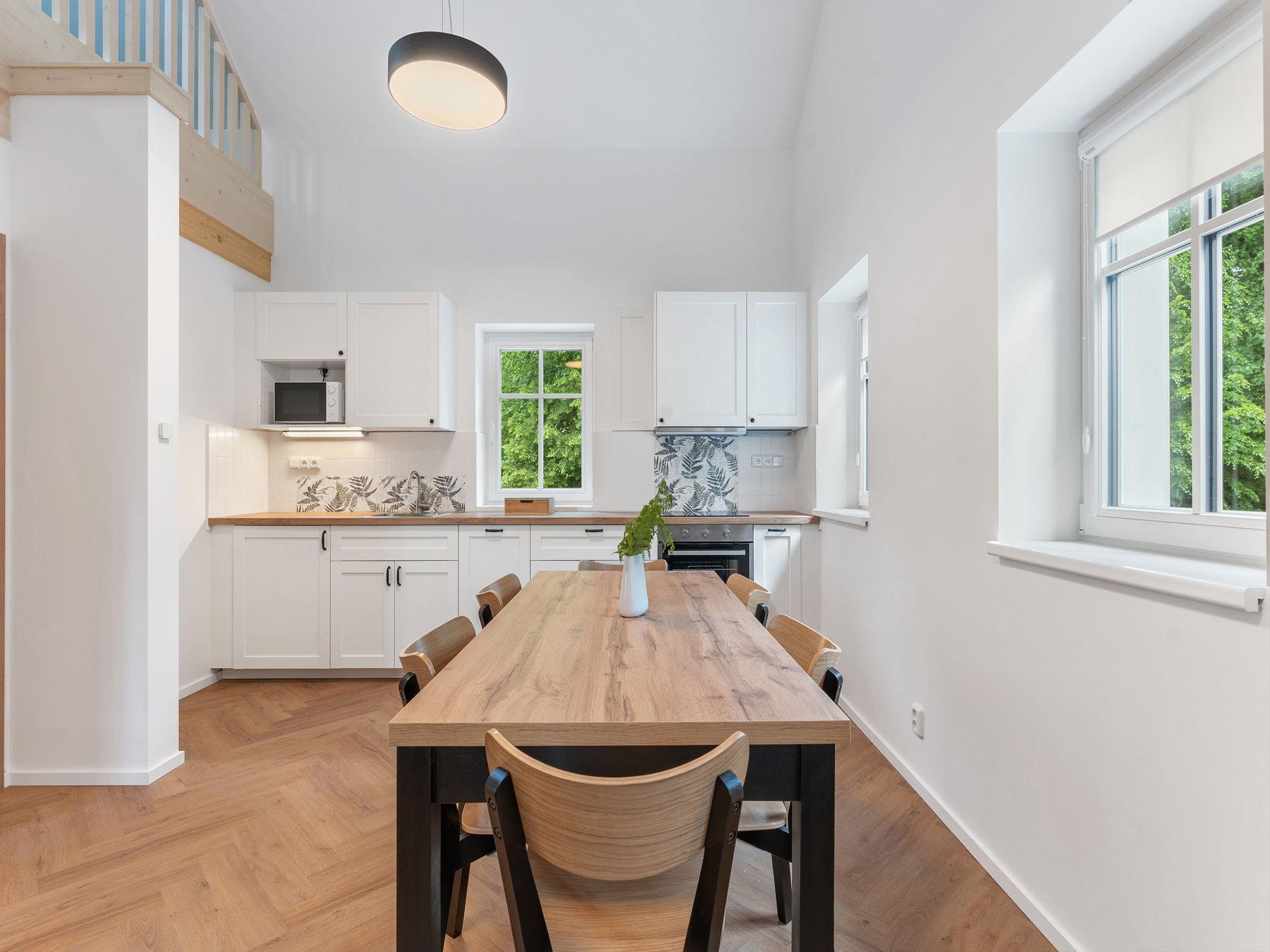 2-room Loft on 2 levels on 1st floor. Very beautiful furnishings: open large living/sleeping room with 1 double sofabed (140 cm), 1 double bed and TV. Kitchenette (oven, dishwasher, 4 ceramic glass hob hotplates, kettle, microwave, electric coffee machine) with dining nook. Shower/WC. Upper floor: gallery with 1 double bed. Beautiful view of the garden and the forest. Facilities: hair dryer. Internet (WiFi, free). Parking. Suitable for families. Maximum 2 pets/ dogs allowed. Instead of an enclosed bedroom, some sleeping areas are located in an open-plan area (gallery, alcove, etc.).