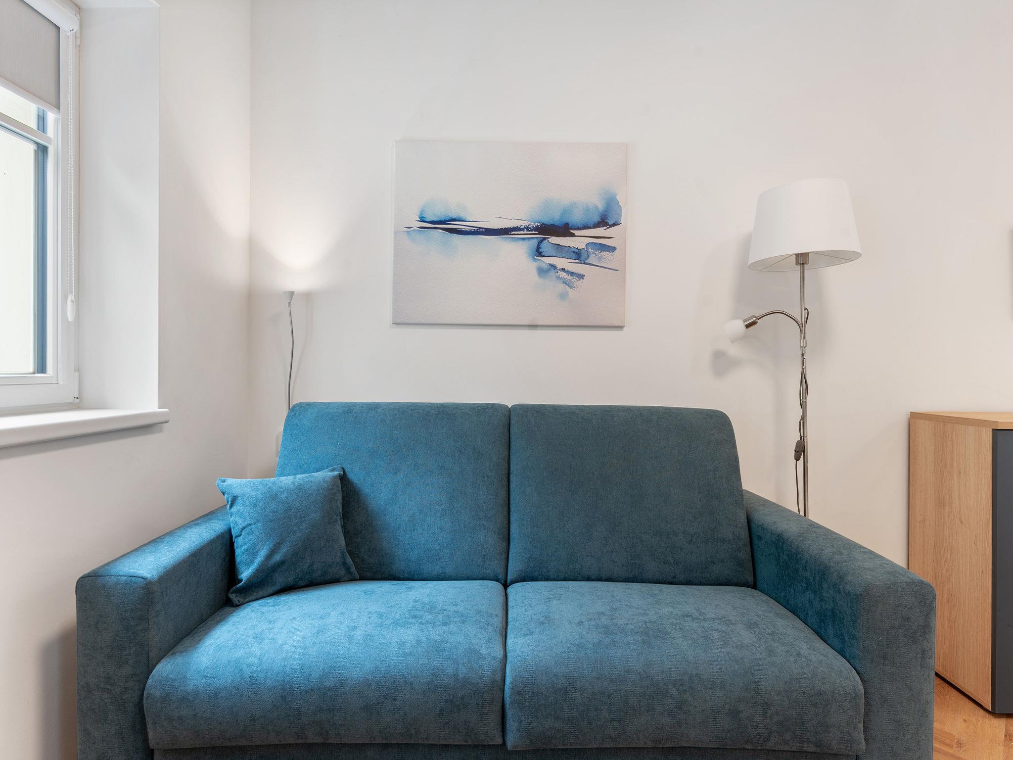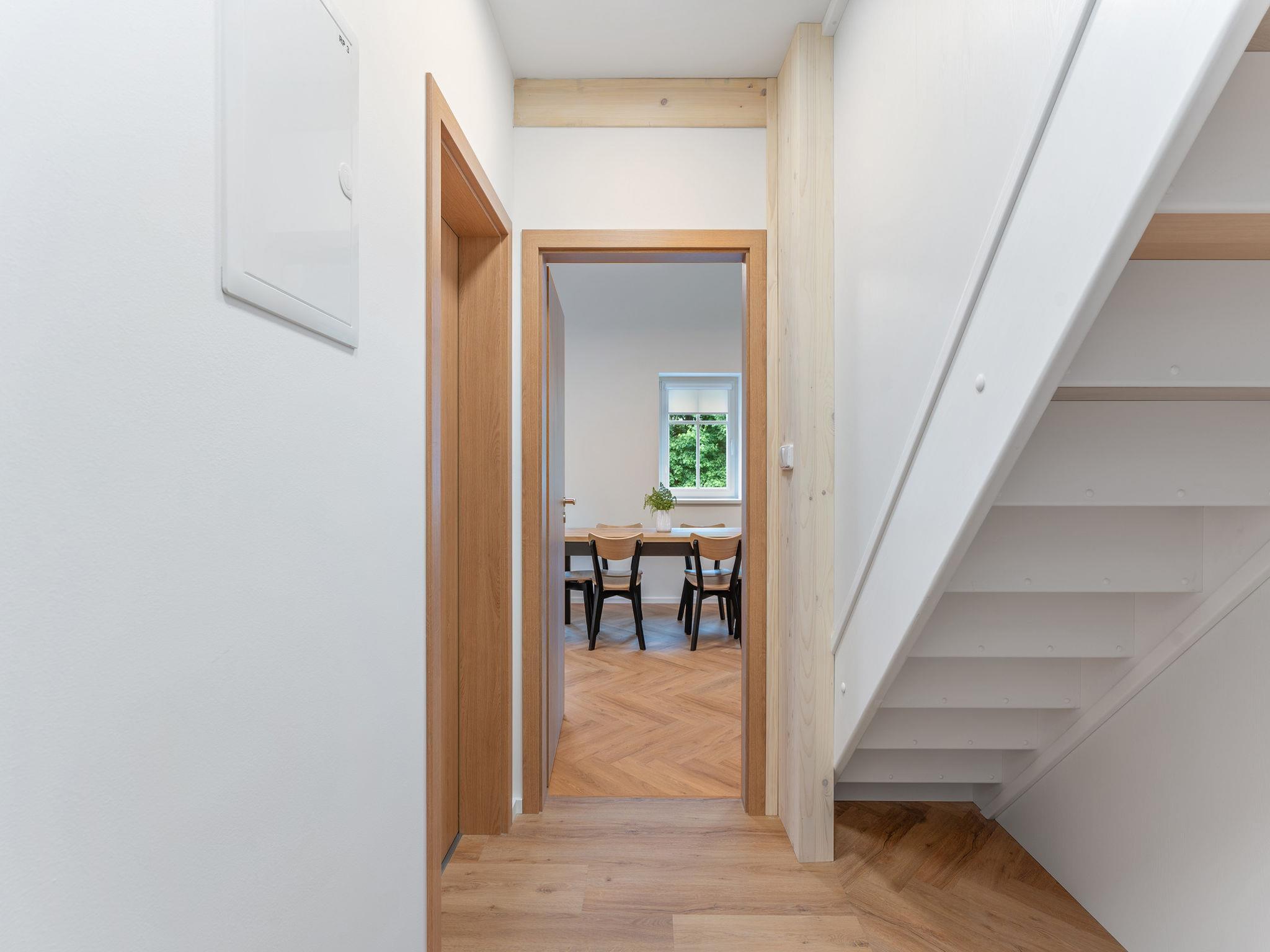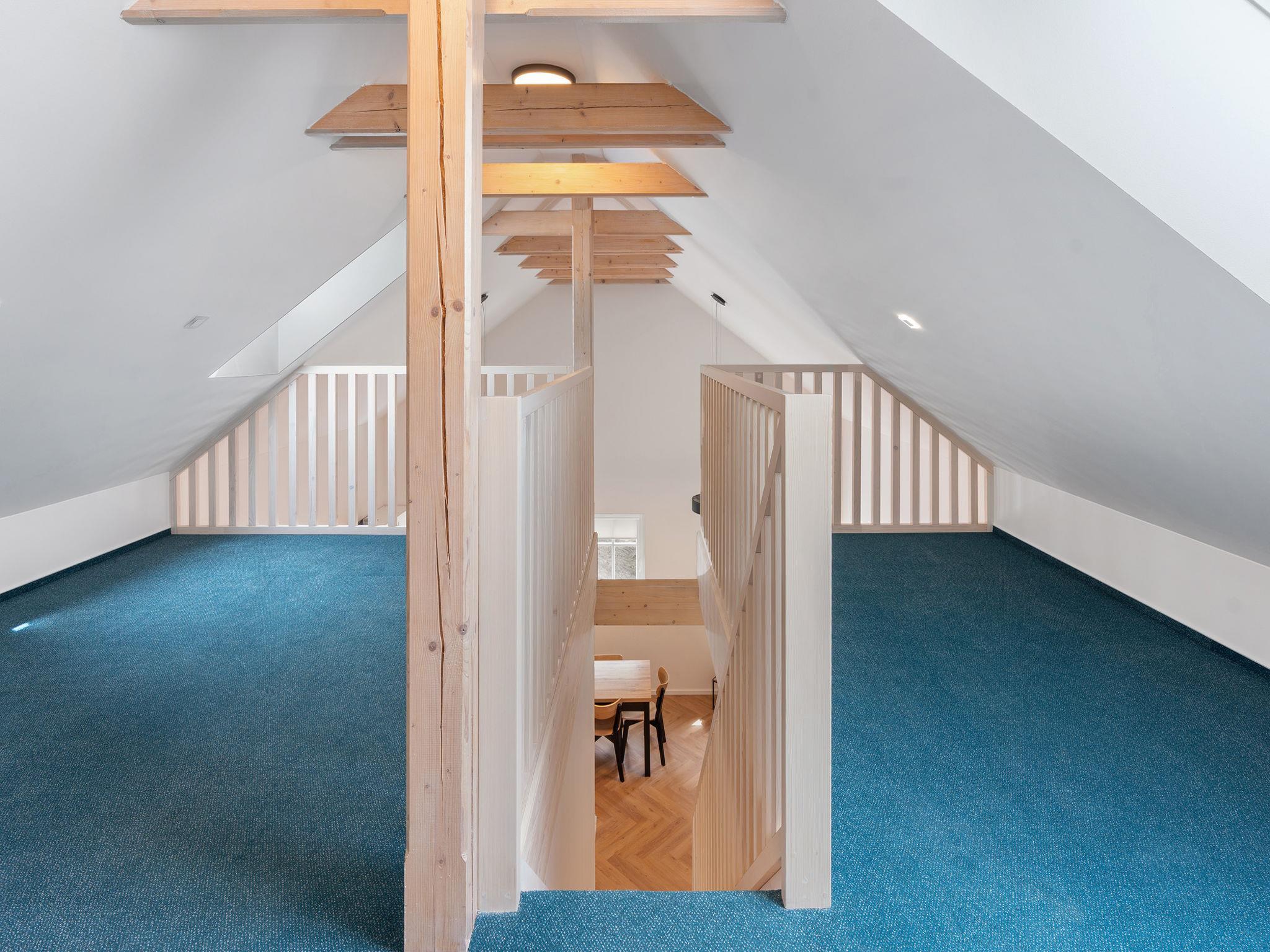 2-room Loft on 2 levels on 1st floor. Very beautiful furnishings: open large living/sleeping room with 1 double sofabed (140 cm), 1 double bed and TV. Kitchenette (oven, dishwasher, 4 ceramic glass hob hotplates, kettle, microwave, electric coffee machine) with dining nook. Shower/WC. Upper floor: gallery with 1 double bed. Beautiful view of the garden and the forest. Facilities: hair dryer. Internet (WiFi, free). Parking. Suitable for families. Maximum 2 pets/ dogs allowed. Instead of an enclosed bedroom, some sleeping areas are located in an open-plan area (gallery, alcove, etc.).