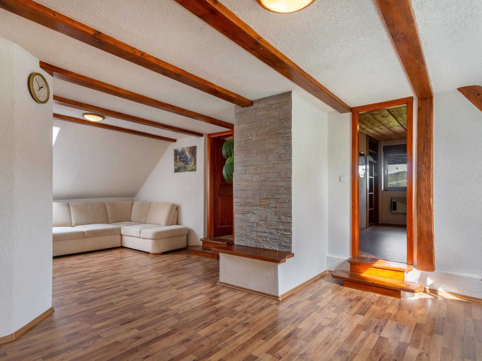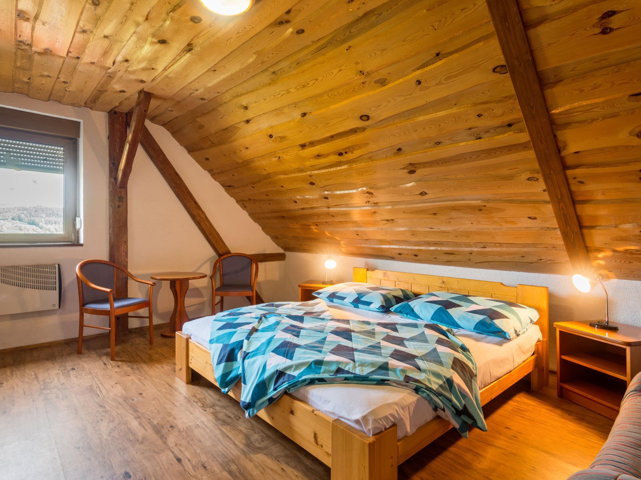 6-room house 140 m2 on 2 levels. Rustic and cosy furnishings: living room with satellite TV (flat screen), radio and DVD. Billiard room with open-hearth fireplace and dining table. 1 room with 1 double bed. 1 room with 1 double bed. Kitchen (oven, dishwasher, 4 ceramic glass hob hotplates, toaster, kettle, microwave, electric coffee machine) with dining nook. Shower, shower/bidet/WC, double hand-basin, Sauna. Electric heating. Upper floor: 1 room with sloping ceilings with 1 double bed. 1 room with sloping ceilings with 1 double bed. Shower/WC. Electric heating. Patio. Terrace furniture, barbecue. Panoramic view. Facilities: washing machine, sauna, children's high chair, baby cot. Internet (WiFi, free). Please note: non-smokers only. Maximum 3 pets/ dogs allowed.