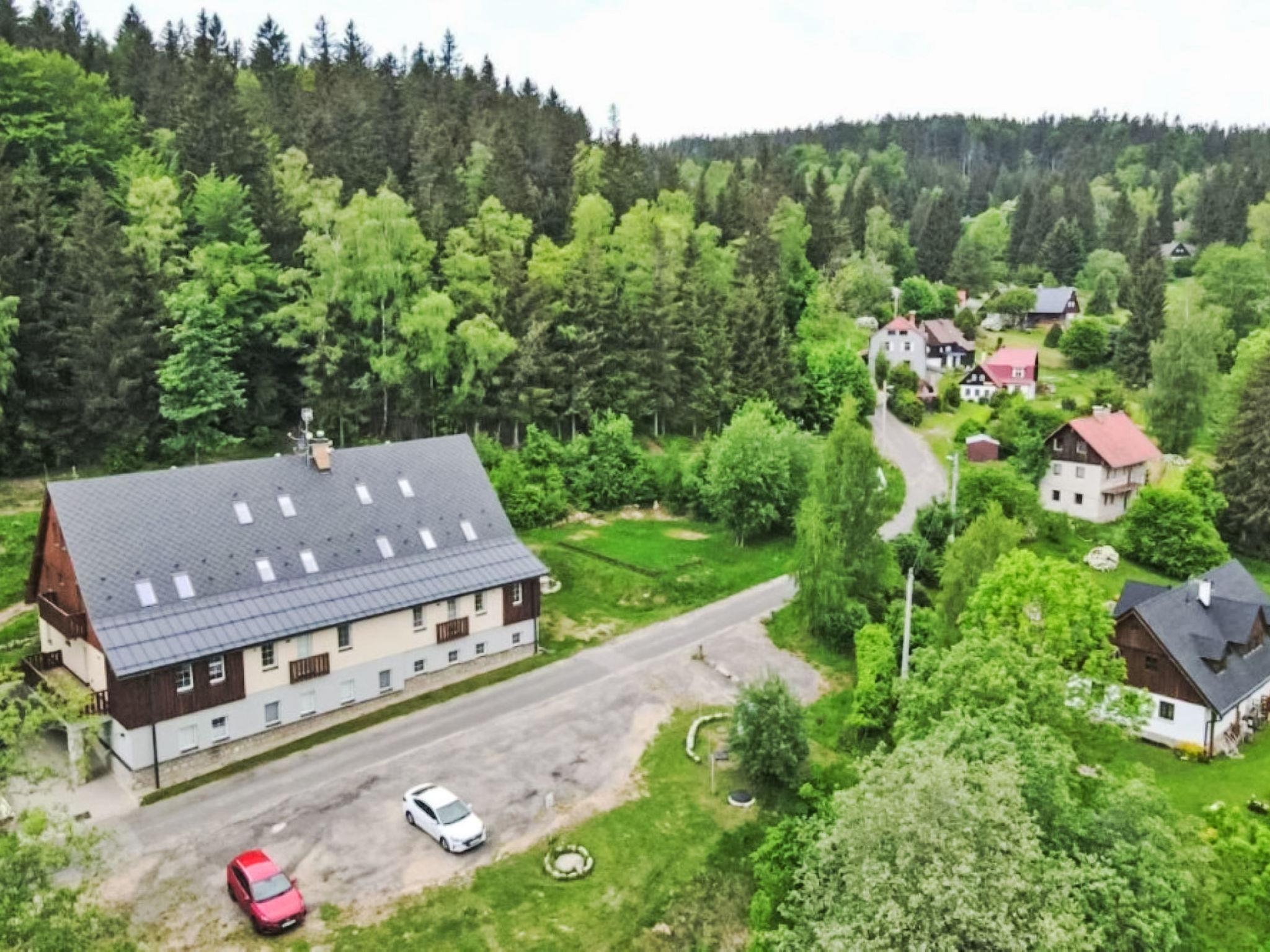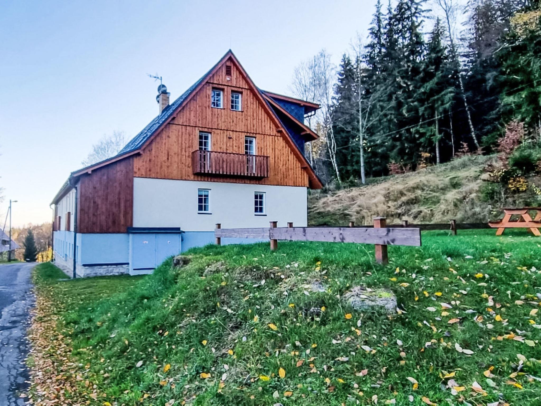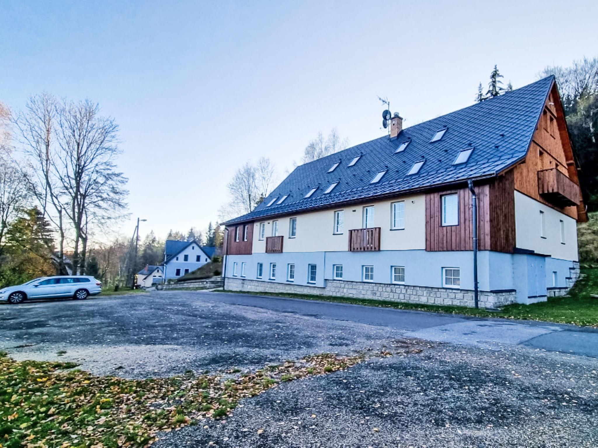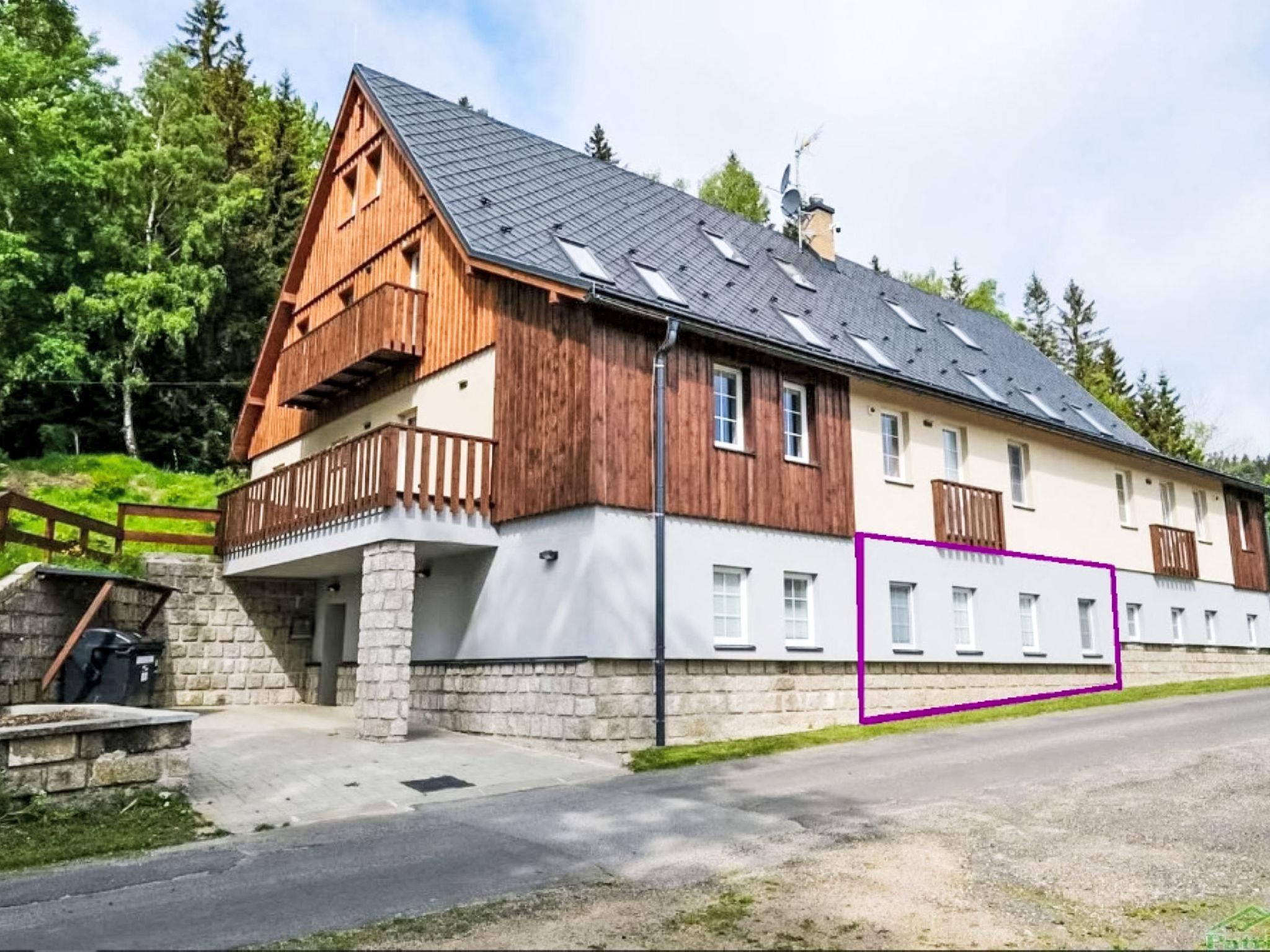 5 km from Bedrichov: Beautiful cottage, 3 storeys, detached, built in 2020. 10 apartments in the property. In the resort Hranicná, 1 km from the centre of Janov nad Nisou, in a quiet position, 800 m from the skiing area. For shared use: property with lawn. Garden furniture. Storeroom available. Parking (for 2 cars) at the house. Grocery 1 km, restaurant 3 km, pub garden 1.5 km, bus stop "Janov nad Nisou, samoobsluha" 900 m, railway station "Lucany nad Nisou" 8 km, outdoor swimming pool 3 km. Indoor tennis centre 1.5 km, walking paths from the house, cycle lane 300 m, ski lift 800 m, chair lift 2 km, slopes 800 m, ski rental 2 km, ski school 2 km, cross country ski track 300 m, children's playground 1 km. Nearby attractions: Pumptrack Janov nad Nisou 1 km, Královka 3.5 km, Bobová dráha 1,7 km, Slovanka, Albert 3.5 km, Bedrichovská vodní nádrž, Bramberk, Josefuv Dul vodní nádrž 6 km, Liberec: Zoo, Aquapark, iQLANDIA 12 km, Szklarska Poreba 42 km. Well-known ski regions can easily be reached: Bedrichov 2 km, Severák Hrabetice 6 km, U vodárny 1.5 km. Hiking paths: Jizerská magistrála 300 m, Lanový park Arthur 6 km.