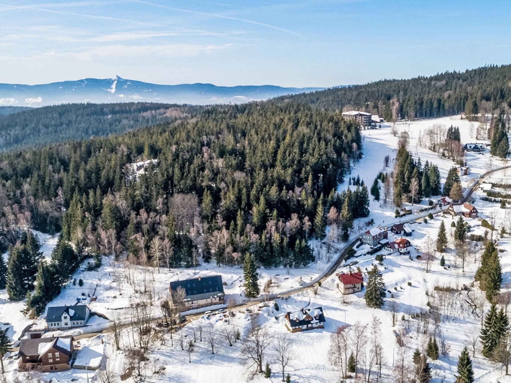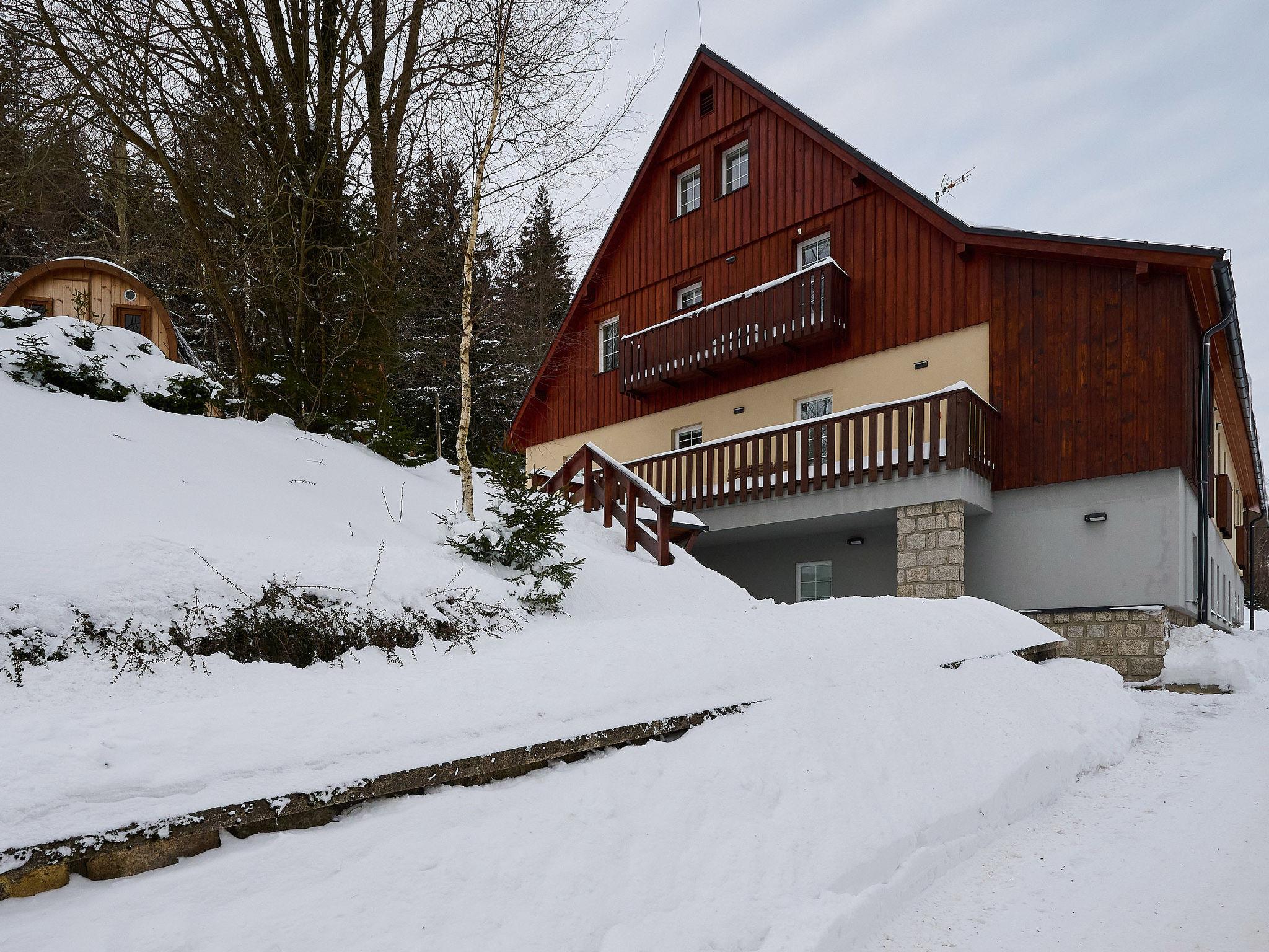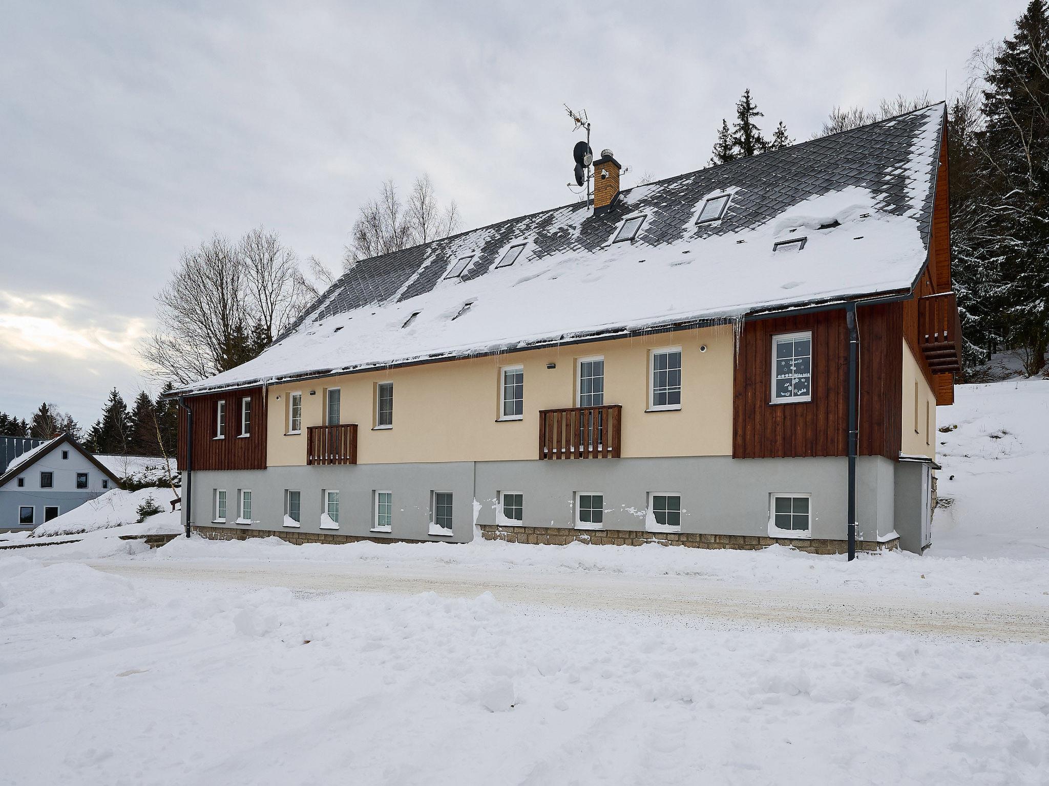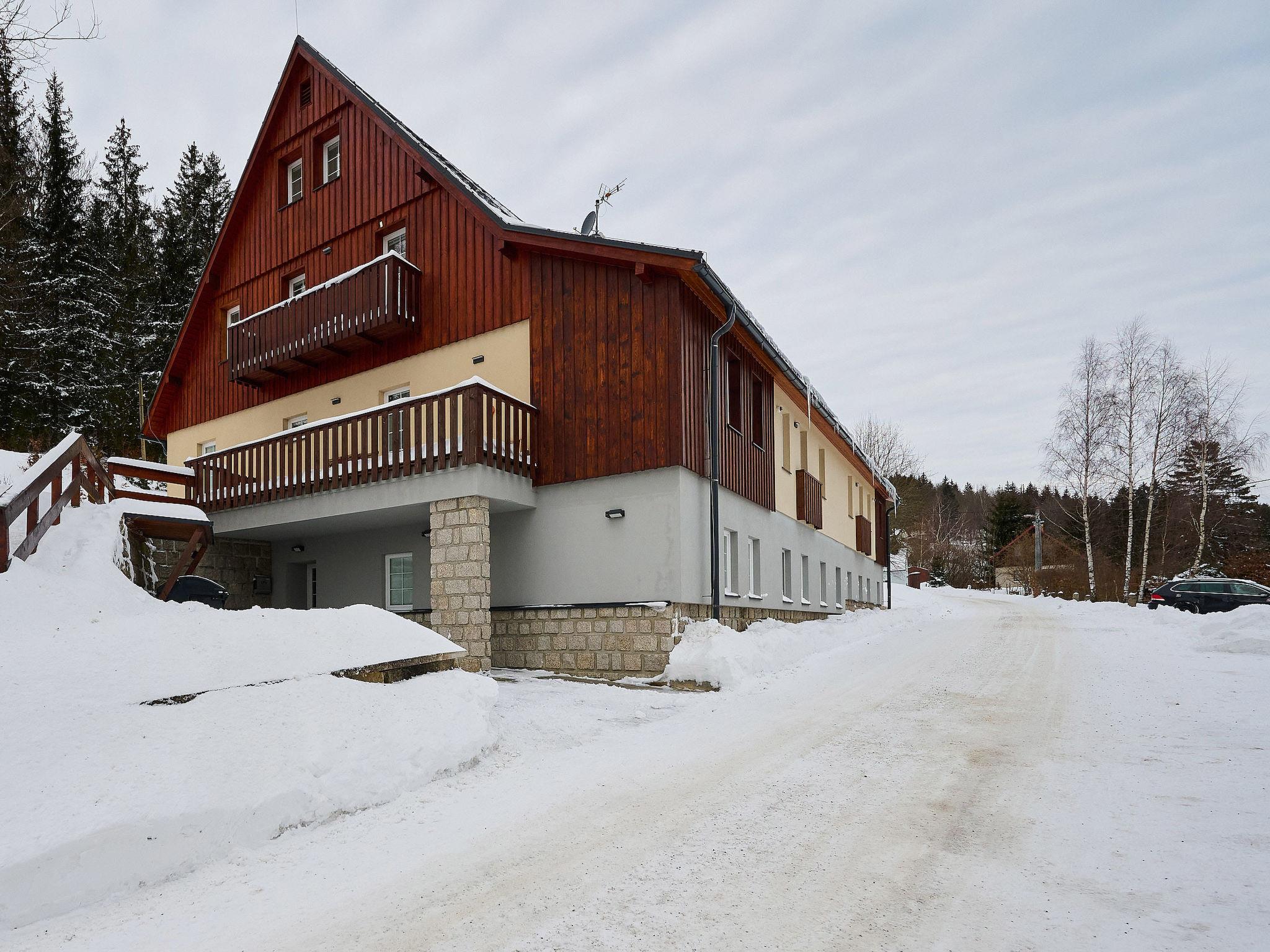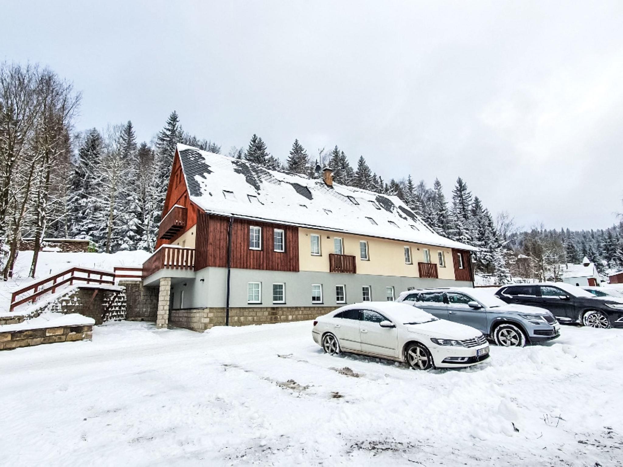 5 km from Bedrichov: Beautiful cottage, 3 storeys, detached, built in 2020. 10 apartments in the property. In the resort Hranicná, 1 km from the centre of Janov nad Nisou, in a quiet position, 800 m from the skiing area. For shared use: property with lawn. Garden furniture. Storeroom available. Parking (for 2 cars) at the house. Grocery 1 km, restaurant 3 km, pub garden 1.5 km, bus stop "Janov nad Nisou, samoobsluha" 900 m, railway station "Lucany nad Nisou" 8 km, outdoor swimming pool 3 km. Indoor tennis centre 1.5 km, walking paths from the house, cycle lane 300 m, ski lift 800 m, chair lift 2 km, slopes 800 m, ski rental 2 km, ski school 2 km, cross country ski track 300 m, children's playground 1 km. Nearby attractions: Pumptrack Janov nad Nisou 1 km, Královka 3.5 km, Bobová dráha 1,7 km, Slovanka, Albert 3.5 km, Bedrichovská vodní nádrž, Bramberk, Josefuv Dul vodní nádrž 6 km, Liberec: Zoo, Aquapark, iQLANDIA 12 km, Szklarska Poreba 42 km. Well-known ski regions can easily be reached: Bedrichov 2 km, Severák Hrabetice 6 km, U vodárny 1.5 km. Hiking paths: Jizerská magistrála 300 m, Lanový park Arthur 6 km.