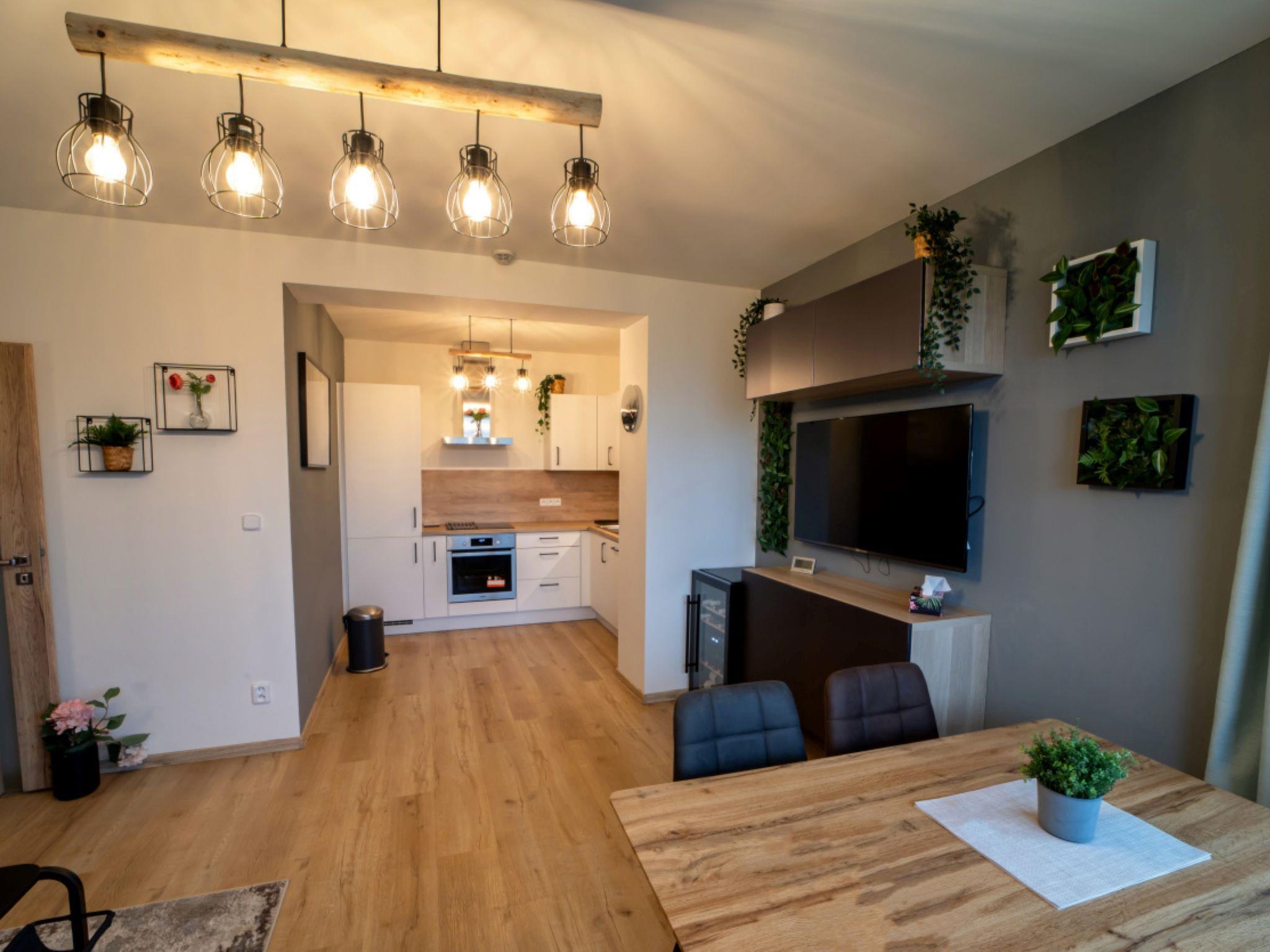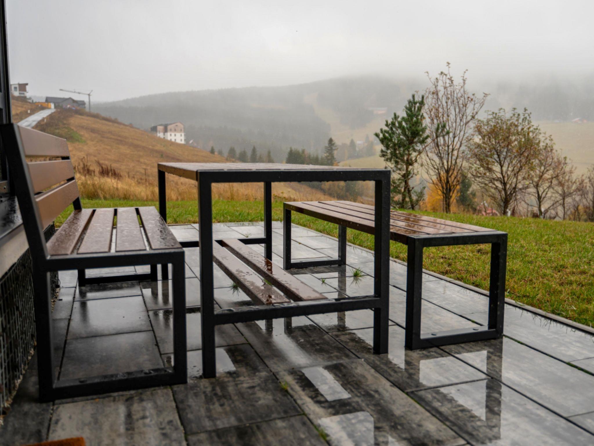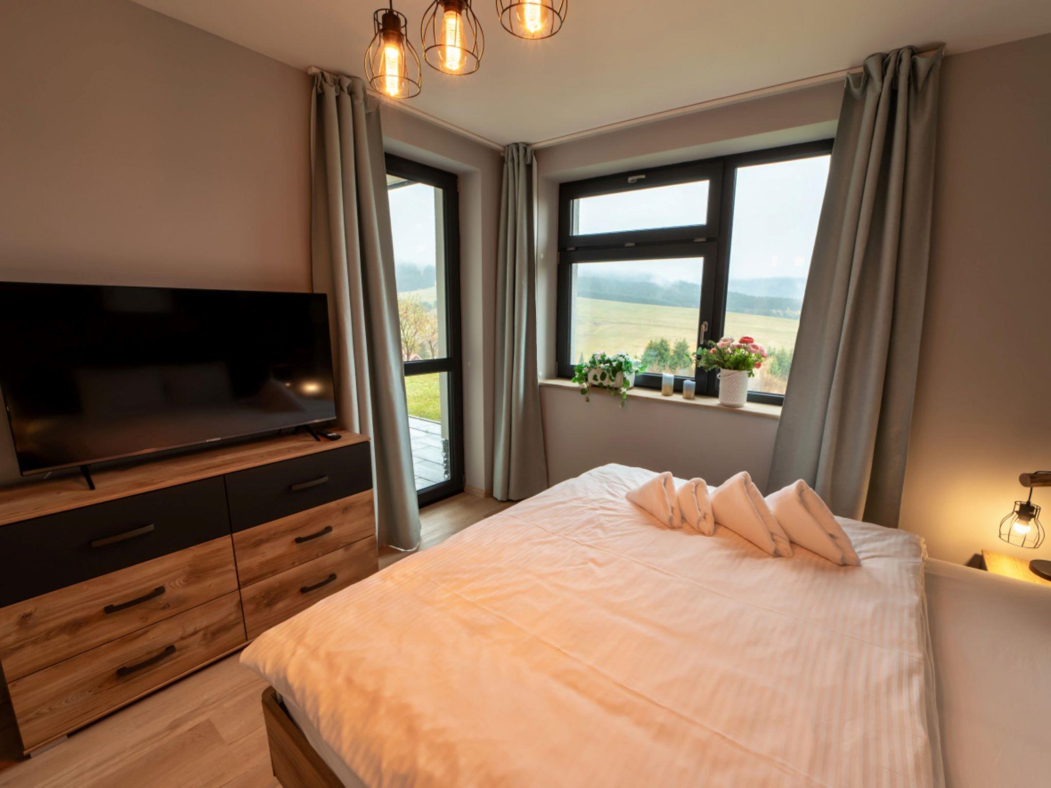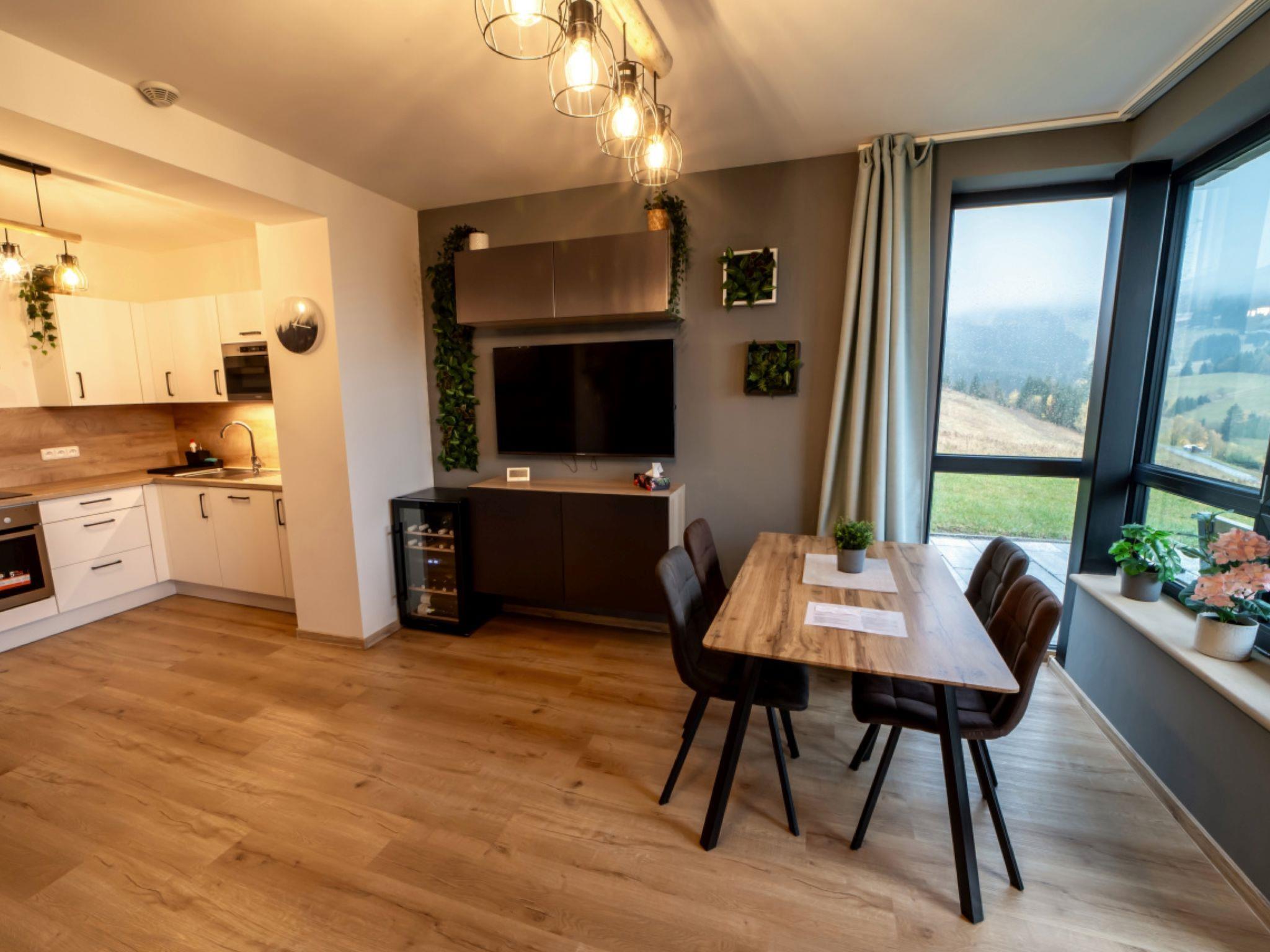 "Výhledy bez hranic", 2-room apartment 51 m2, on the ground floor. Beautiful and modern furnishings: living room with 1 double sofabed and TV. Exit to the terrace. 1 room with 1 double bed. Kitchenette (oven, dishwasher, microwave, electric coffee machine). Shower, sep. WC. Terrace. Terrace furniture. Marvellous view of the mountains. Facilities: Internet (WiFi). Garage. Please note: non-smokers only.