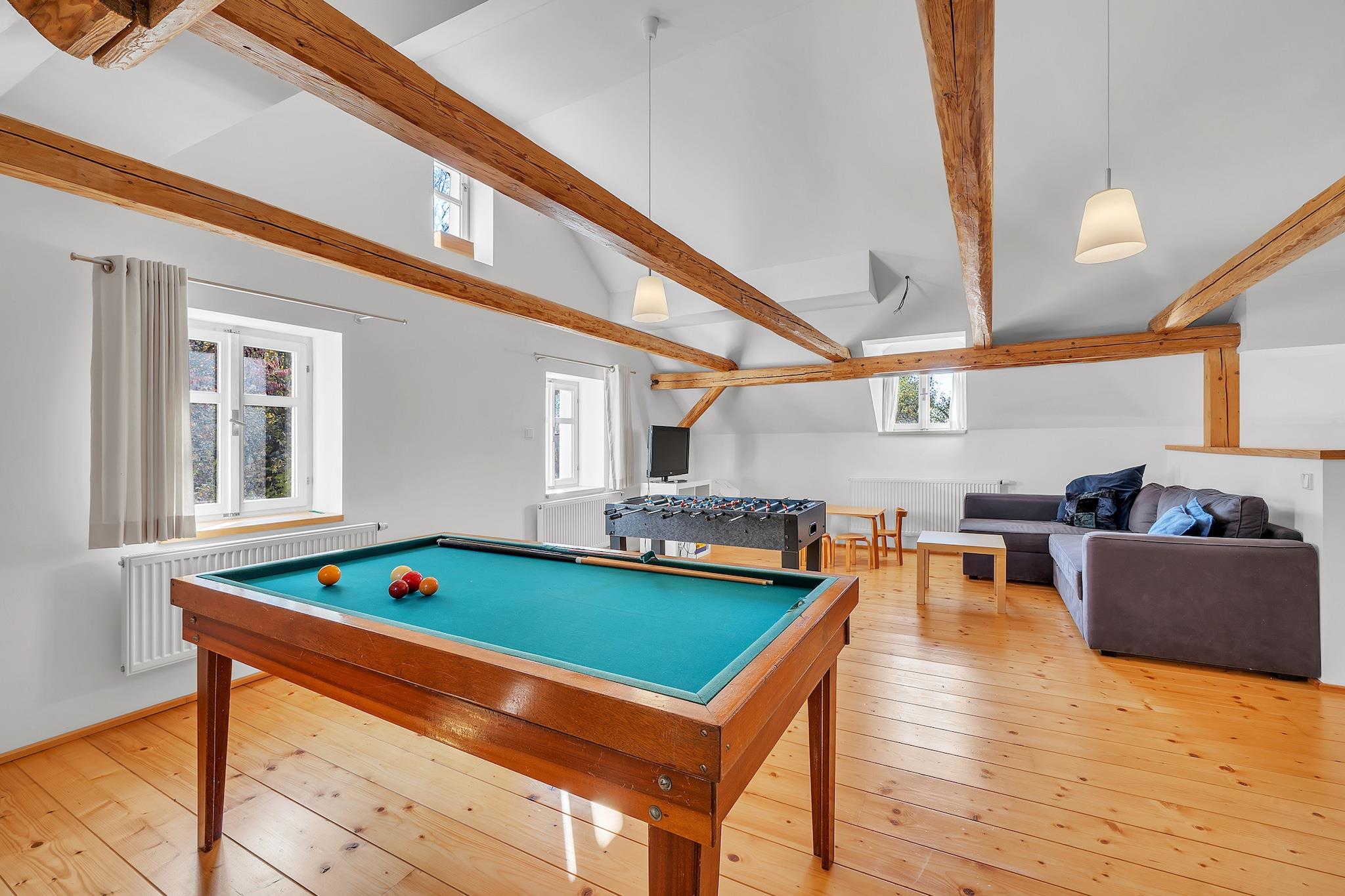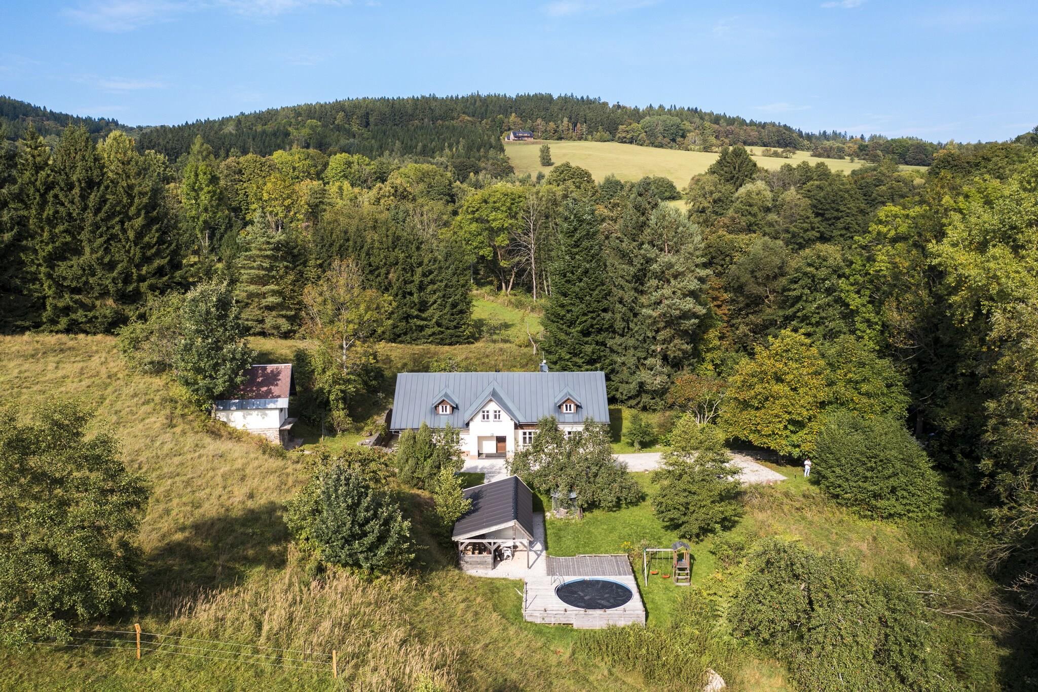 Looking for a modern, fully furnished villa for a large group? This charming white holiday villa, perfect for up to 11 people, offers everything you need for a memorable stay. Nestled in a child-friendly wooded area, it combines modern comfort with a cozy atmosphere, providing the ideal retreat for families and groups alike. The surrounding nature of Mladé Buky is a paradise for outdoor enthusiasts. Hike or take a lift to the top of Snežka, the highest peak in the Giant Mountains, or enjoy the treetop path in Janske Lazne. Families with young children will love the nearby Areal Mladé Buky for tobogganing and playground fun. Visit the nearby zoo with its safari or explore the stunning rock formations of Adrspach. This villa offers endless opportunities for adventure and relaxation in every season. With five bedrooms, three bathrooms, and two toilets, there's ample space for everyone. The fully equipped kitchen makes it easy to prepare delicious meals, featuring a refrigerator, freezer, oven, microwave, dishwasher, coffee maker, and all necessary kitchenware. On sunny days, cool off in the private swimming pool, or relax outdoors on the terrace with garden furniture. As evening falls, gather around a fire pit to enjoy the tranquil surroundings. Indoors, unwind with satellite TV or challenge your group to a game of billiards or foosball in the attic. For added convenience, a washing machine and dryer are available for your use.