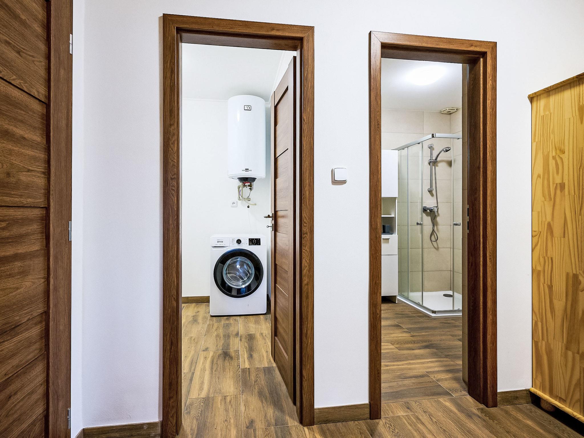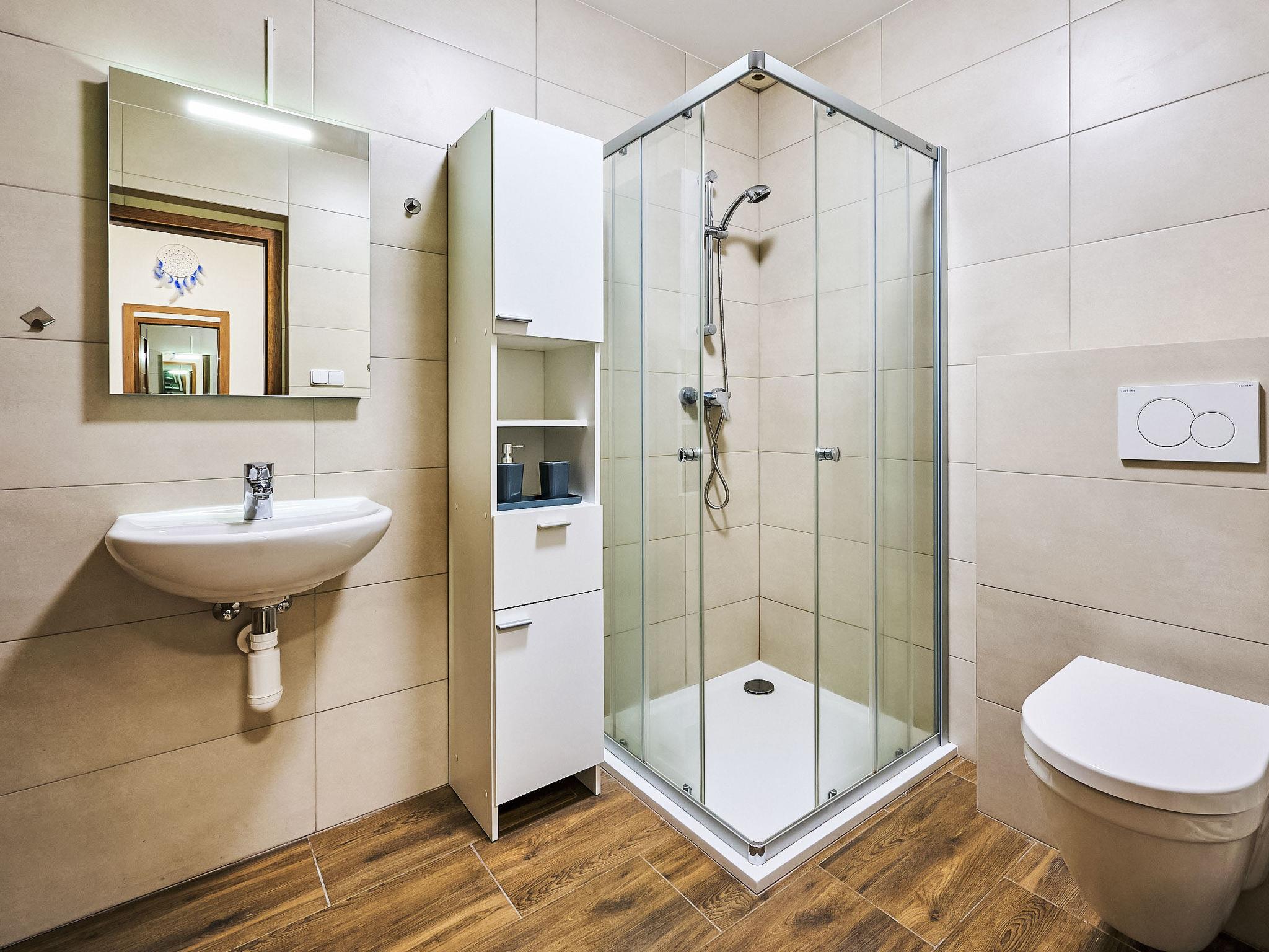 4-room apartment on the ground floor. Modern furnishings: open living room with panoramic window with 1 sofabed and TV. Exit to the terrace. 1 room with 2 beds and 1 x 1 bunk beds. Open living room with 1 sofabed, dining table and TV. Exit to the terrace. 1 room with 3 beds and 1 double bed. Kitchenette (oven, dishwasher, 4 ceramic glass hob hotplates, kettle, microwave, freezer, electric coffee machine) with dining table. 2 showers/WC. Floor heating. Terrace furniture, barbecue. Facilities: washing machine. Internet (WiFi). Please note: suitable for families. Non-smokers only. The house is divided into 2 apartments with a common entrance.
