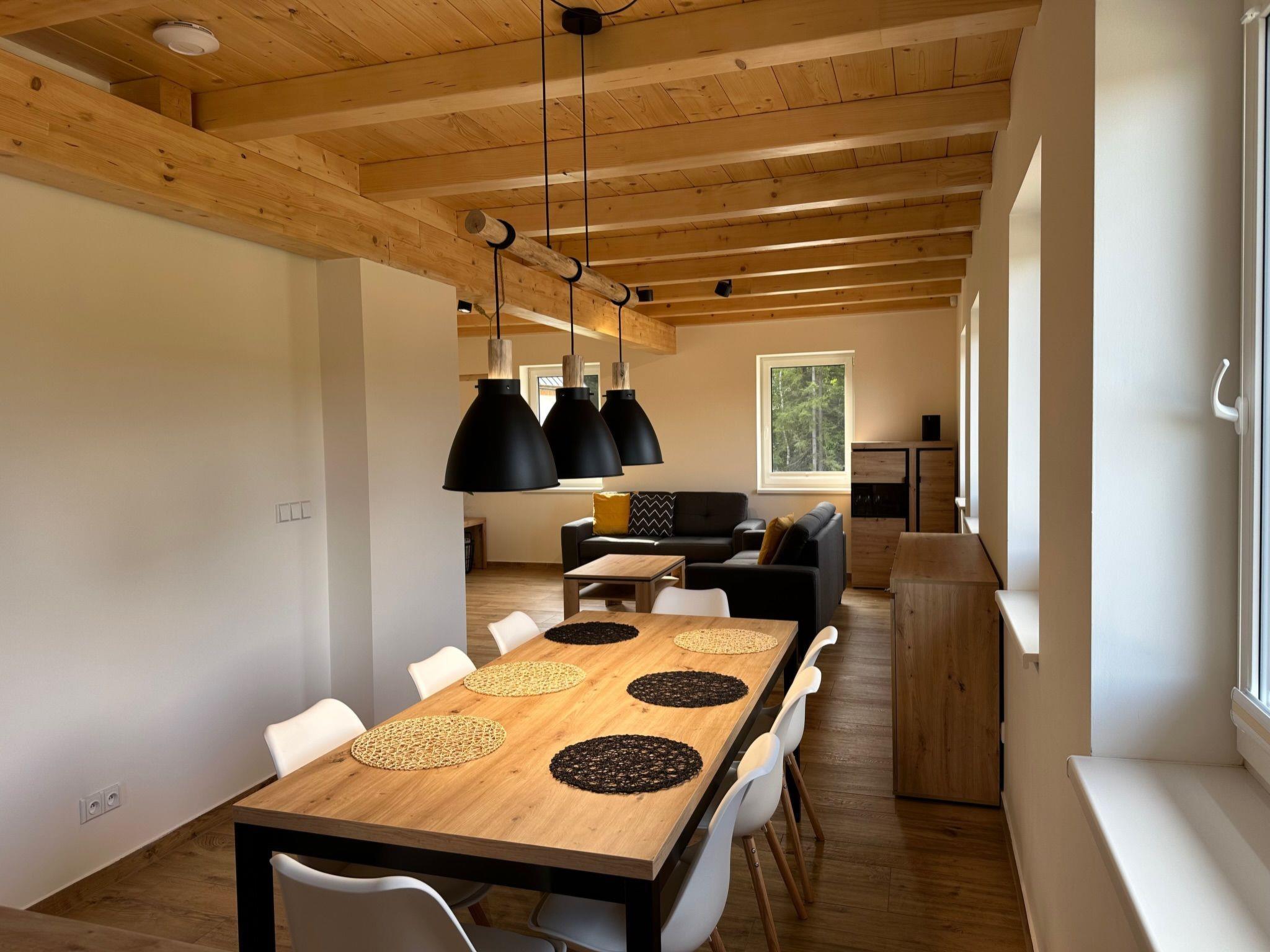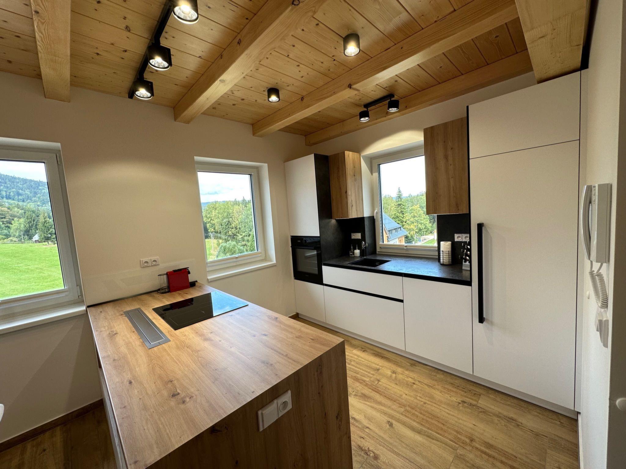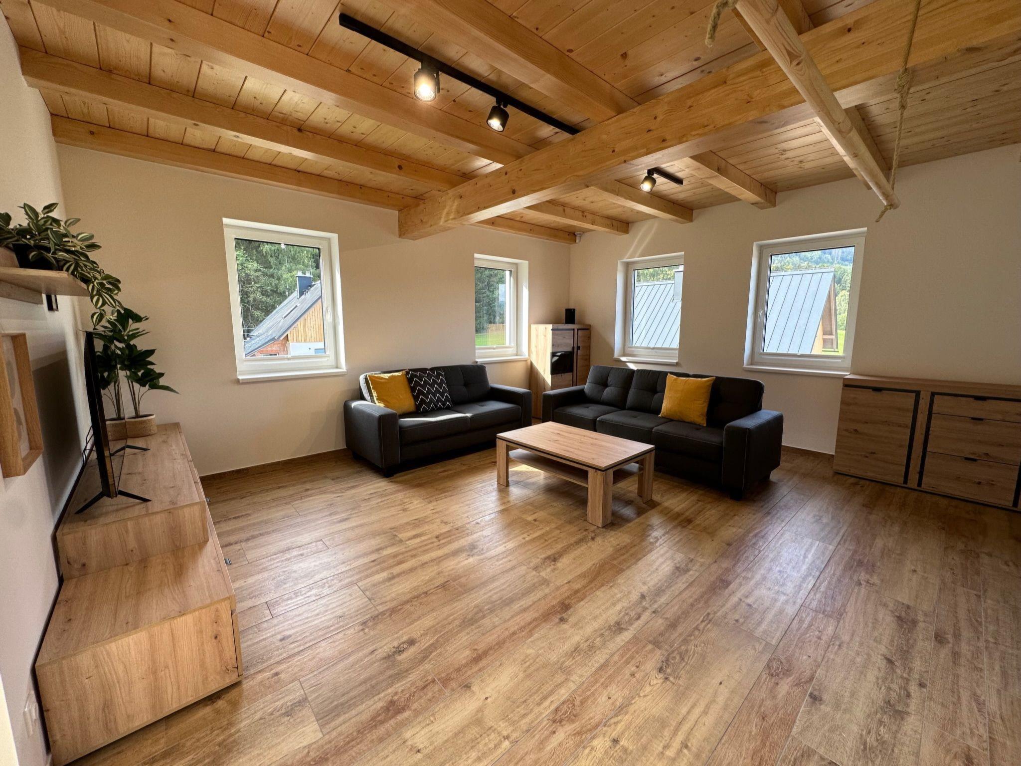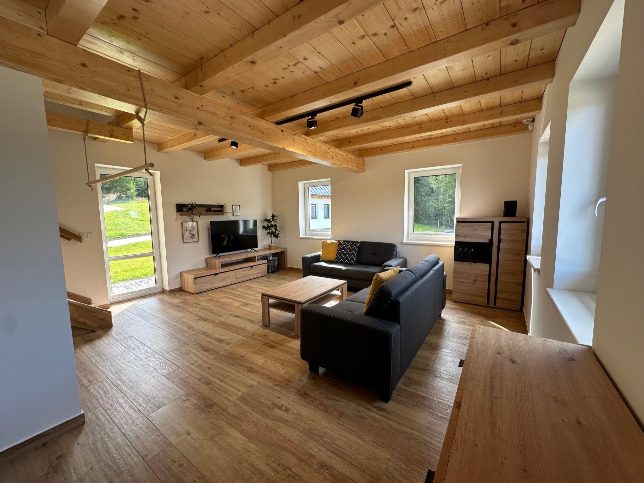 Comfortable cottage, 2 storeys, detached, built in 2023. Outside the resort, along the wooded area, 2 km from the skiing area. Private: property. Terrace. In Winter: please take snow chains. Parking. E-charging station. Shop 2 km, grocery 2.5 km, supermarket 6 km, shopping centre 20 km, restaurant 2 km, bus stop "Jiretín pod Bukovou" 1.4 km, railway station "Jiretín pod Bukovou" 1.3 km, outdoor swimming pool 7 km, indoor swimming pool 20 km. Golf course (9 hole) 17 km, walking paths from the house 10 m, cycle lane 100 m, ski lift 2 km, slopes 2 km, ski rental 2 km, ski school 2 km, cross country ski track 100 m, children's playground 3 km. Nearby attractions: Rozhledna Cerná Studnice 6 km, Muzeum obrnené techniky Smržovka 6 km, Vodopády Jedlové 7 km, Kittelovo muzeum v Krásné 12 km, Aquapark Babylon, IQLandia, ZOO Liberec 22 km, Bozkovské jeskyne 22 km. Well-known ski regions can easily be reached: Tanvaldský Špicák 2 km, Filip Smržovka 4 km, Svetlý Vrch Albrechtice 4 km, Josefuv Dul 7 km, Severák, Bedrichov 12 km. Hiking paths: Hrebenovka.