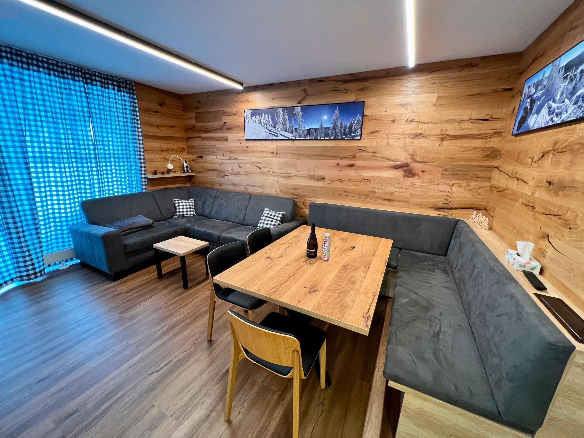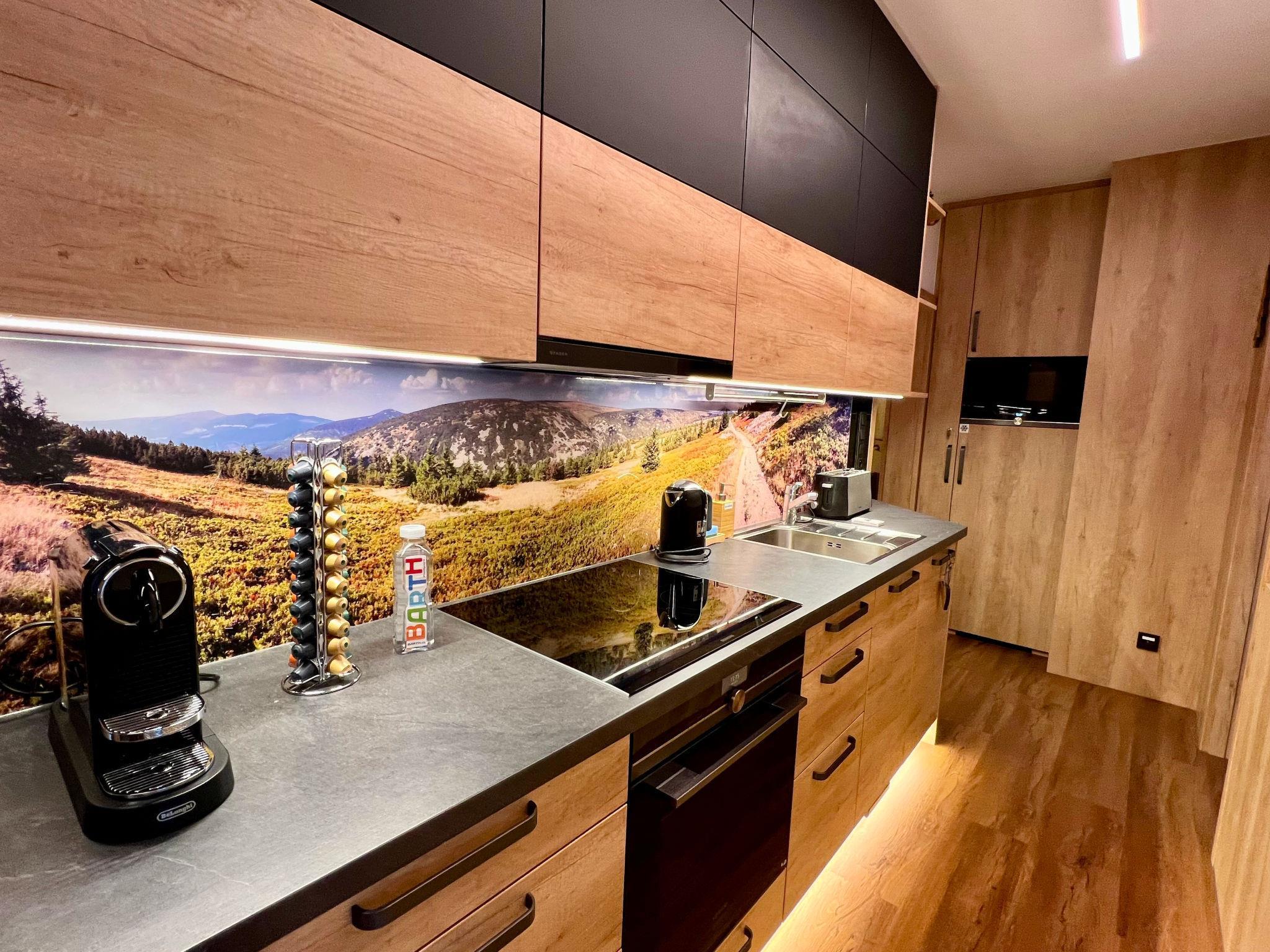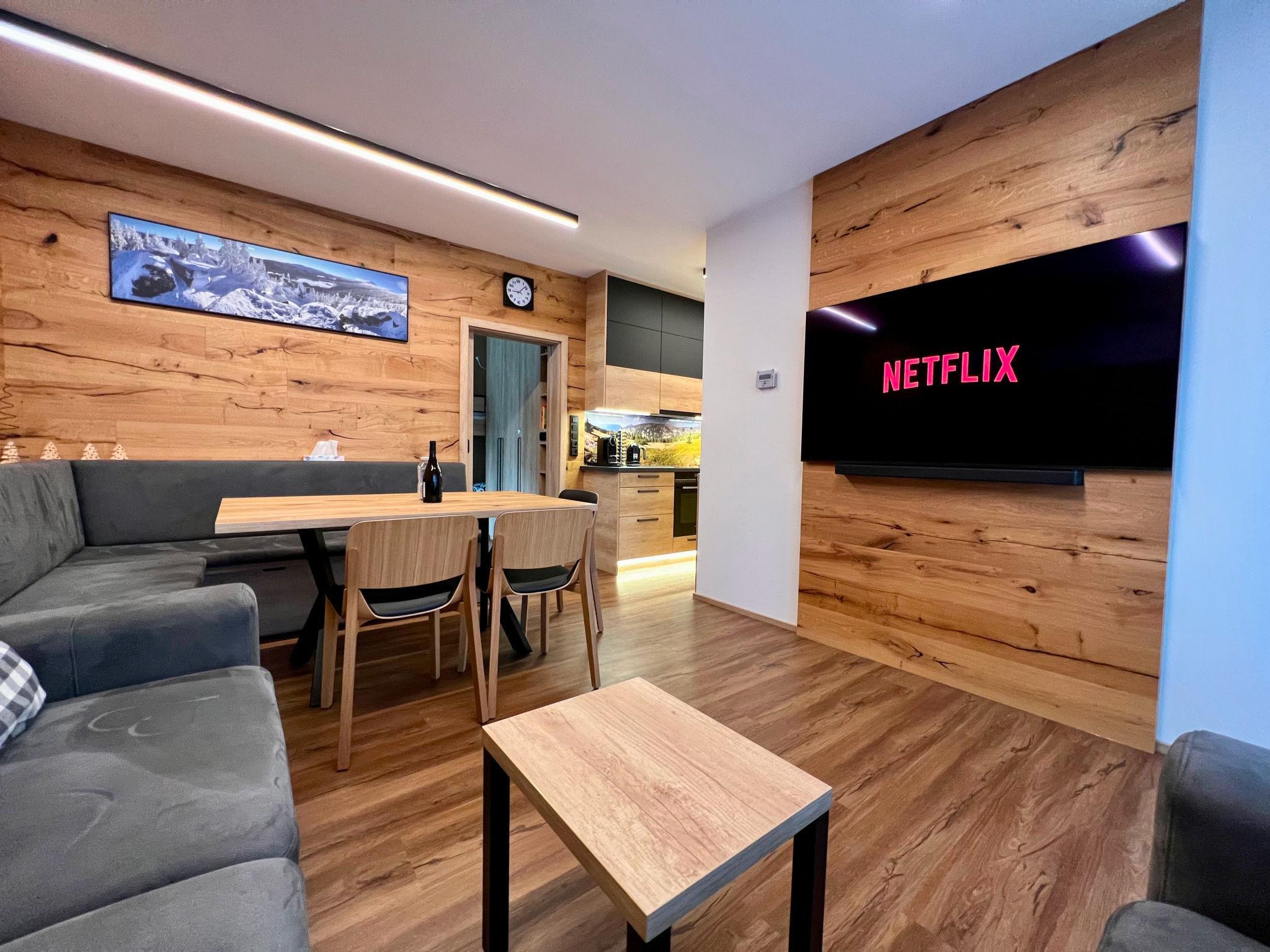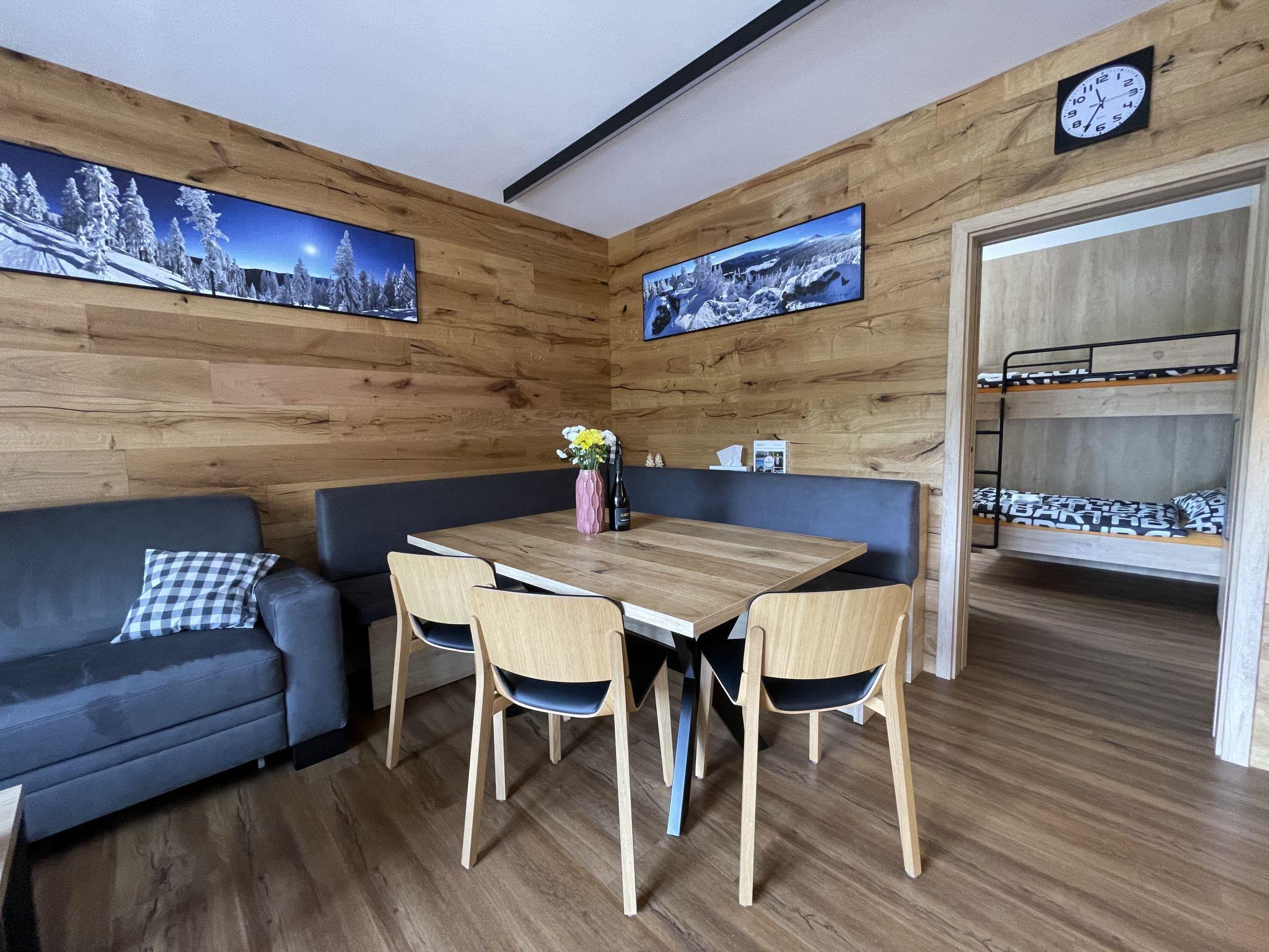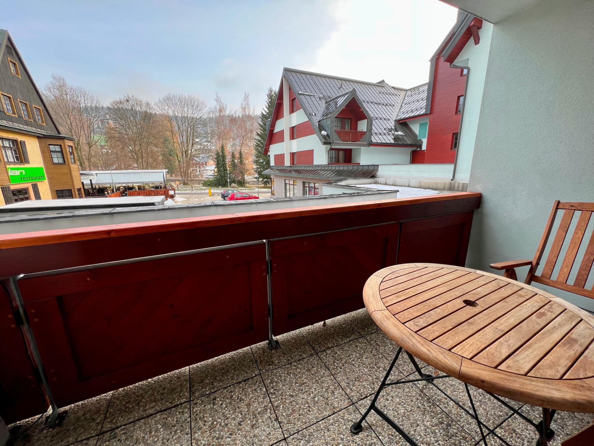 "Špindleruv Mlýn 46", 3-room apartment on 1st floor. Renovated, luxurious furnishings: living/dining room with dining nook and TV. Exit to the balcony. 1 room with 1 double bed and 1 pull-out bed. 1 room with 2 x 2 bunk beds. Kitchenette (oven, dishwasher, 4 ceramic glass hob hotplates, microwave, freezer, electric coffee machine). Shower/WC, sep. WC. 2 balconies. Balcony furniture. View of the countryside. Facilities: Internet (WiFi, free). Parking (roofed). E-charging station. Suitable for families.