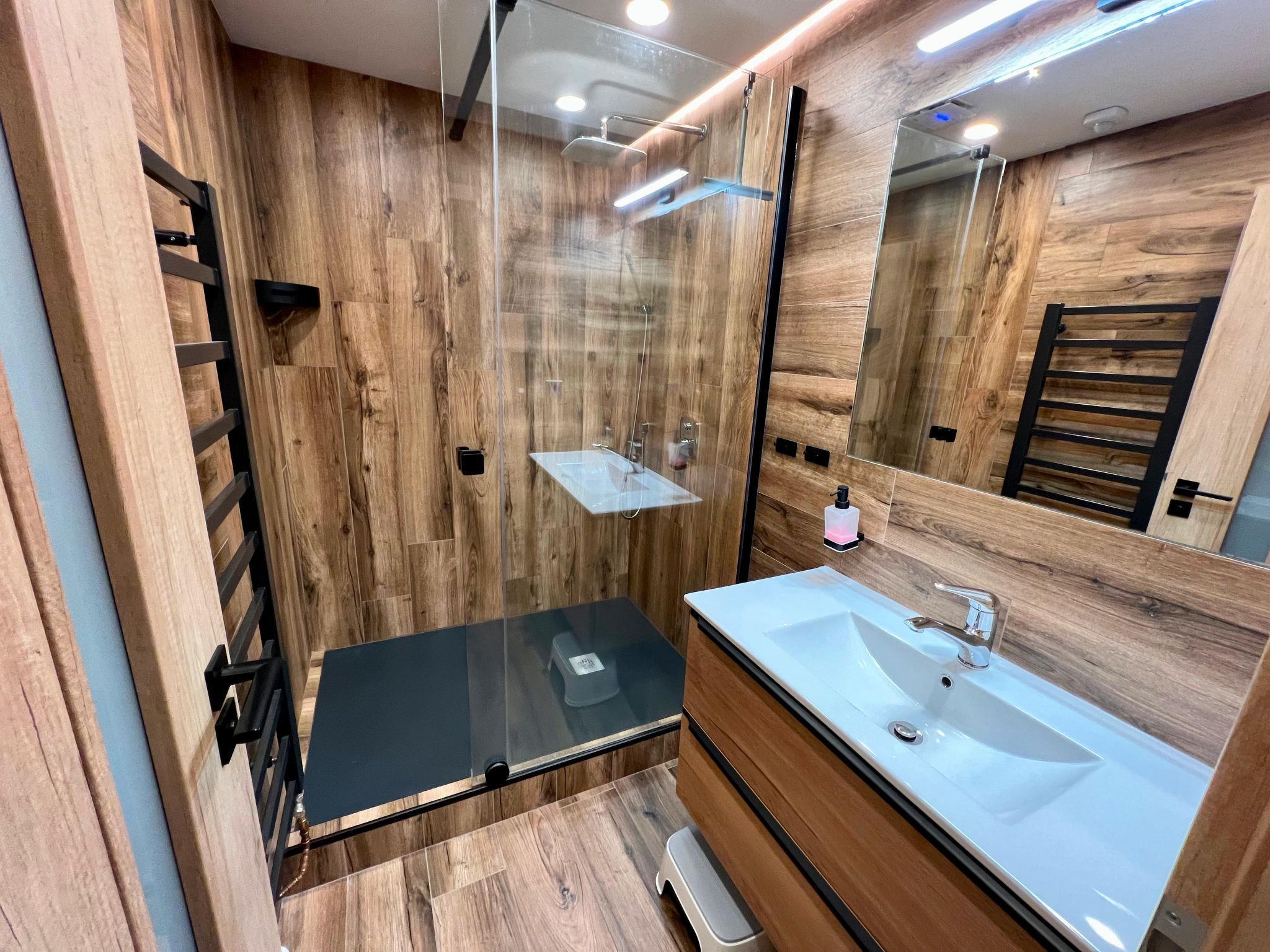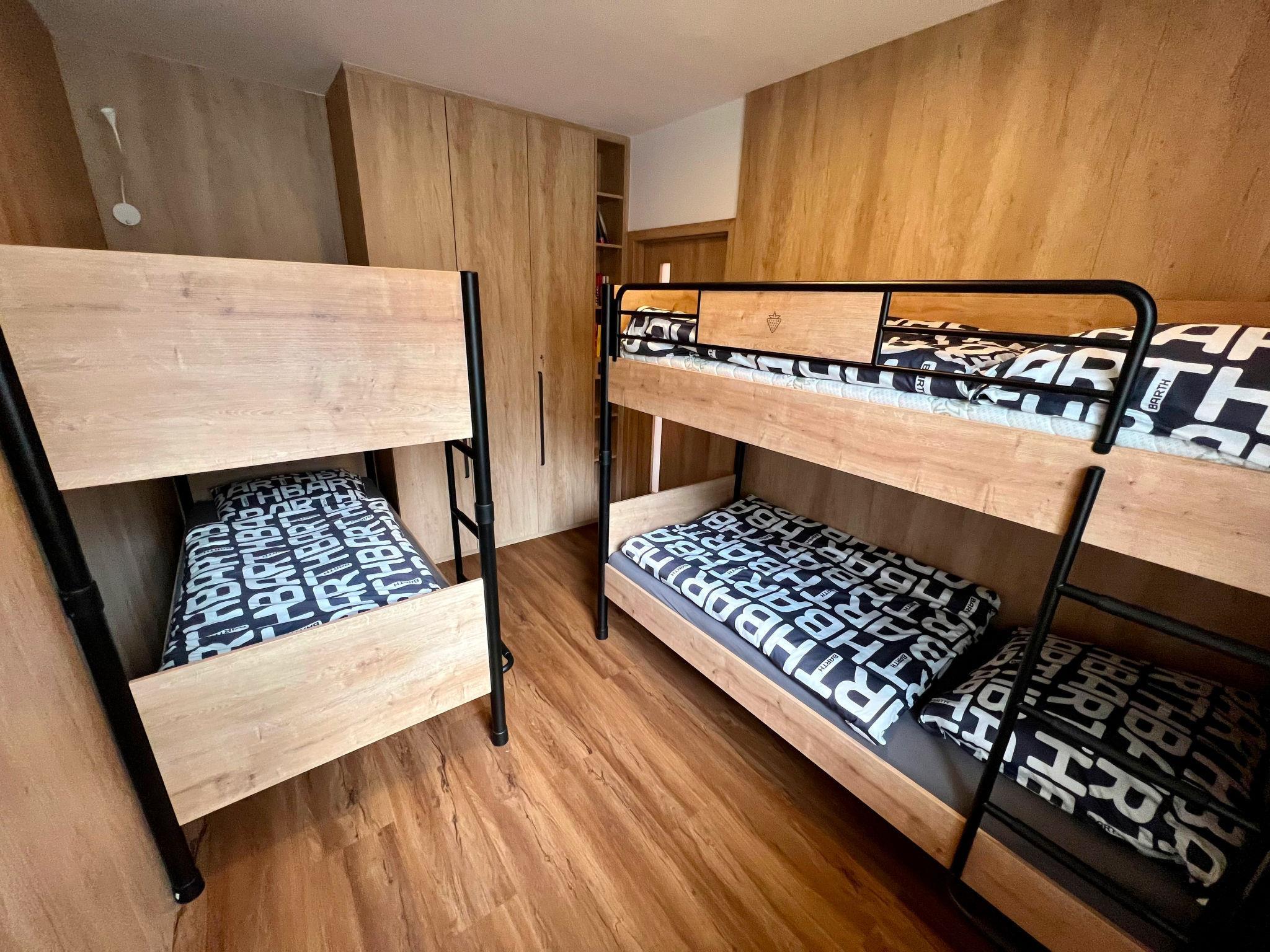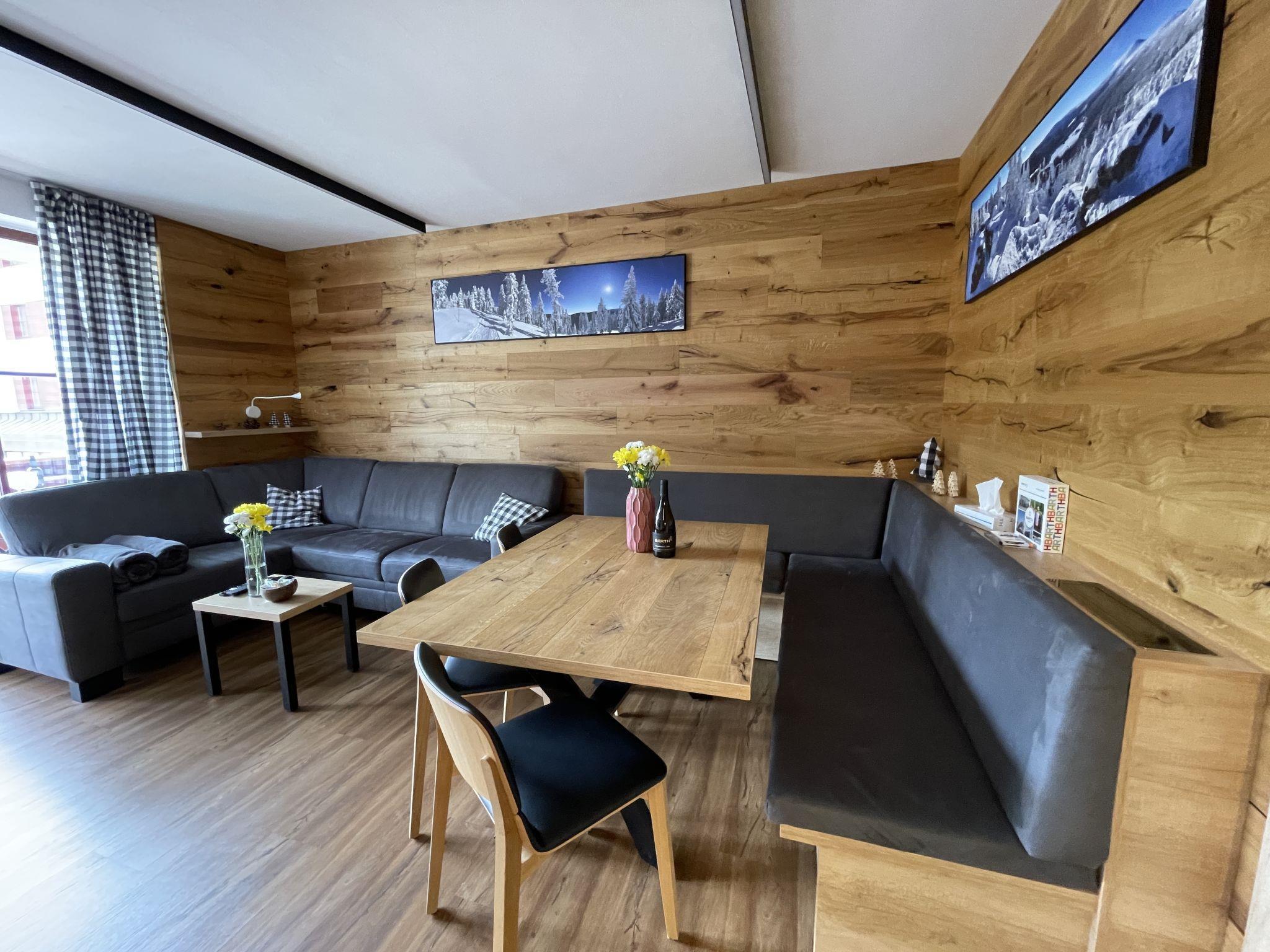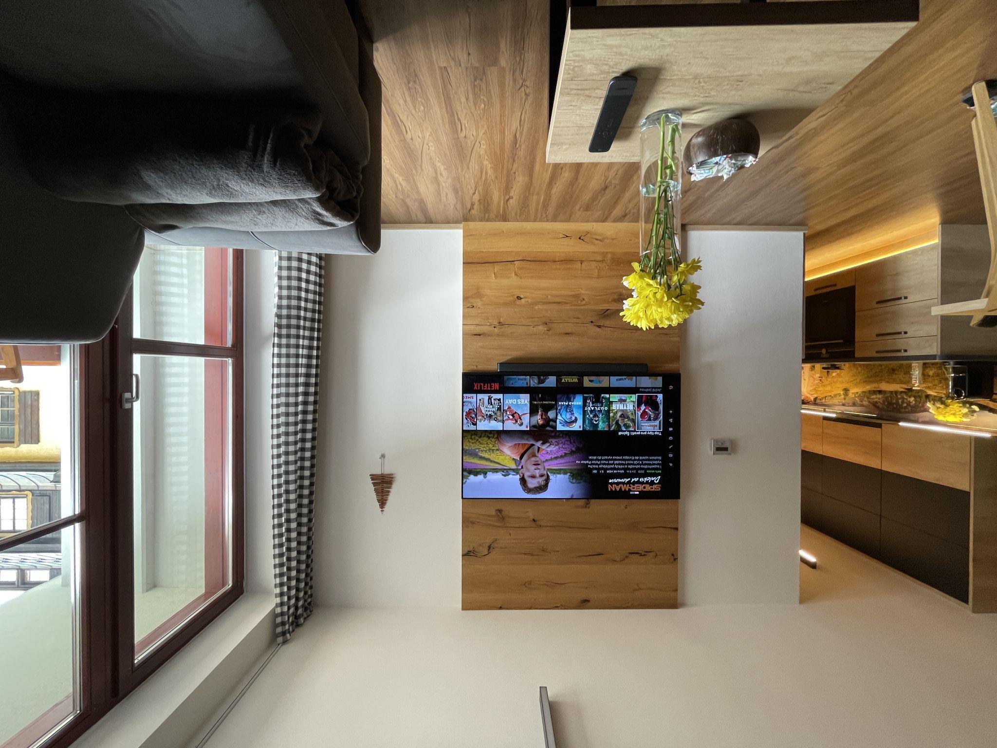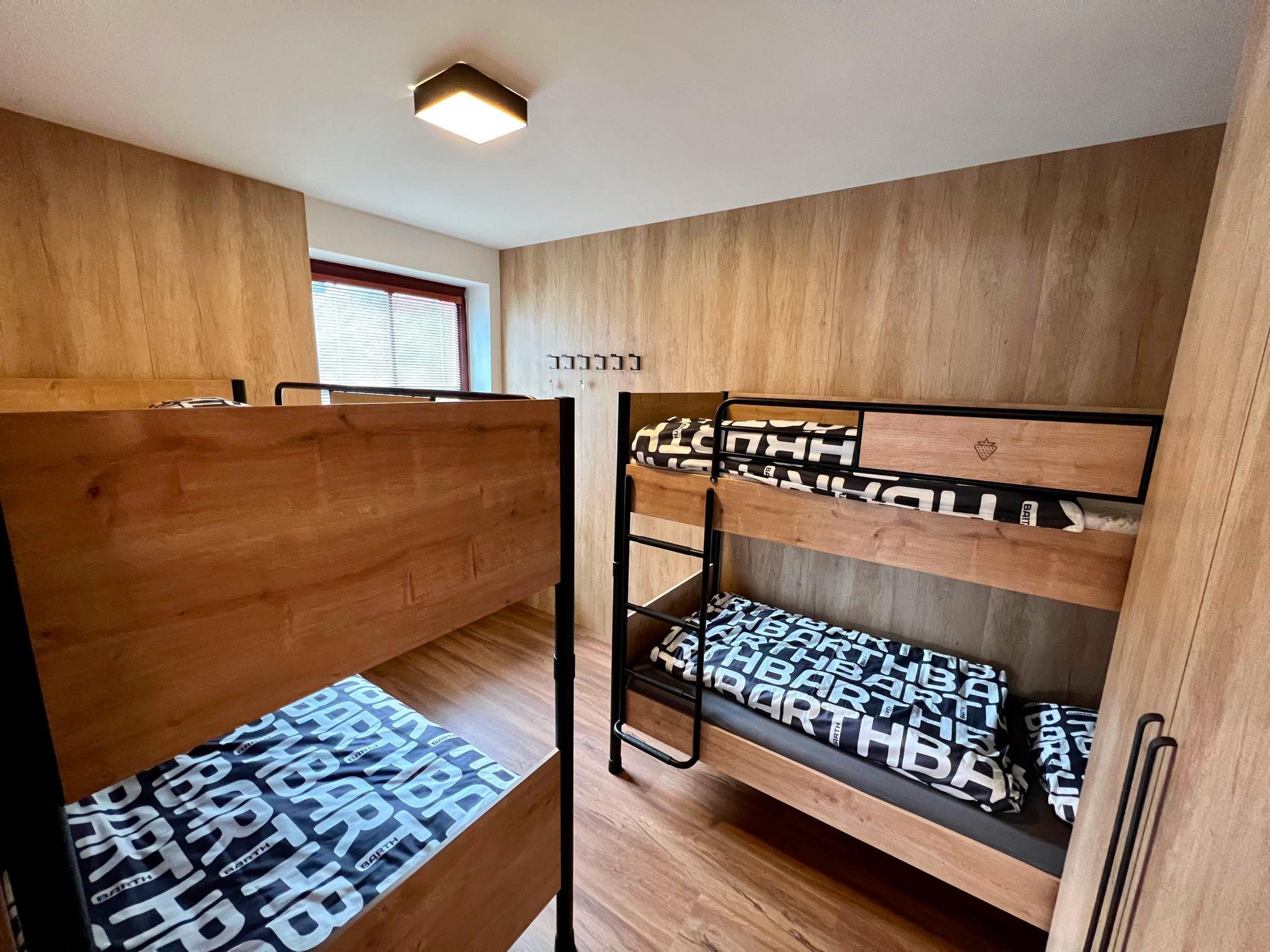 "Špindleruv Mlýn 46", 3-room apartment on 1st floor. Renovated, luxurious furnishings: living/dining room with dining nook and TV. Exit to the balcony. 1 room with 1 double bed and 1 pull-out bed. 1 room with 2 x 2 bunk beds. Kitchenette (oven, dishwasher, 4 ceramic glass hob hotplates, microwave, freezer, electric coffee machine). Shower/WC, sep. WC. 2 balconies. Balcony furniture. View of the countryside. Facilities: Internet (WiFi, free). Parking (roofed). E-charging station. Suitable for families.