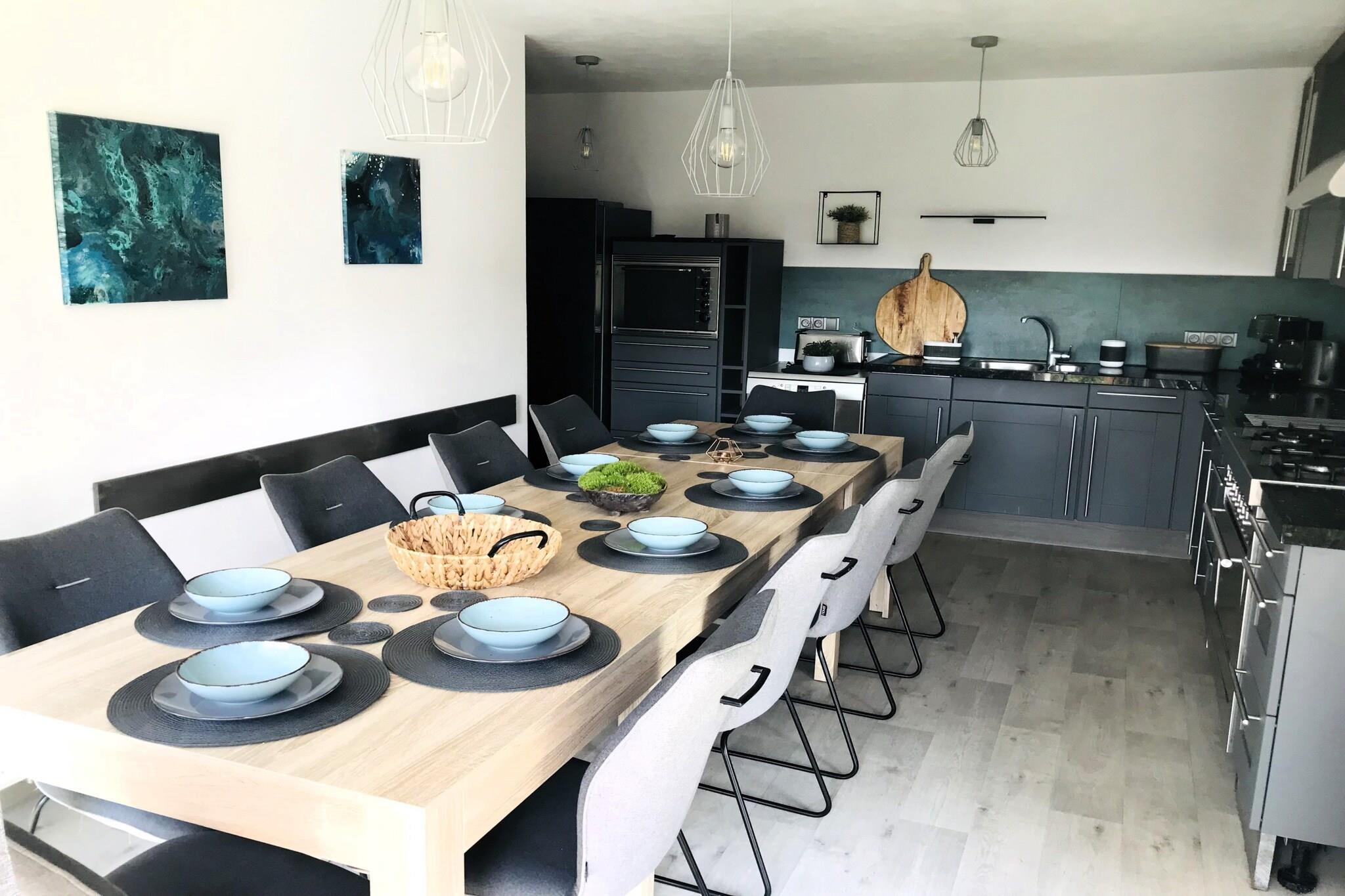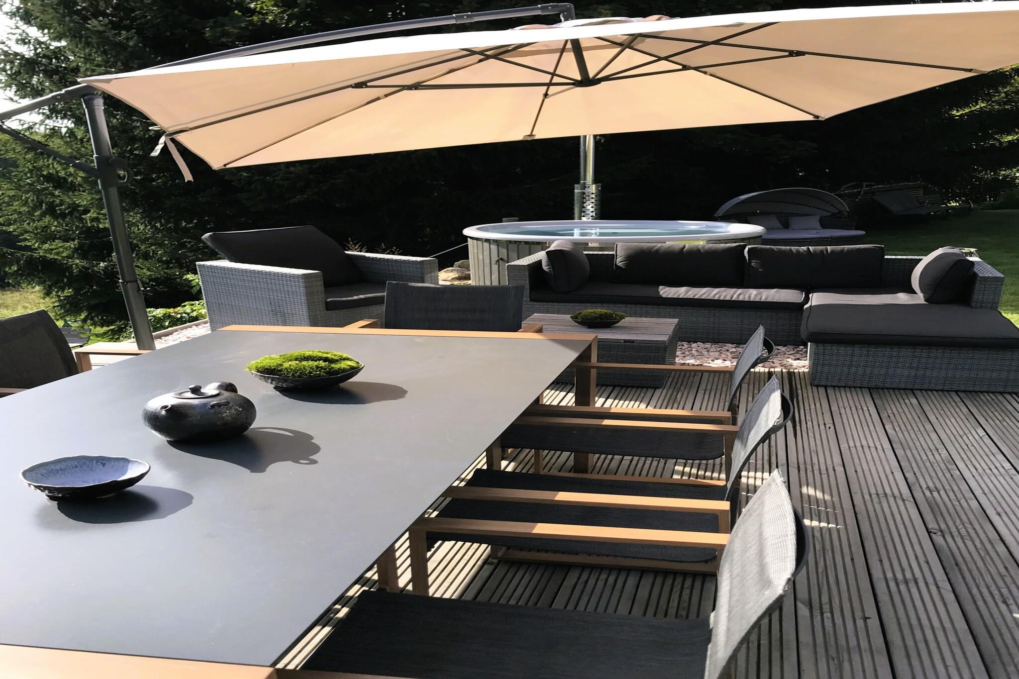 Living room(TV, dining table, fireplace, seating area), Kitchen(electric kettle, toaster, coffee machine, oven, microwave, dishwasher, fridge, freezer, dishes and cutlery), bedroom(double bed), bedroom(single sofa bed, double bed), bedroom(single sofa bed, double bed), bedroom(single bed, single bed, double bed), bedroom(double bed), bedroom(double bed, double bed), bathroom(shower, washbasin, toilet), bathroom(shower, washbasin, toilet), bathroom(shower, washbasin, toilet), toilet(toilet), toilet(toilet), toilet(toilet), relaxation area(sauna), ski storage, Internet access, Bubble bath, hot tub, terrace(100 m2), garden, garden furniture, BBQ, swimming pool(private, outside, heated), table tennis table