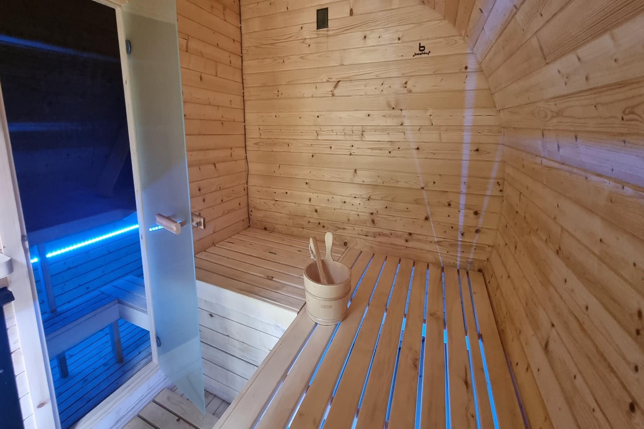 Ground floor: (hall, open kitchen(stove, hob(ceramic, electric), hood, coffee machine, dishwasher, fridge-freezer), Living/diningroom(dining table(11 persons), fireplace, seating area), bathroom(bathtub with shower, washbasin), toilet(toilet)) On the 1st floor: (bedroom(double bed, TV), Bedroom with bathroom(5x single bed, TV, bath tub, washbasin, toilet), Bedroom with bathroom(2x single bed, double bed, shower, washbasin, toilet), walk-through room(children's bed)) carport, bunk bed, streamingservice, bathtub or shower, hot tub, steam shower, sauna(paid), terrace(private, roofed, 10 m2), terrace(roofed, 10 m2), garden(fenced, > 1000 m2), bicycle storage, garden furniture, sun loungers, BBQ, parking, trampoline, outdoor fireplace, Alarm