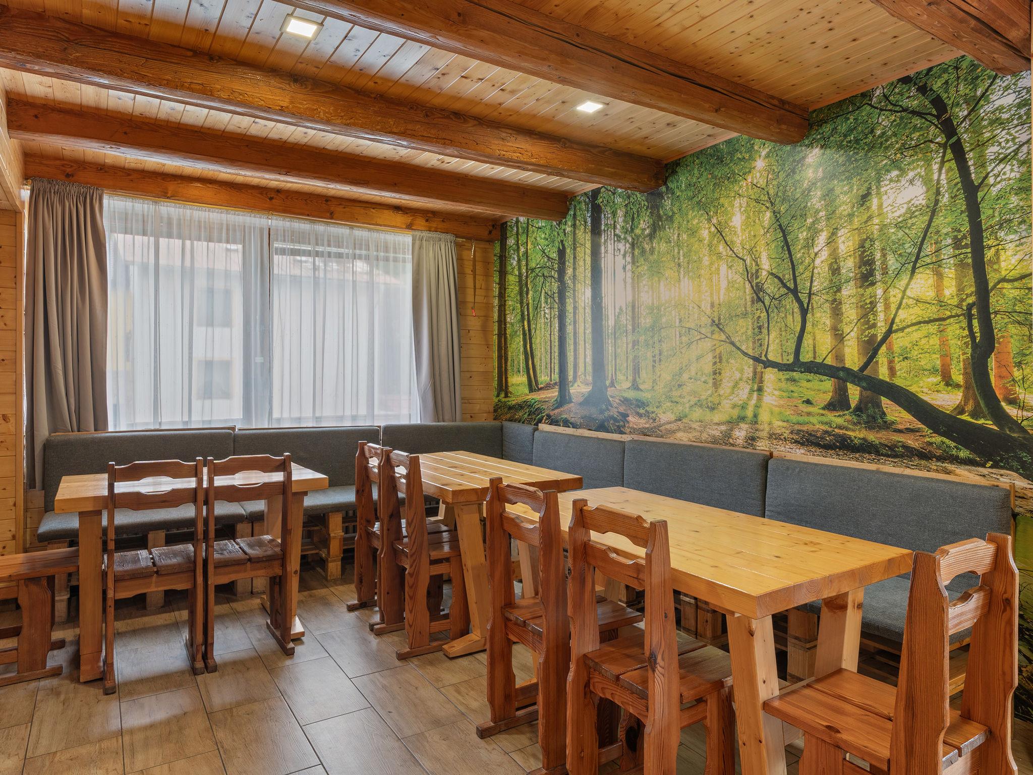 8-room chalet on 3 levels. Spacious, beautiful and wooden furniture furnishings: open large living/dining room with open-hearth fireplace, dining nook, bar and cable TV. Large kitchen (dishwasher, Gas stove, 5 gas rings, kettle, microwave, grill, electric coffee machine). Sep. WC. Upper floor: 1 room with 1 x 2 bunk beds, 1 double bed and shower/WC. 1 room with 1 double bed and 1 pull-out bed (2 pers.), shower/WC. 1 room with 1 double bed. Shower/WC. Top floor: 1 room with 1 double bed. 1 room with 8 beds. 1 small room with 1 double bed. 1 children's room with 4 beds. Large terrace. Terrace furniture, barbecue. Facilities: Internet (WiFi, free). Suitable for families. Maximum 1 pet/ dog allowed. At disposal: beer tap (possibility to arrange beer barrels).