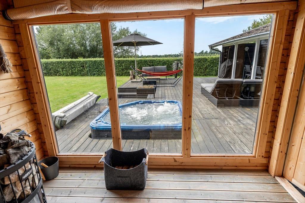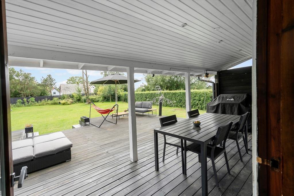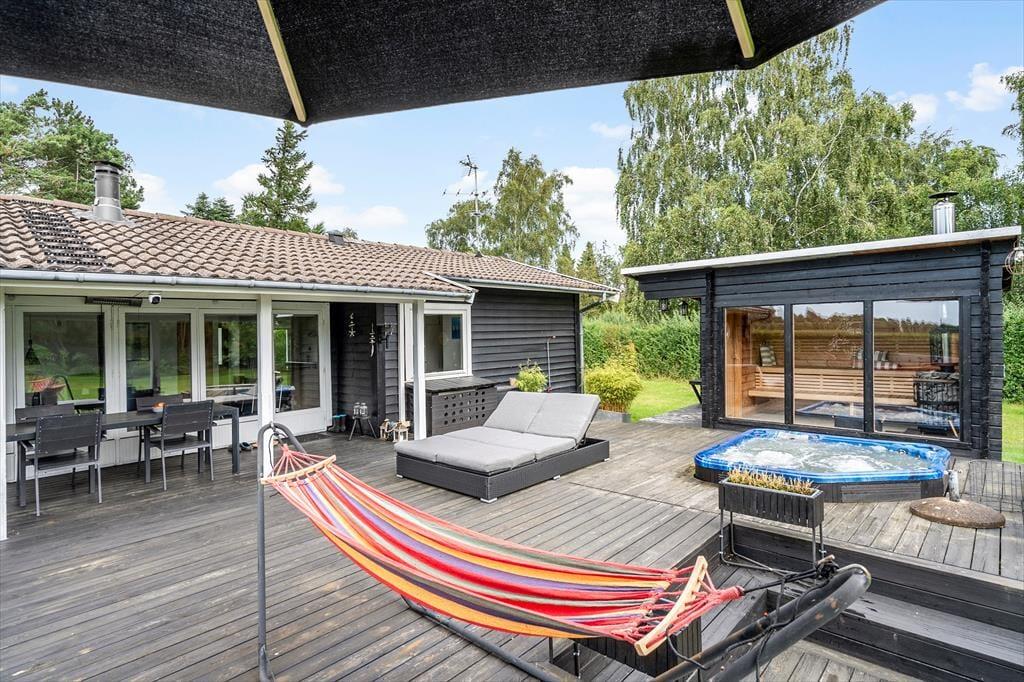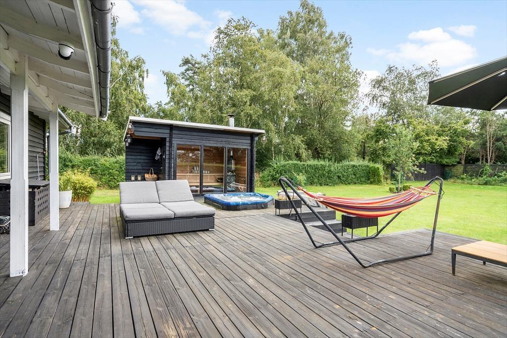 Hier befindet sich eine große, schöne Holzterrasse mit Gartenmöbeln, die teilweise überdacht ist und vom Wohnzimmer aus zugänglich ist. Auf der Terrasse befindet sich ein eingelassener Whirlpool, in dem Sie abends sitzen, die Sterne beobachten und die Ruhe genießen können. Es gibt einen großen Garten, in dem die Kinder herumtollen können, und alles lädt dazu ein, die warmen Tage und lauen Abende auf der Terrasse zu genießen. Im Garten befindet sich ein Anbau mit einer neuen Sauna, und nach einem Strandausflug können Sie den Sand unter der Außendusche abspülen.