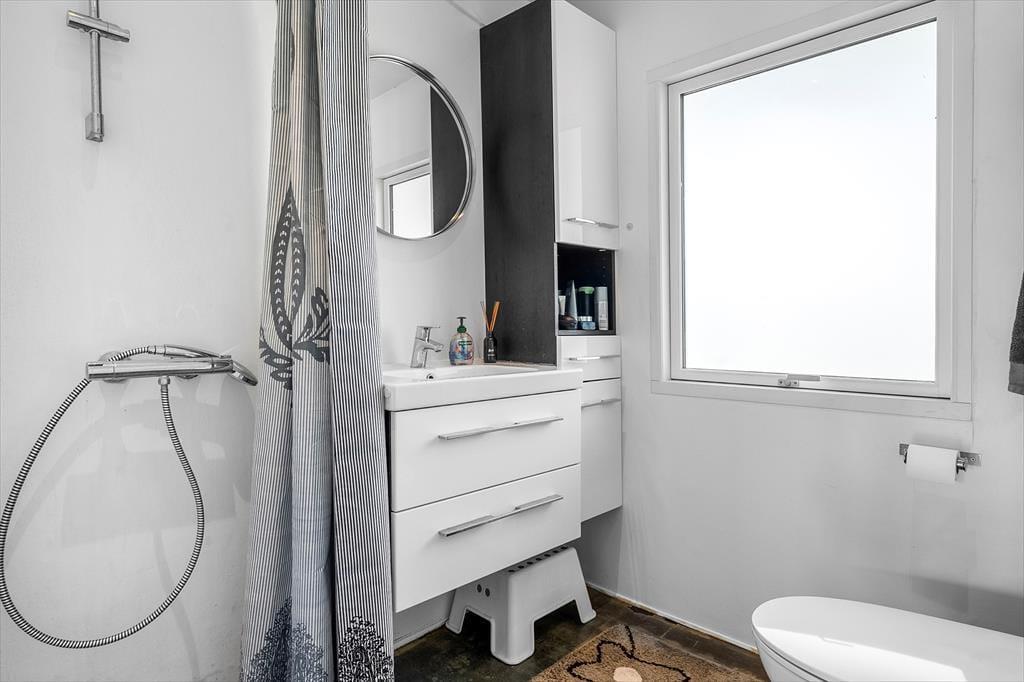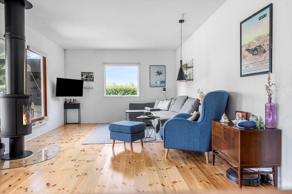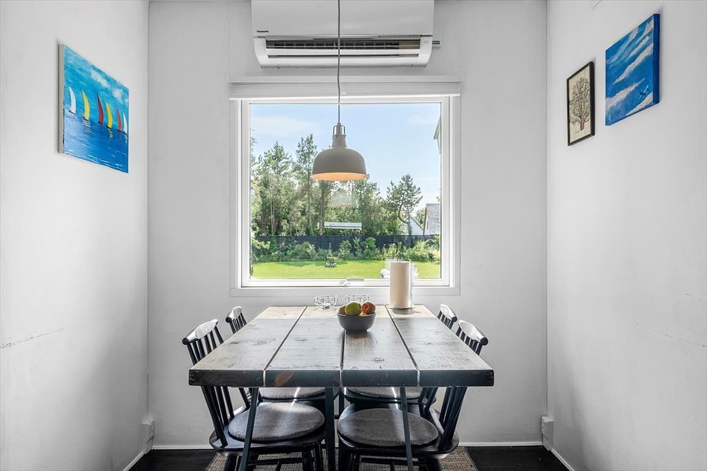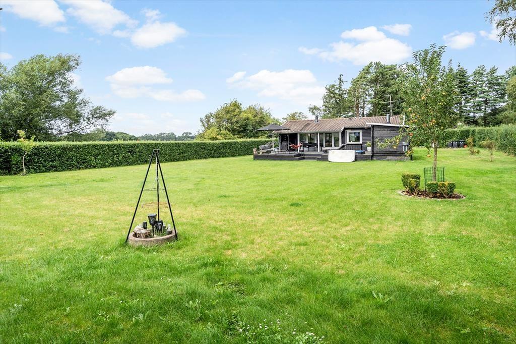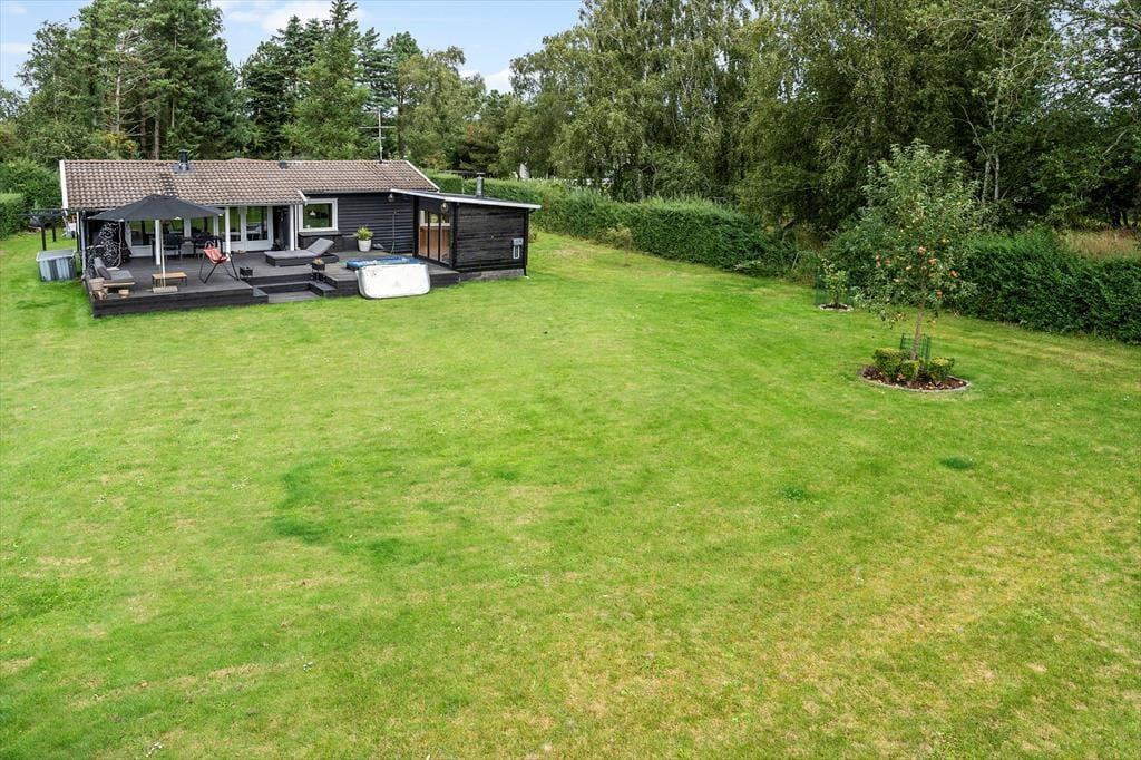 Hier befindet sich eine große, schöne Holzterrasse mit Gartenmöbeln, die teilweise überdacht ist und vom Wohnzimmer aus zugänglich ist. Auf der Terrasse befindet sich ein eingelassener Whirlpool, in dem Sie abends sitzen, die Sterne beobachten und die Ruhe genießen können. Es gibt einen großen Garten, in dem die Kinder herumtollen können, und alles lädt dazu ein, die warmen Tage und lauen Abende auf der Terrasse zu genießen. Im Garten befindet sich ein Anbau mit einer neuen Sauna, und nach einem Strandausflug können Sie den Sand unter der Außendusche abspülen.