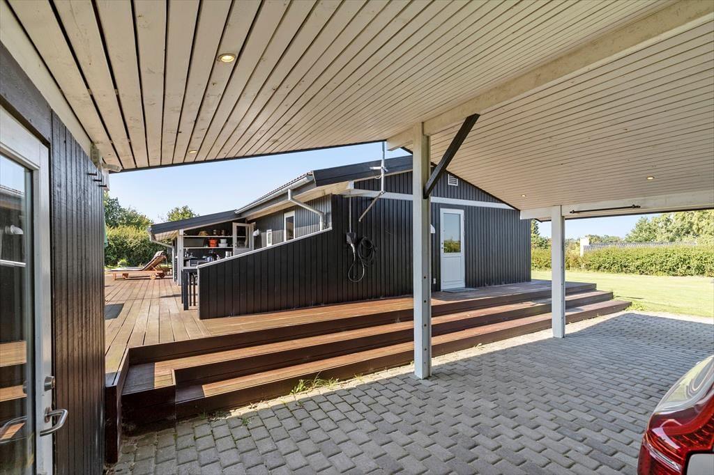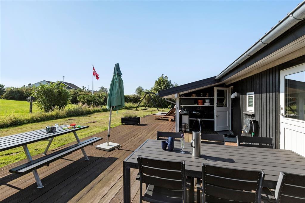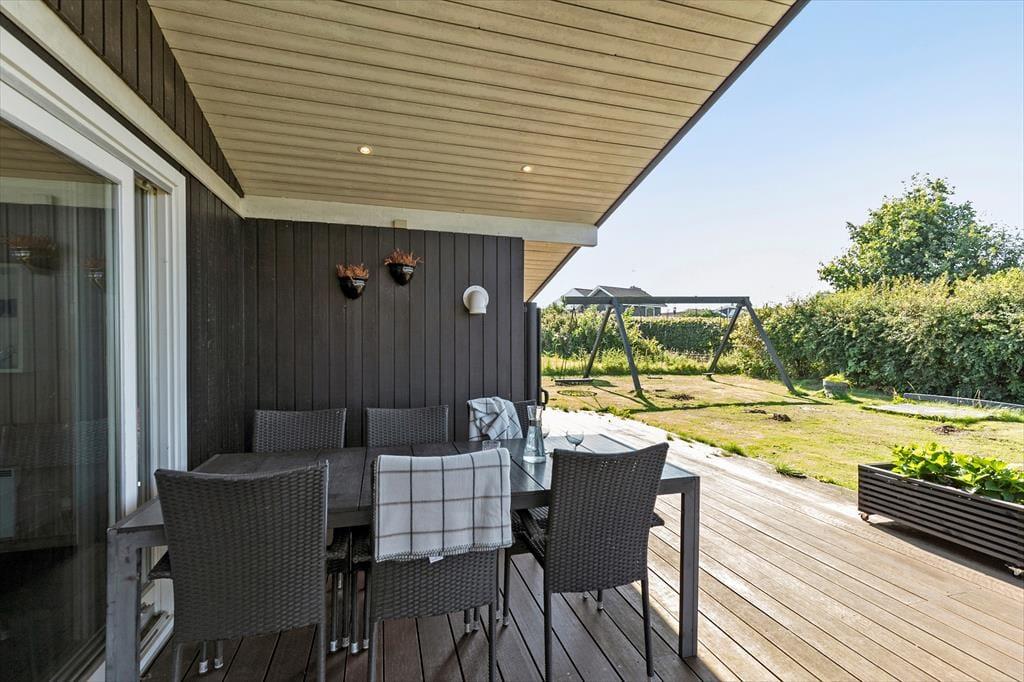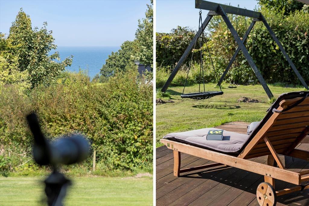 Wenn du das große, hoch gelegene Grundstück betrittst, spürst du sofort, dass sich die Welt hier langsamer dreht. Du parkst dein Auto im Carport, der nicht nur vor Sonne und Regen schützt, sondern auch die Möglichkeit bietet, dein Elektroauto aufzuladen. Dies macht deine Ankunft besonders komfortabel – vor allem, wenn du mit vollen Tüten vom Einkauf zurückkehrst. Du kannst das Meer erahnen, das nur 700 Meter entfernt liegt. Rund um das Haus erstreckt sich eine große Holzterrasse, die zum Entspannen und zu gemütlichen Grillabenden einlädt. Hier ist Platz für alles – von einem Liegestuhl in der Ecke, in dem du den Morgenkaffee genießen kannst, bis zu einem großen Tisch, an dem die Familie zu den Mahlzeiten zusammenkommt. Die Kinder laufen auf den Rasen, wo sie Schaukeln und einen Sandkasten entdecken. Ihr Lachen erfüllt die Luft, während sie ungestört spielen und du lächelst bei dem Gedanken an all die Stunden voller Spiel und Spaß. Die Terrasse gibt dir die Möglichkeit, sie im Auge zu behalten, während du selbst einen ruhigen Moment in der Sonne genießt.