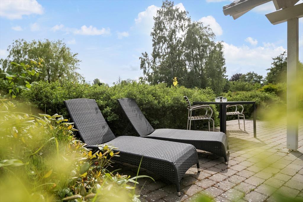 Sie wohnen auf einem 1.171 m² großen Grundstück. Ans Haus schmiegen sich zwei Terrassen mit Gartenmöbeln und Liegestühlen.